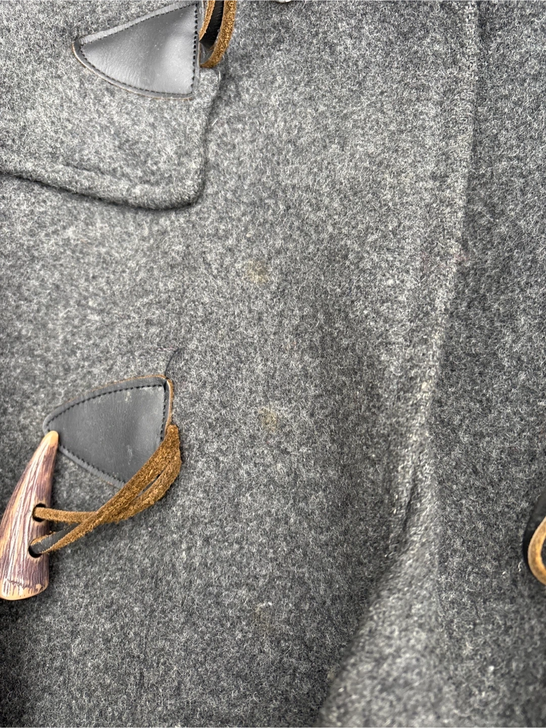 ワンアンドワンの濃いグレーのダッフルコートです。 ウール70%他ポリエステルなどです。 メンズコートですがレディースとしても大きめに着用できます。 日本製 最後の写真、追加しましたが前の部分にシミがありました。軽く洗えばキレイになると思いますが大幅値下げいたします。 【情報】 ブランド:ワンアンドワン サイズ:M ご覧頂きありがとうございます。