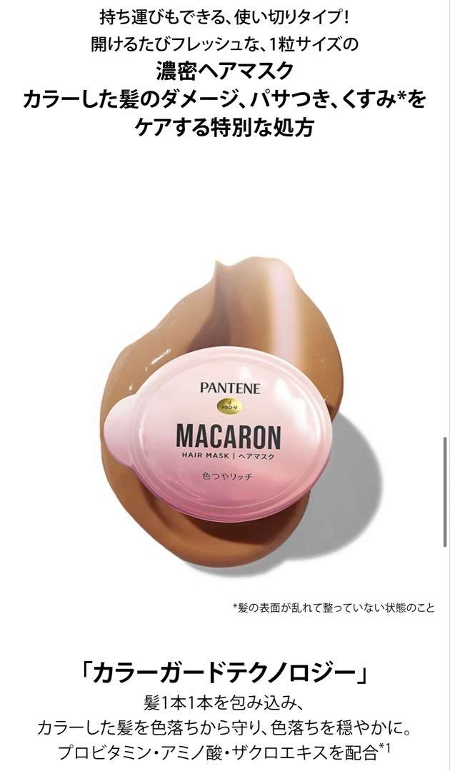 カラーガードテクノロジーで色持ちをサポートする甘く華やかな香りのヘアマスクです。 - ブランド: PANTENE - 商品名: MACARON ヘアマスク - 特長: カラーガードテクノロジーによる色持ち効果 - 香り: 甘く華やかな香り - 使用方法: 持ち運び可能なリフィルタイプ - 成分: ヒスチジン、ザクロ果実エキス配合 - サイズ: 1個分の濃密ヘアマスク 箱から出してしまっていますが使っていません。 ご希望の方はお気軽にご連絡ください。