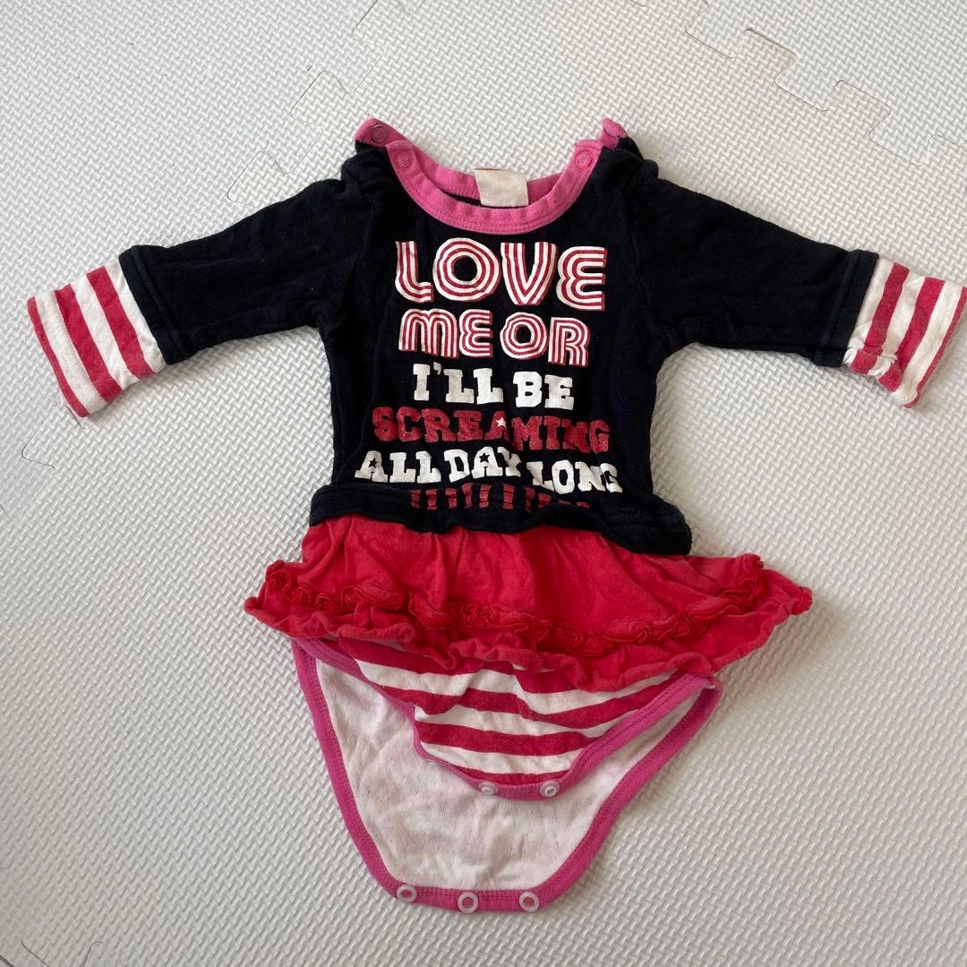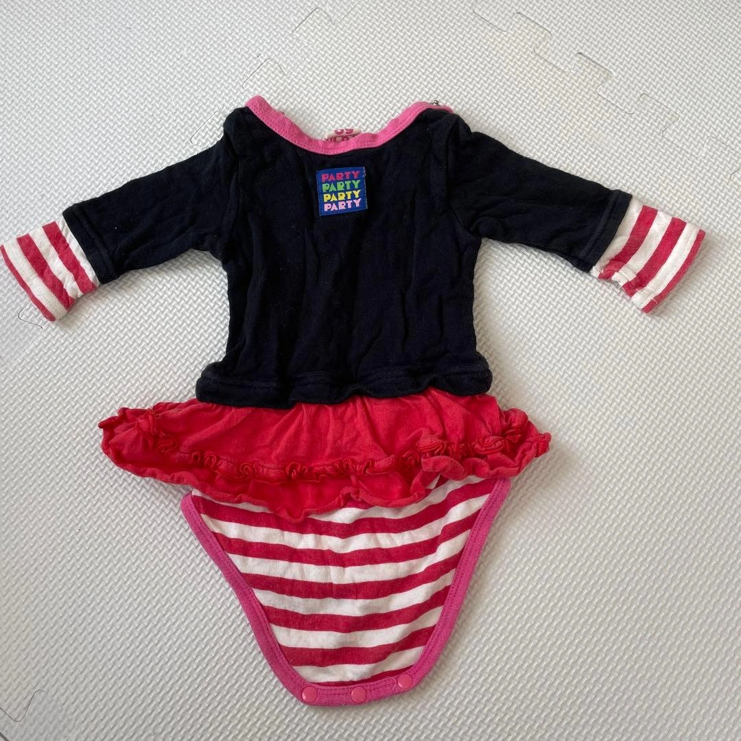 メッセージプリントとフリルが特徴のロンパースです。 - ブランド: Party Party - 色: 黒/赤/白 - デザイン: メッセージプリント付きロンパース - 袖のスタイル: 長袖 - スカート部分: フリル付き - サイズ: 95cm以下 長女が数回着用しました。 袖口にやや色褪せがありますが、汚れなどはなくきれいめだと思います。 ※子どもの着用した中古品にご理解いただける方へ