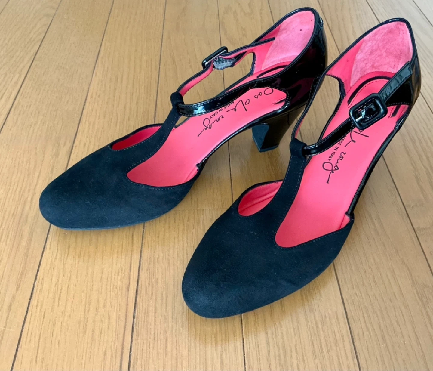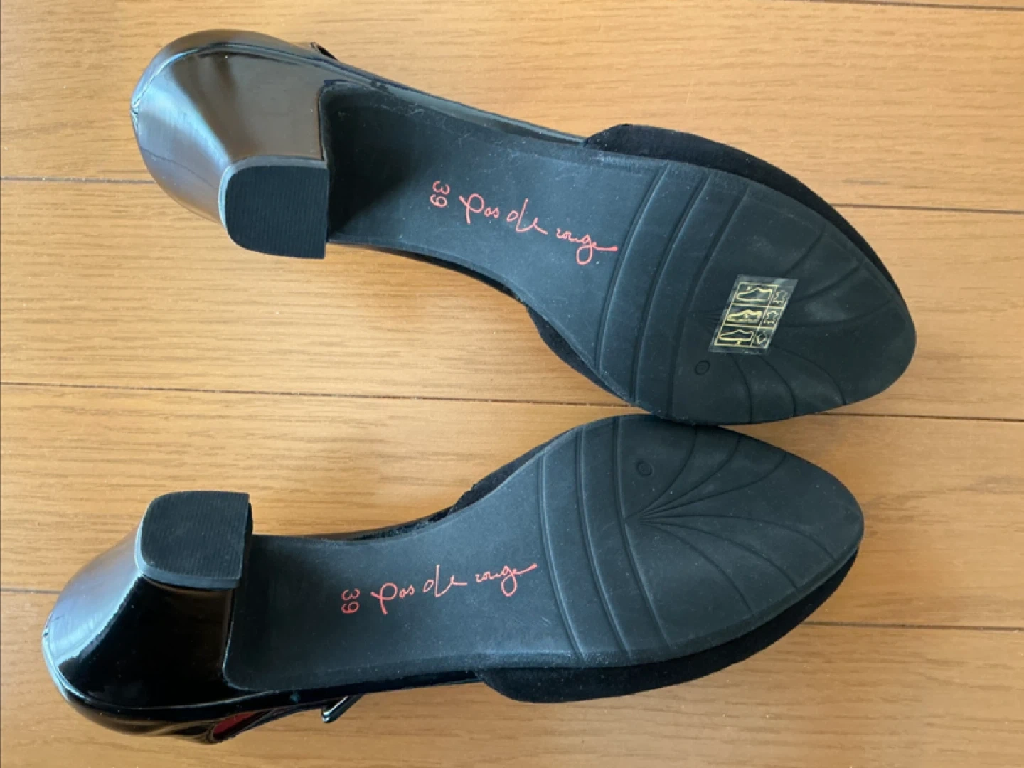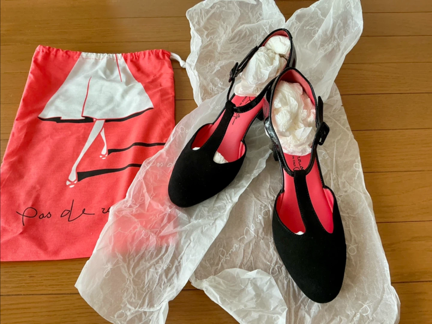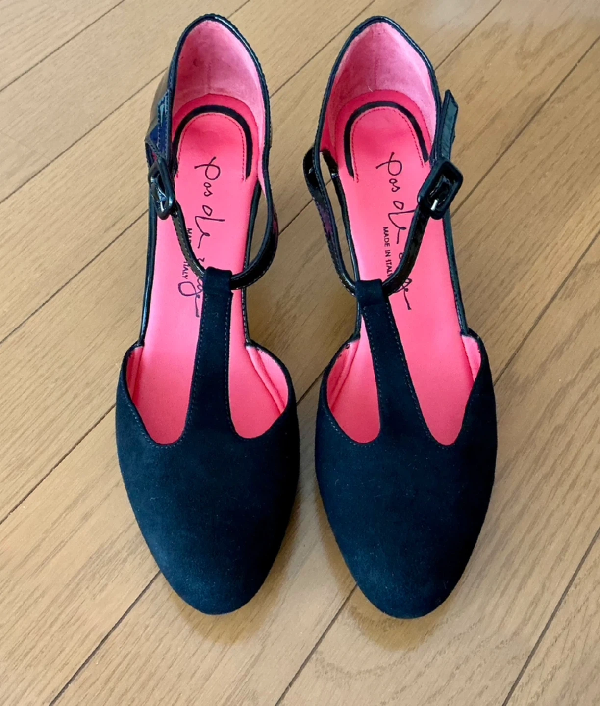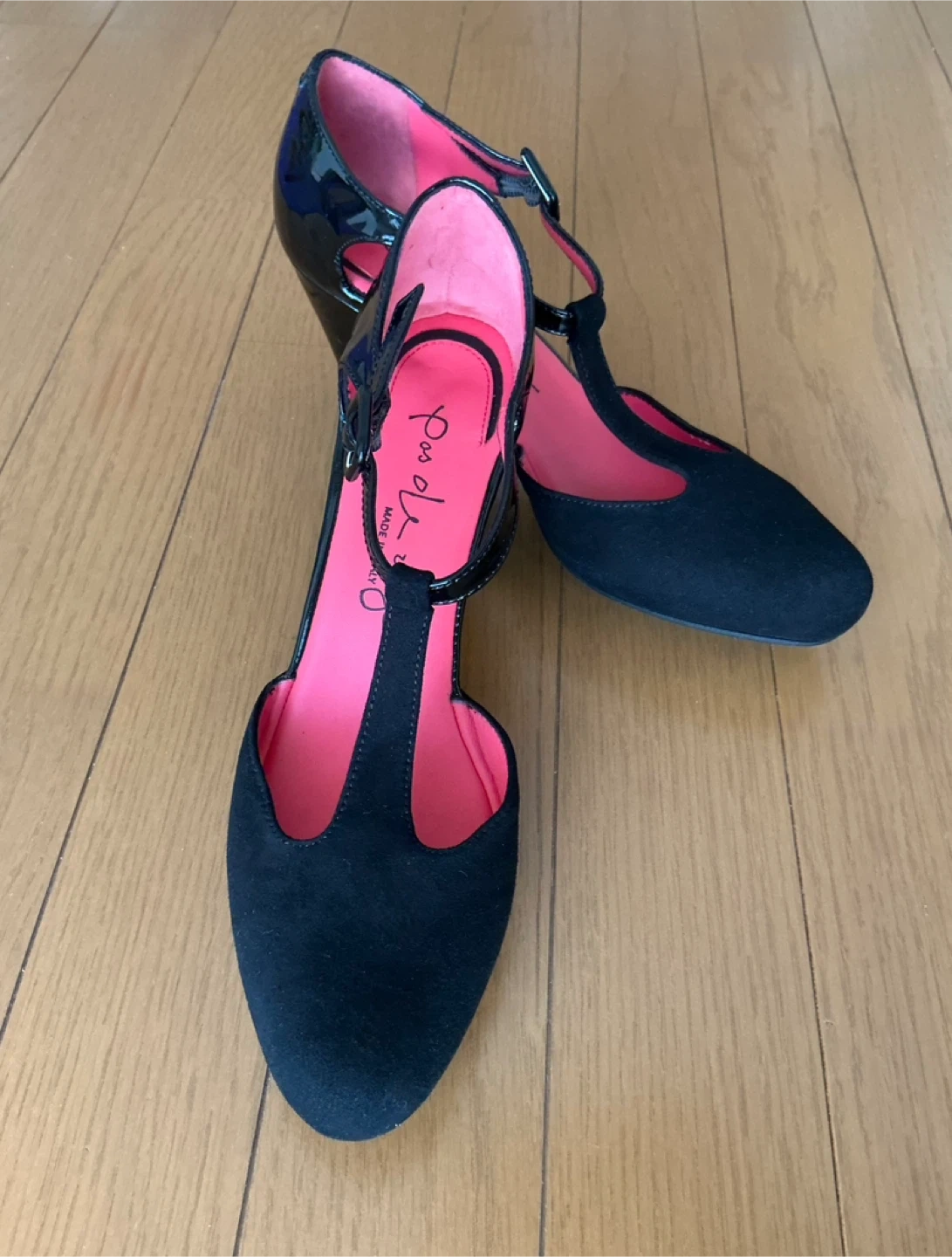 Pas de Rougeパ・ド・ルージュ イタリア製 サイズ:39(日本サイズ24.5〜25) ヒール:8㎝ 黒色のスエード 🩷鮮やかなピンク色のインソール Tストラップとアンクルストラップは黒のエナメル 👑伝統的な「手袋縫い」という製法と超軽量素材の組み合わせで、一日中履いていても疲れにくい「魔法の靴」と称されています。 室内試し履きのみ。ほぼ新品。 お取引場所:駅改札or中央区内、お互いの都合の良い場所も可能。 ご不明点があればお気軽にお尋ねください。