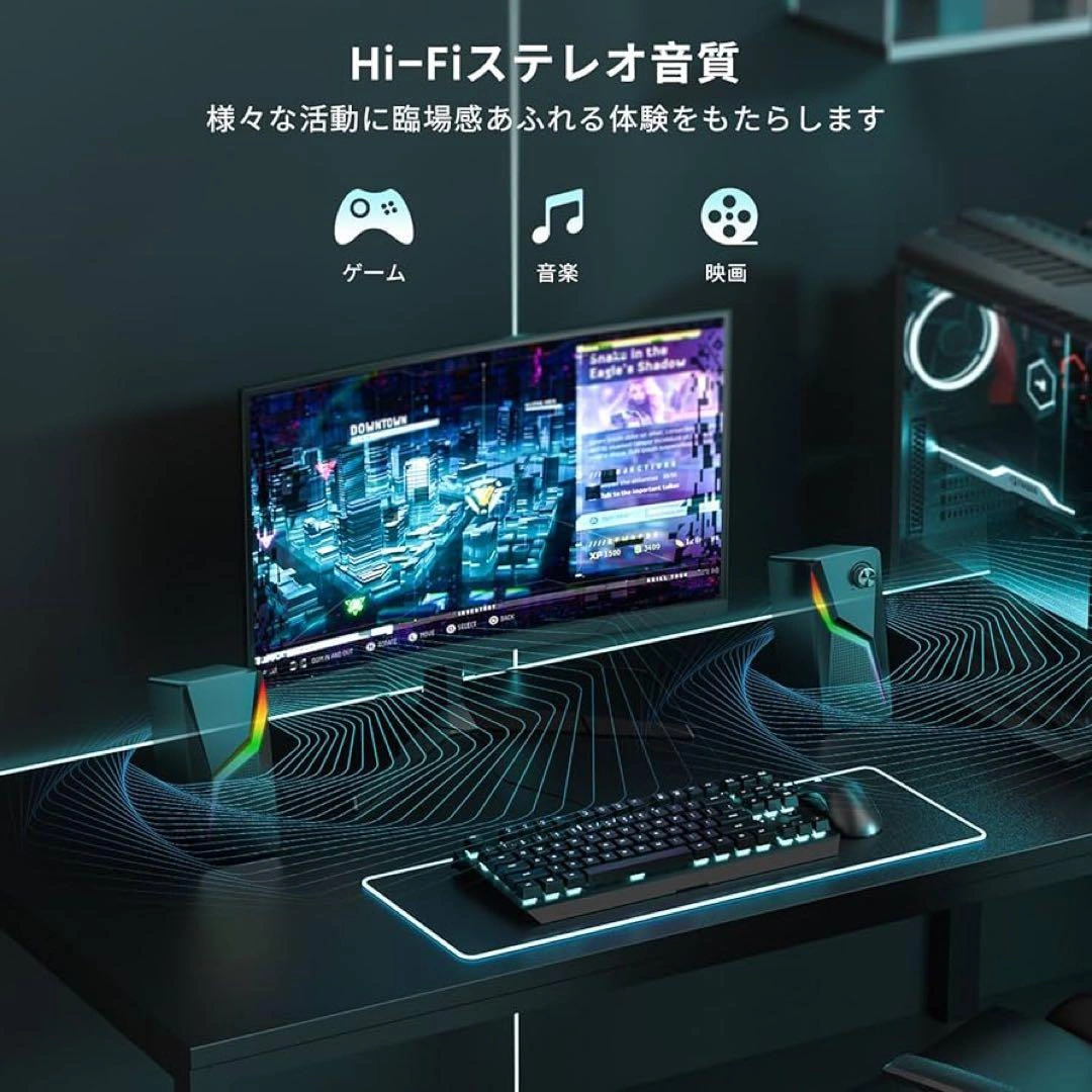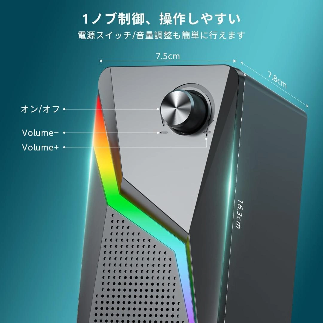 あたたかさ【商品仕様】 接続:電源…USB電源(USB Type-A端子)、 音声入力…3.5mmステレオミニプラグ 外形寸法:幅75×高さ78×奥行163mm 重量:約583g(コードを含む) コード長:スピーカー間約101cm、 音声入力コード/USBコード…約120cm 高度なサウンドドライバーとフルレンジ2.0ch強化ステレオコアが搭載されています。 RGBダイナミック照明効果が組み込まれており、6つの異なるカラーの照明効果を提供できます。音楽が変化すると、照明も変化します。 USB電源ケーブルと3.5 mmオーディオ ケーブルを接続すれば、オーディオを楽しめます。 3.5mmオーディオを搭載しており、コンピューター、デスクトップ、PC、ラップトップに対応します。USB Aポートタイプなので、iMac MacBookではご使用いただく前にUSB C - USBアダプター(別売り)が必要です。 Windows (Vista/7/8/10)、Mac OS、Chrome OS、Linux、UNIX などに適用されます。 1つのノブだけで音量の大きさと電源スイッチを制御でき、簡単かつ正確に音量を調整できます。デスクトップスピーカー間を繋げるケーブルの長さは101cmです。 $$2980 スピーカー PC ゲーミングスピーカー 有線 RGBライト付き 3.5mmケーブルが付属、USB給電式のパソコン用 テレビ、ラップトップ、タブレット、スマートフォンに対応 ブラック ご希望の方はお気軽にご連絡ください。