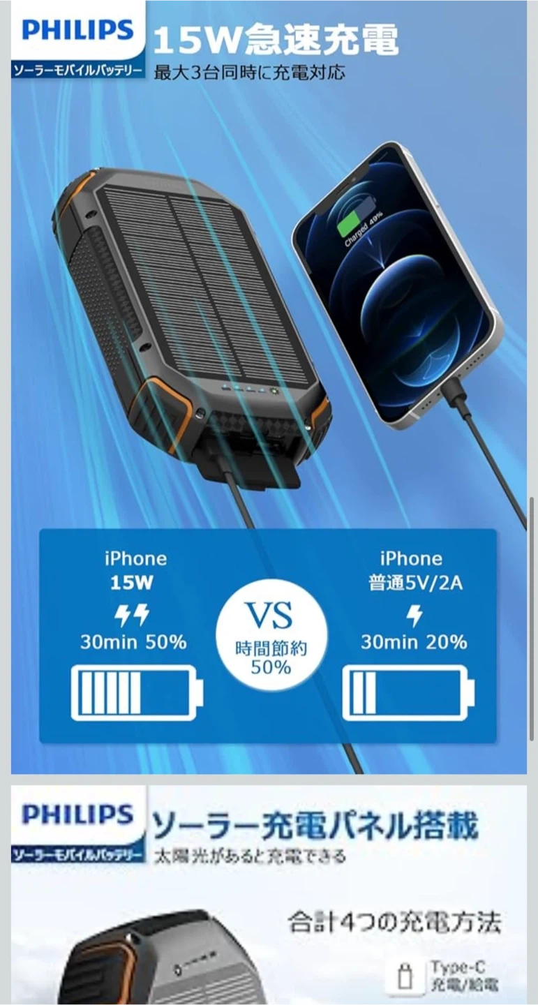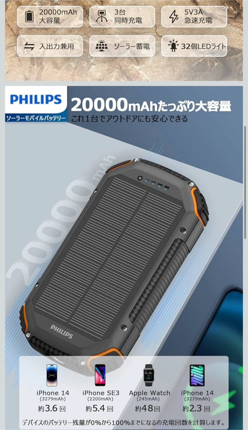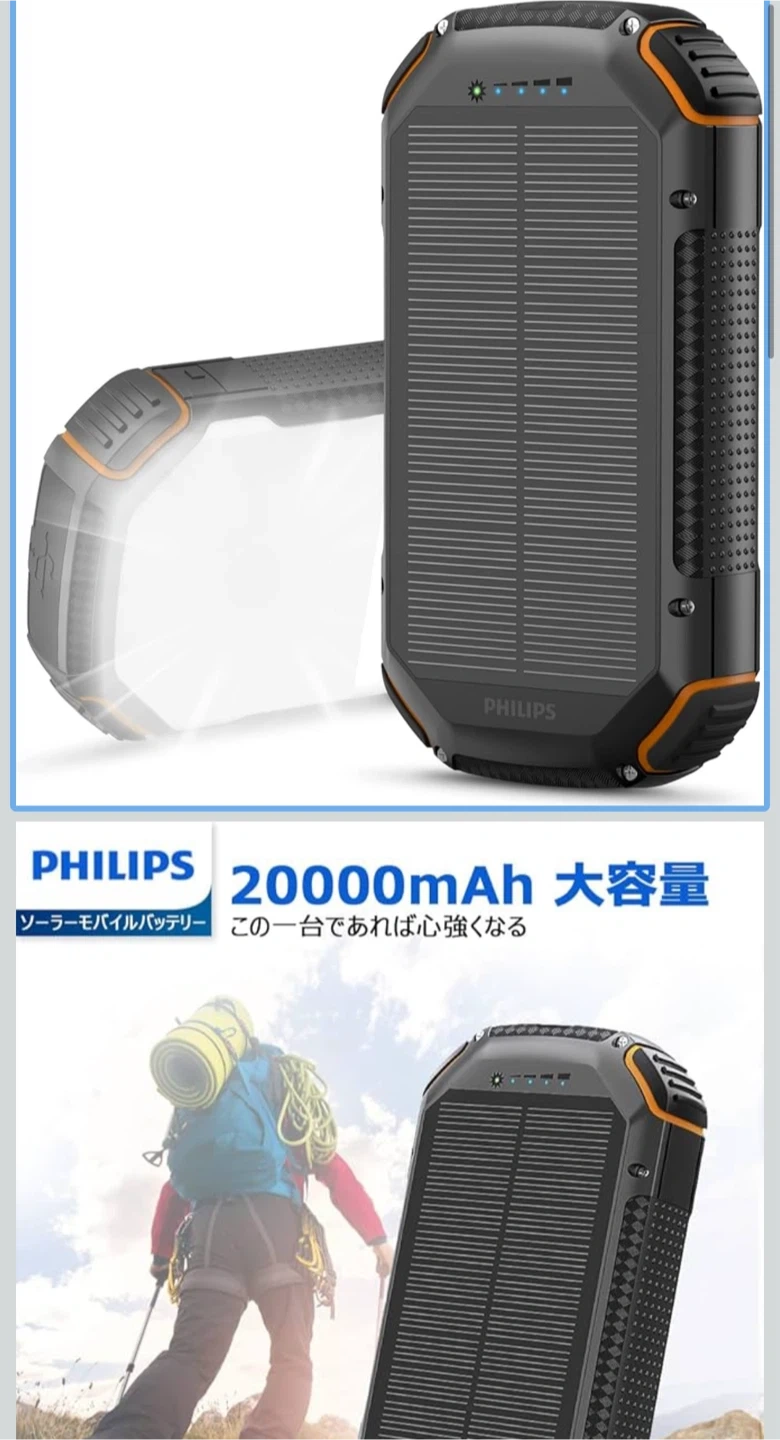 LED発光しないので出品します 20000mAhの大容量と15W急速充電対応のモバイルバッテリー。 未開封新品もあるので6000円でお譲りします 入出力兼用/急速充電/高輝度 LED/SOSライト付き 耐衝撃 旅行/キャンプ/災害/非常用グッズ ios/Android 対応 【20000mAh大容量&4Way蓄電】 20000mAhの超大容量で、1回のフル充電で長時間使用できるので、電池切れの心配がありません。一般的なモバイルバッテリーのように、USBでもソーラーパネルでも給電が可能です。電源がない場所でも太陽光さえあれば充電できます。バッテリー内蔵のソーラー充電器なので、microUSB入力とLighting入力、さらにType-Cの入出力ポートがあり、太陽光で電気を貯められる上に、4つの方法で蓄電することが可能です。太陽光充電時間は約105時間です。ご注意:最も理想的なソーラー充電状態を実現するためには、38000ルーメンの光量が必要ですので、直射日光を十分に確保できる場所に設置するようにしてください。 【5V3A急速充電&3台同時充電】 最大5V3Aでフルスピード充電技術によって急速充電も可能で、バッテリーが切れたとしても短時間でしっかり充電できます。また、USB-Aポートを2つ、Type-C入出力ポートを1つ搭載し、最大3台まで同時に充電することができます。家族や友人との旅行や出張、複数のスマホや デバイスを一度に充電したいとき、これ一台で十分です。 【防塵防水&耐久性強い】 充電器は高強度のABS+PC素材を使用しており、四角は落下の衝撃によく耐えられるようにヘミング加工されています。また、ソーラー充電器はIP45の防水・防塵性能を持ち、屋外での使用にも十分な耐久性があり、どんな厳しい天候にも耐えることができます。(※注:充電口が濡れないようにご注意ください)。 【安全保護機能&安心の保証】 過充電・過放電・過電流・短絡・低電圧など保護機能搭載します。PSE認証済み、安心・安全な充電が行えます - ブランド: PHILIPS - 容量: 20000mAh - 出力: 5V/3A - 急速充電: 15W - 充電ポート: Type-C ご覧いただきありがとうございます。