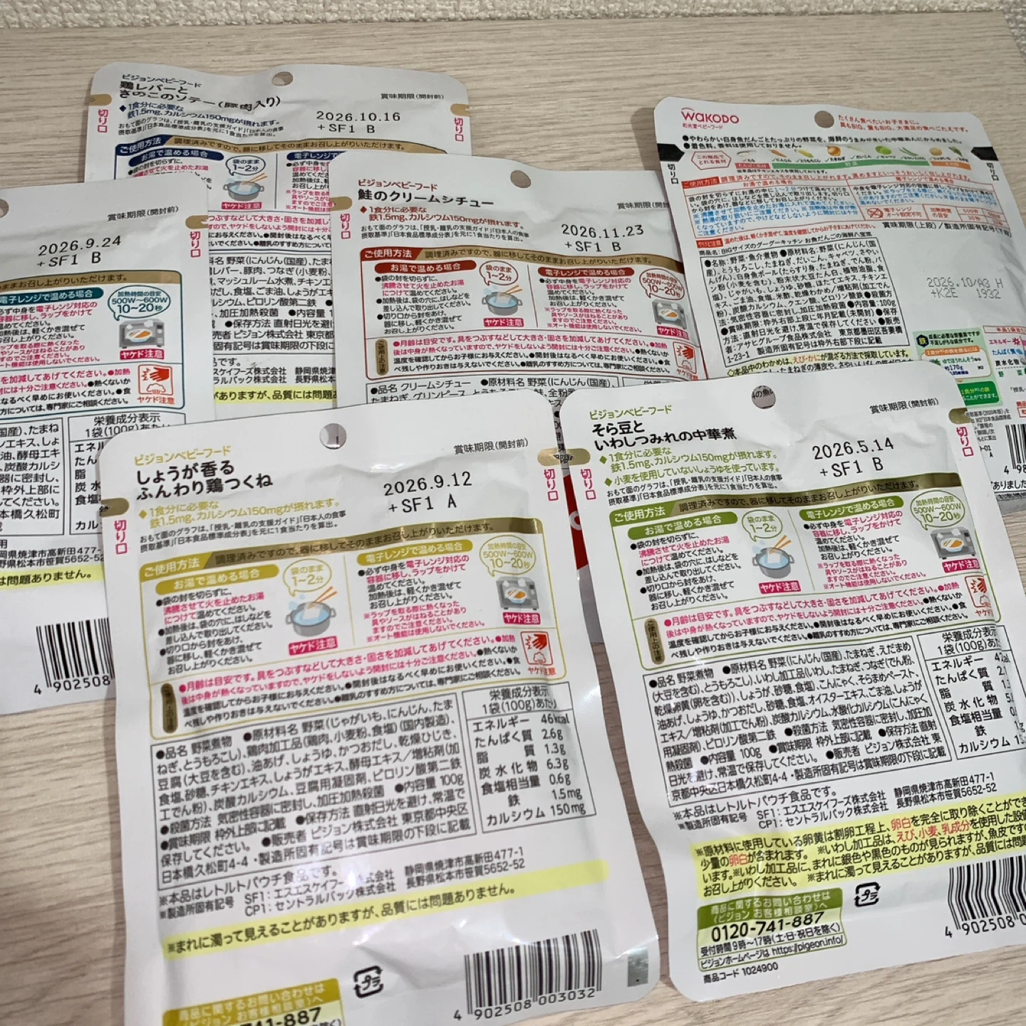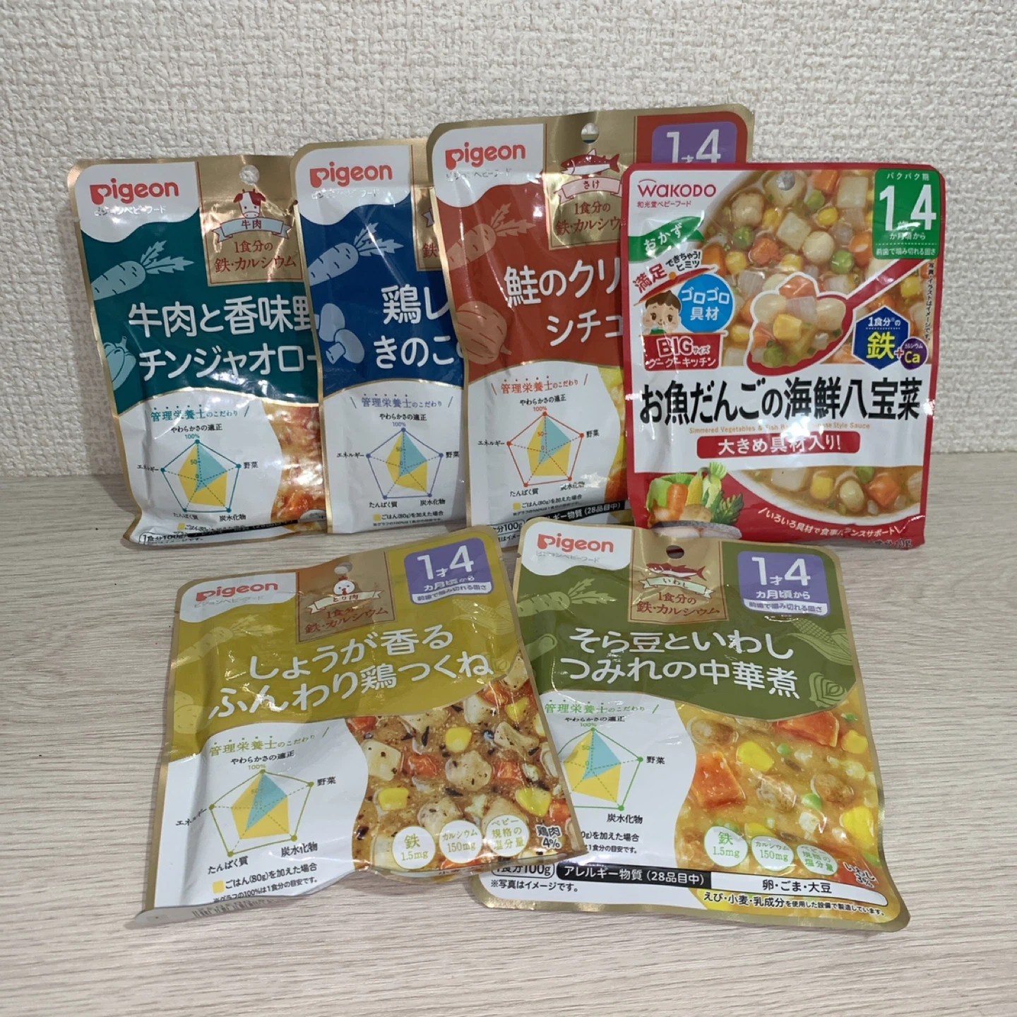 1歳4ヶ月頃からのベビーフードの6点セットです。 賞味期限は1番早い物で2026年5月14日です。 ・ブランド:Pigeon、和光堂 ・内容: ・鶏肉ときのこ 80g ・牛肉と香味野菜のチンジャオロース 80g ・鮭のクリームシチュー 80g ・しょうが香る ふんわり鶏つくね 80g ・お魚だんごの海鮮八宝菜 80g ・そら豆といわしのみそ中華煮 80g ・賞味期限:2026年5月〜2026年11月 子供が好き嫌いが多く食べなかったため出品します。