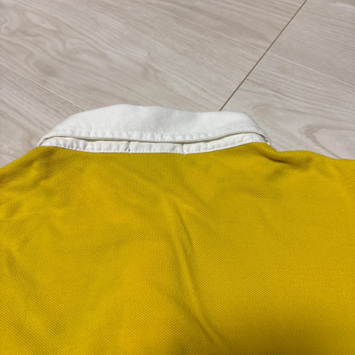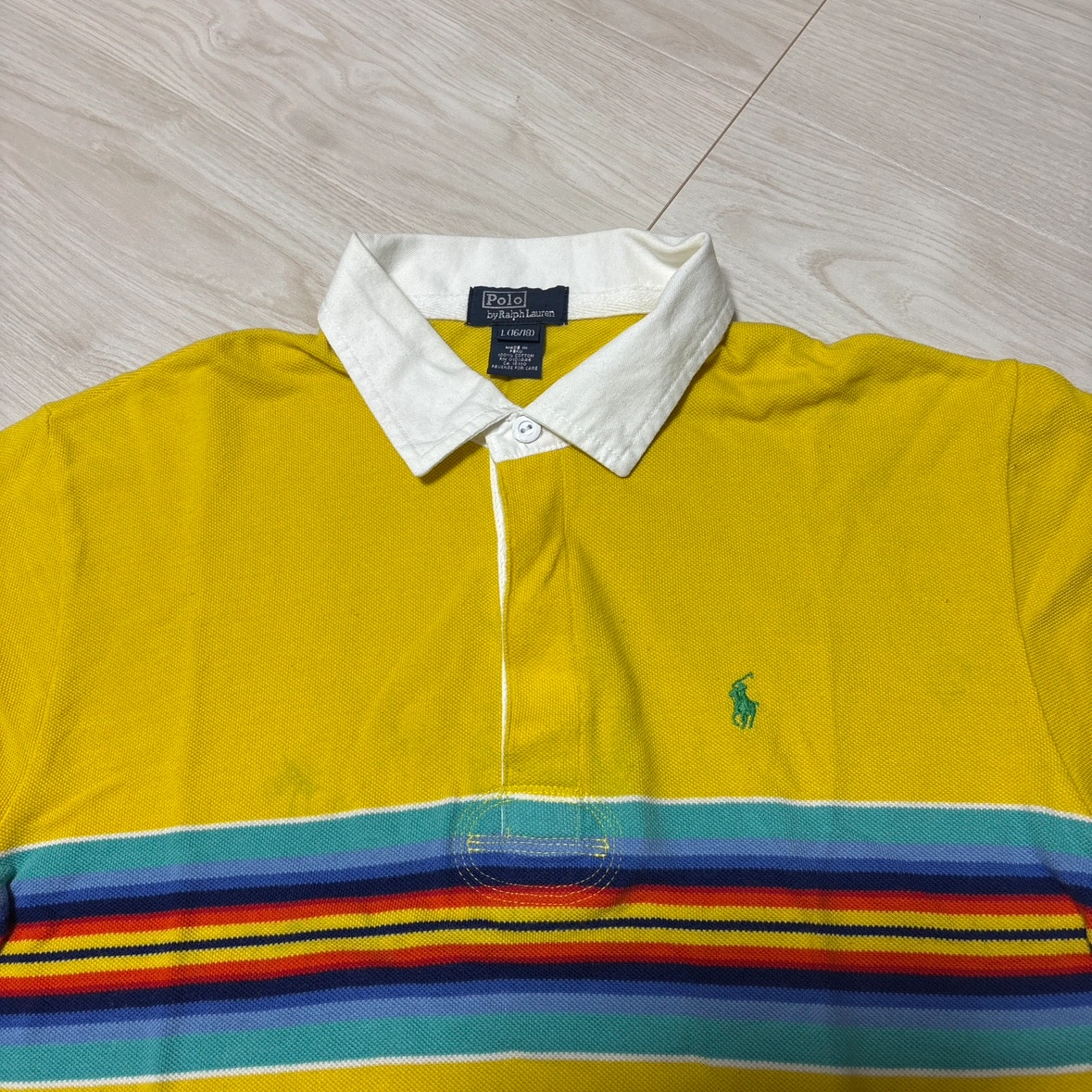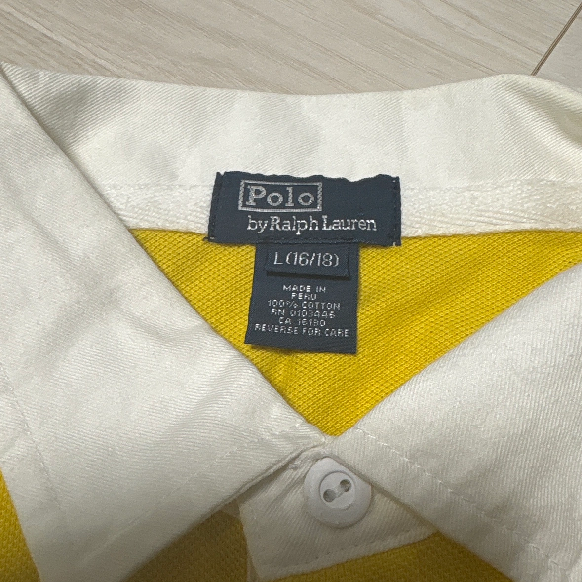 【デザイン】 鮮やかなイエローを基調としたポロシャツで、ストライプ柄が特徴です。カジュアルなスタイルにぴっ たりのアイテムです。 【素材】 100%コットン製で、通気性が良く、快適な着心地を提供します。日常使いに最適な素材です。 【サイズ】 Lサイズ(16/18)で、ゆったりとしたフィット感があり、リラックスしたスタイルを楽しめます。 - ブランド: Polo by Ralph Lauren - 色: イエロー - サイズ: L (16/18) - 素材: 100% コットン - デザイン: ストライプ柄 - 襟のタイプ: ホワイトの襟 身幅 45 着丈 70 ご覧いただきありがとうございます。
