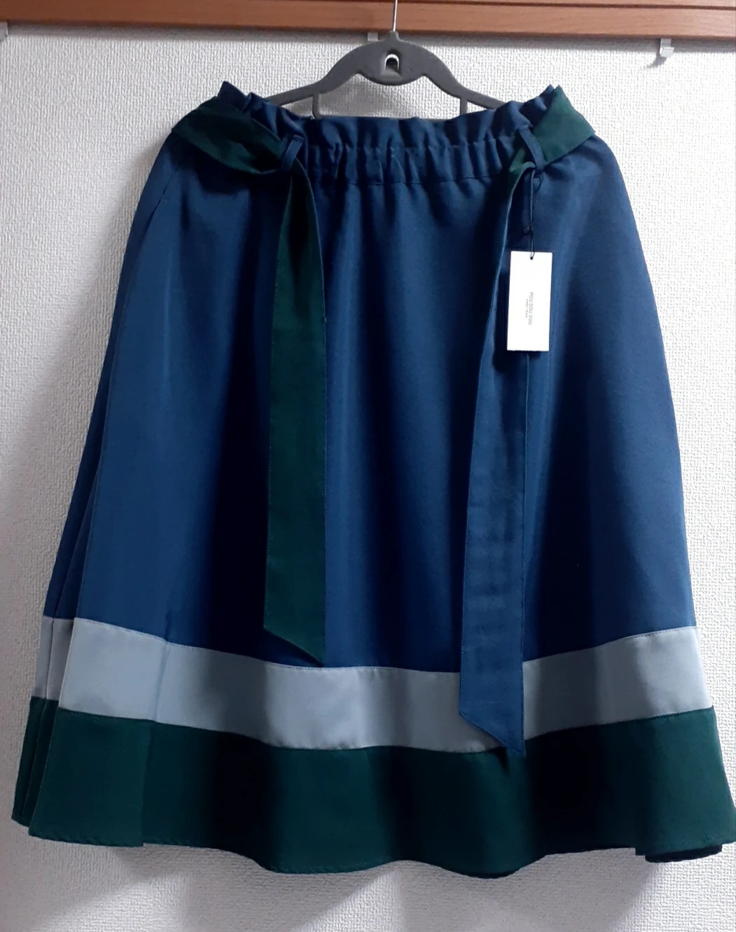 【タグ付き新品】POUDOUDOU(プードゥドゥ)のスカートです。 ・品名:ソフトギャバジン裾配色フレアSK ・サイズ:M ・素材:ポリエステル100% ・色:青、緑、グレー 2018年購入 当時大体5000円程度だったかと思います。 両ポケットありで使い勝手良く、でも配色切り替えとリボンベルトが可愛いスカートです。 丈は素人採寸で64cmくらいです。 試着した程度でタグ付き新品ですが、素人保管の中古品であることをご了承ください。 価格交渉応じます🙆🏻 質問でもなんでもお声がけ下さい。