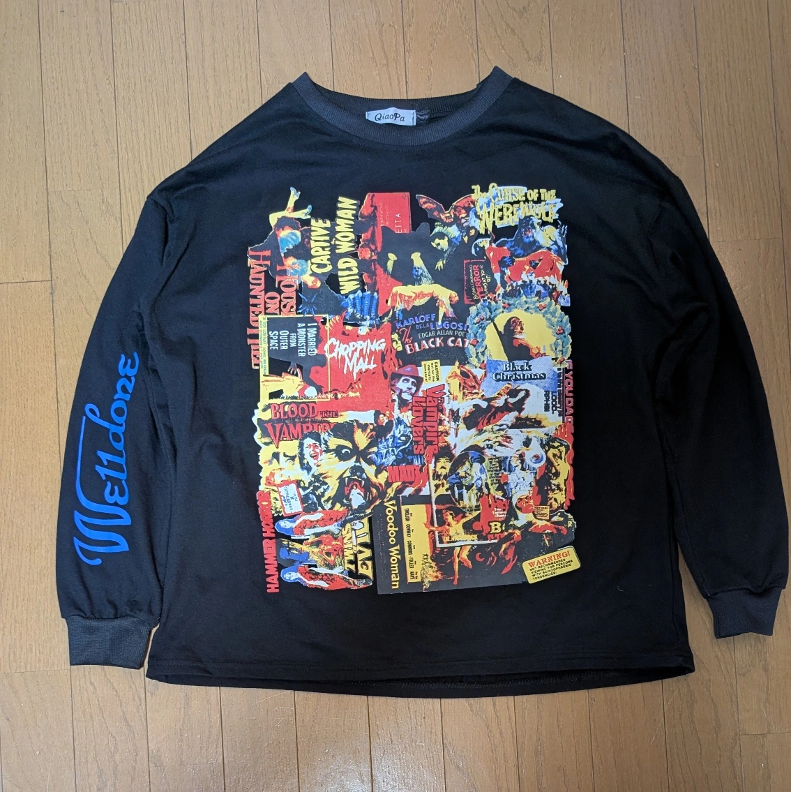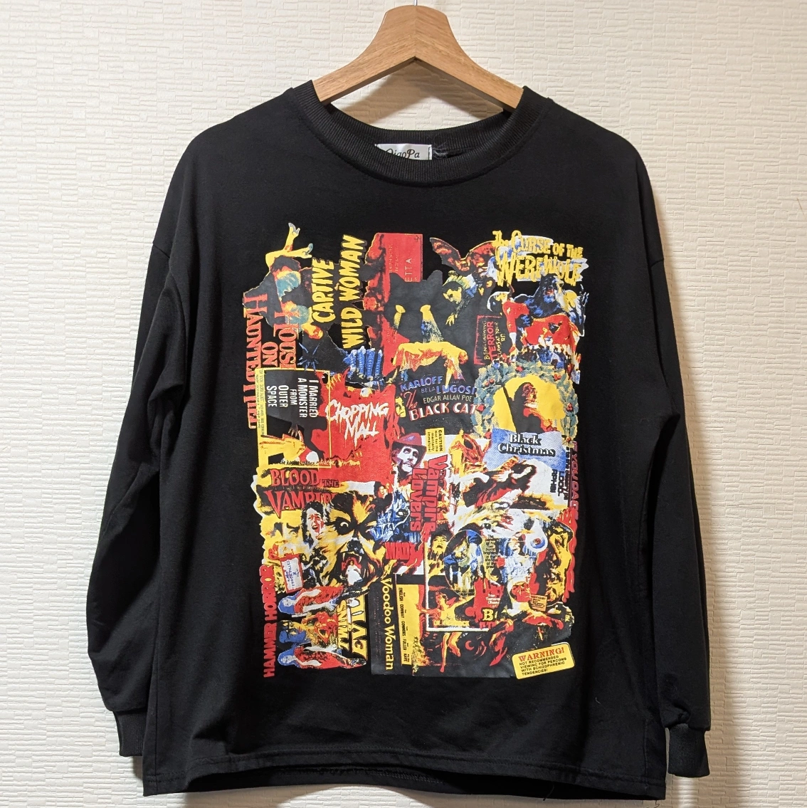 あたたかさ以前古着屋で購入したロンTです、趣味の傾向と少しズレたため出品します。 昔のB級ホラー映画っぽいプリントが気に入ってました。 肩幅/身幅/袖丈/着丈 肩幅...57cm 身幅...55cm 袖丈...49cm 着丈...59cm カラー...ブラック 袖丈...長袖 柄・デザイン...プリント(ロゴなど) 汚れ・破れ・臭いなど...なし