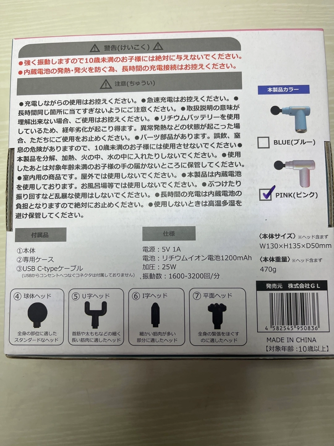 ご覧頂きましてありがとうございます。 商品は、動作確認済み 外箱パッケージに若干のダメージがございます。 ご理解頂ける方のみご購入を宜しくお願いします。 多段階の振動設定が可能なハンディマッサージャー。 - Color: Blue, Pink - Power: 25W - Size: W130×H135×D50mm - Weight: 470g - Charging Method: USB Type-C - Speed Settings: 1600-3200RPM