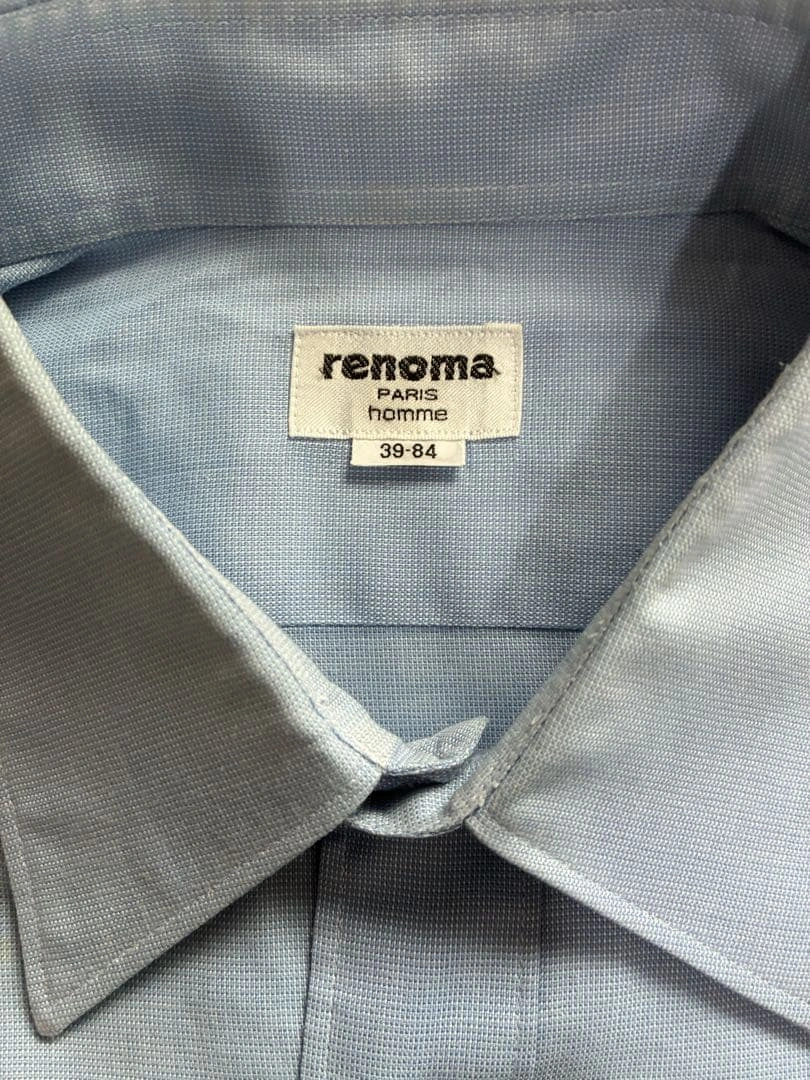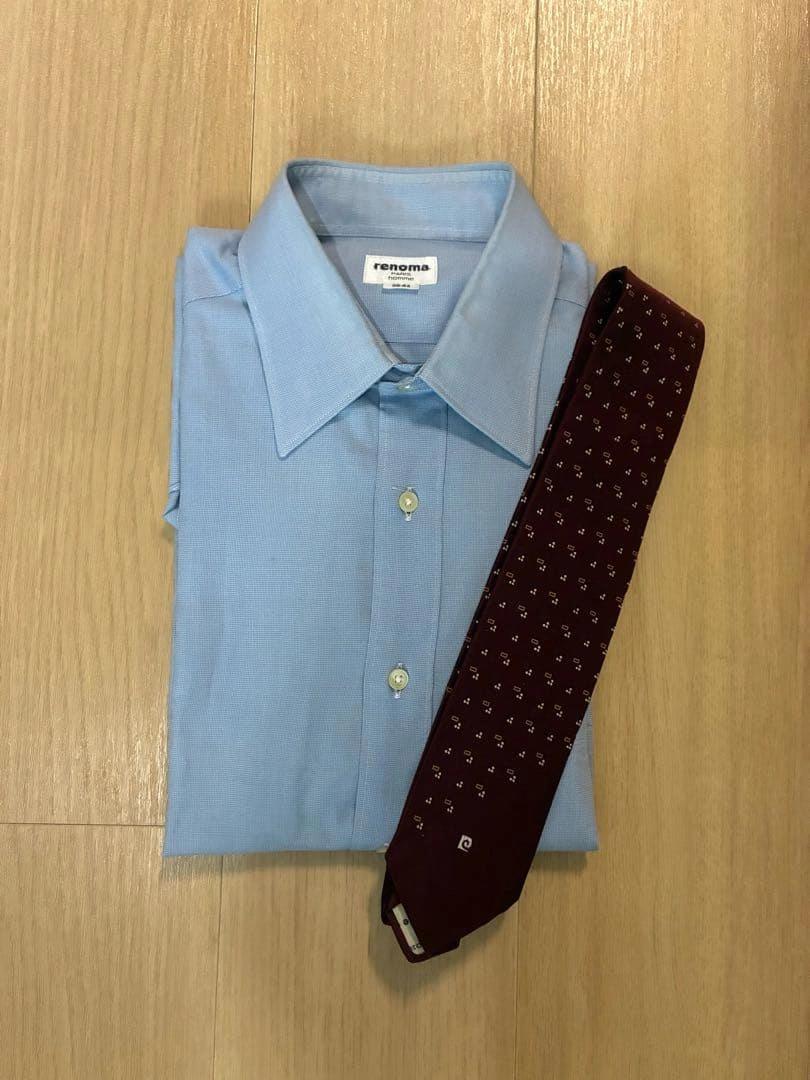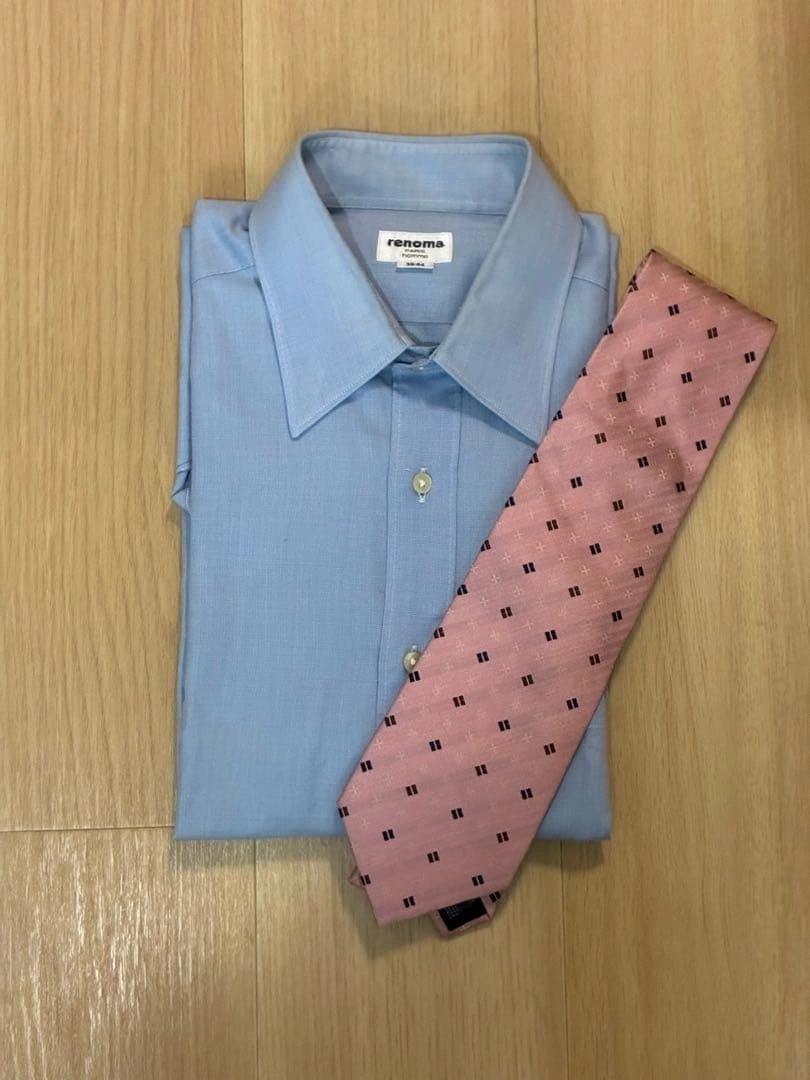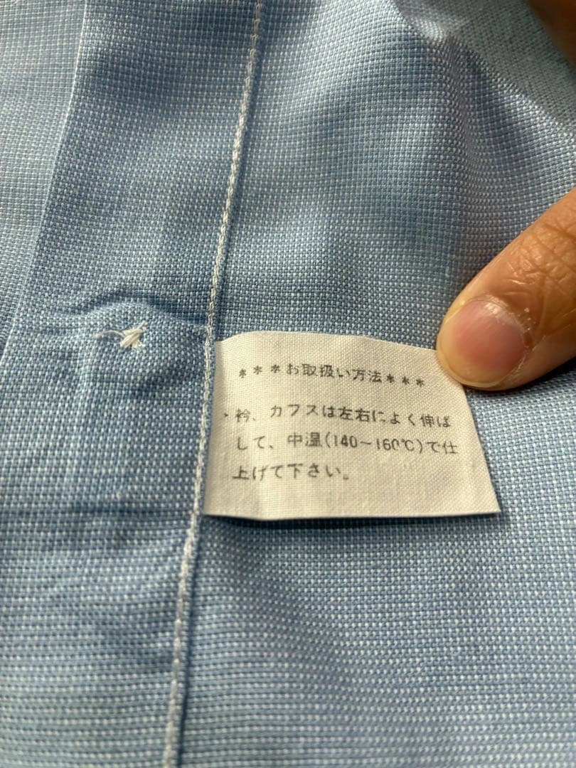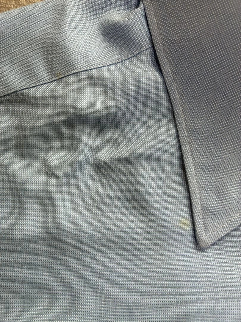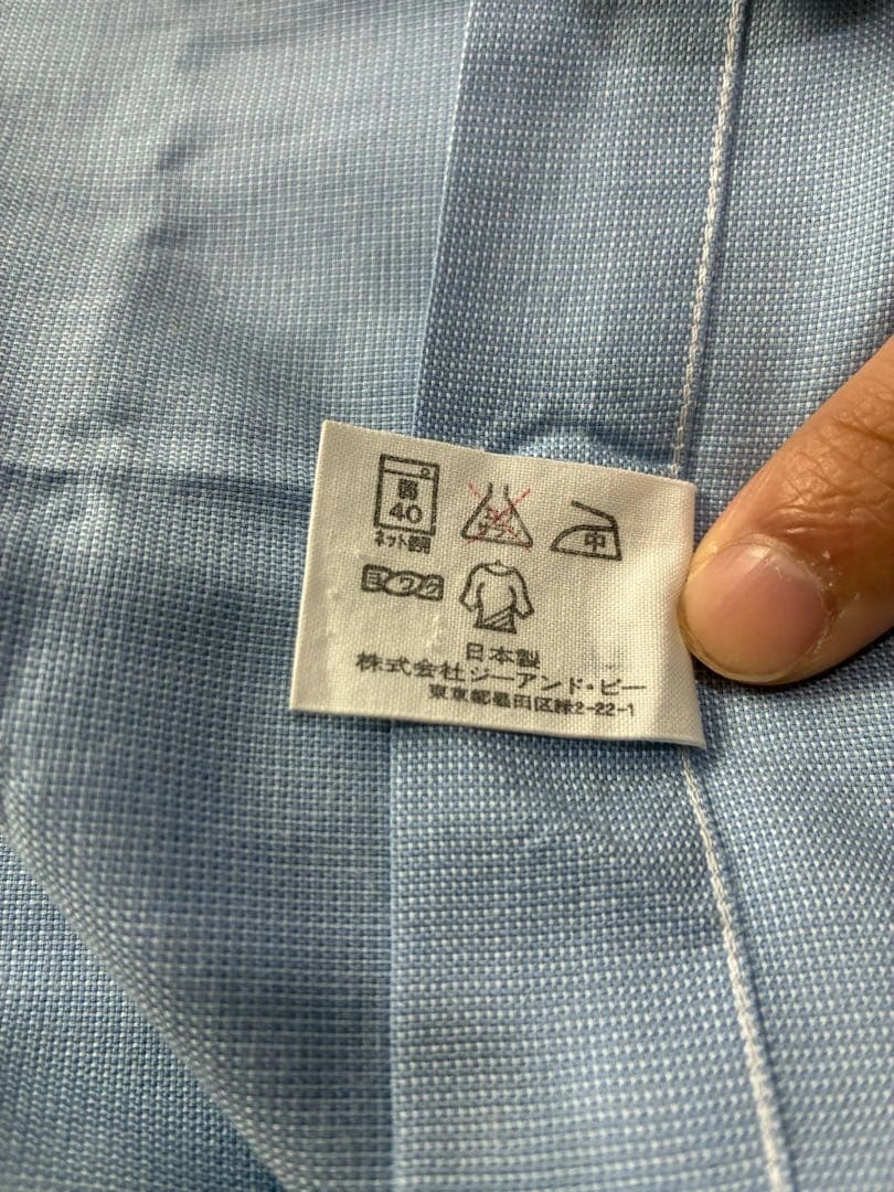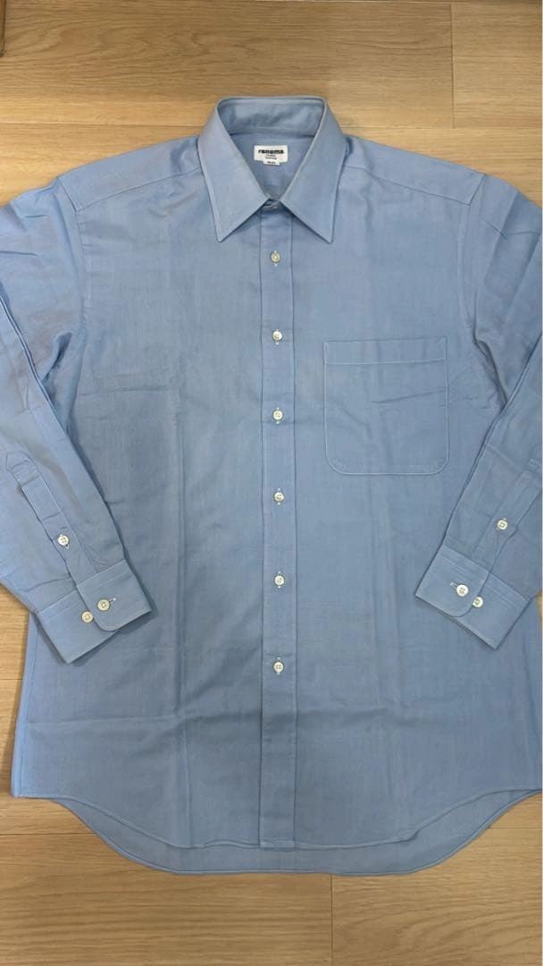 手持ちのネクタイを合わせてみましたが、なんでも合ういい色です。ネクタイは付きません。 前身頃の首周りに黄色いシミがあります。あんまり目立たないです。 サイズ表記が無かったので、Mサイズは適当なものを選びました。寸法を記載しているので参照してください。目安として、身長165cm普通体型でピ ッタリでした。 肩幅48cm 身幅58cm 袖丈60cm 着丈80cm 青色の長袖シャツ、胸ポケット付きでシンプルなデザイン。 - 色: 青 - デザイン: 長袖シャツ - ポケット: 胸ポケットあり - ボタン: 前面ボタン留め - 襟のスタイル: レギュラーカラー ご覧いただきありがとうございます。