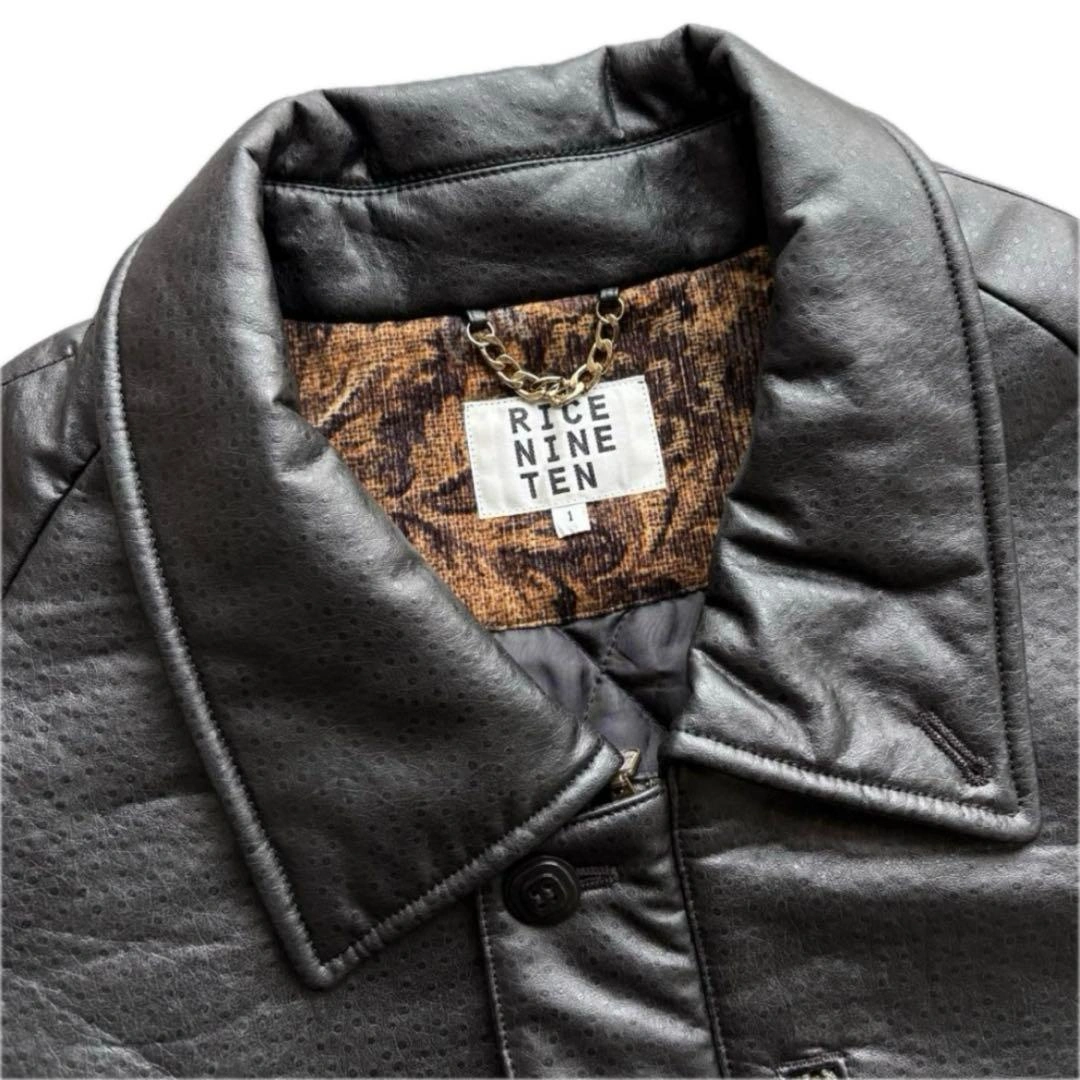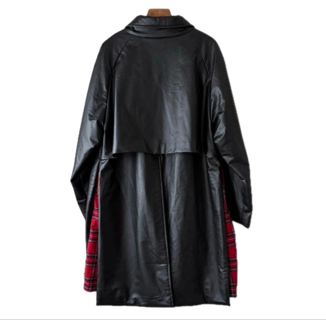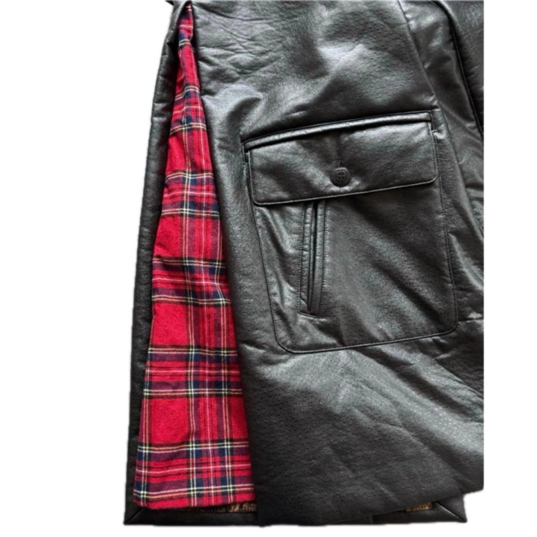 RICE NINE TEN ライスナインテン フェイクレザー スリットコート オーストリッチのような質感のフェイクレザー生地を使ったコートです。 比翼仕立てになっており、スリット部分はタータンチェックの生地になっています。 裏地にはコブラン織りの生地が使われています。 □カラー ブラック □素材 - □状態 目立つ汚れやダメージはありません。 □表記サイズ 1 □実寸サイズ 肩幅:約-cm 身幅:約65cm 着丈:約99cm 裄丈:約89cm