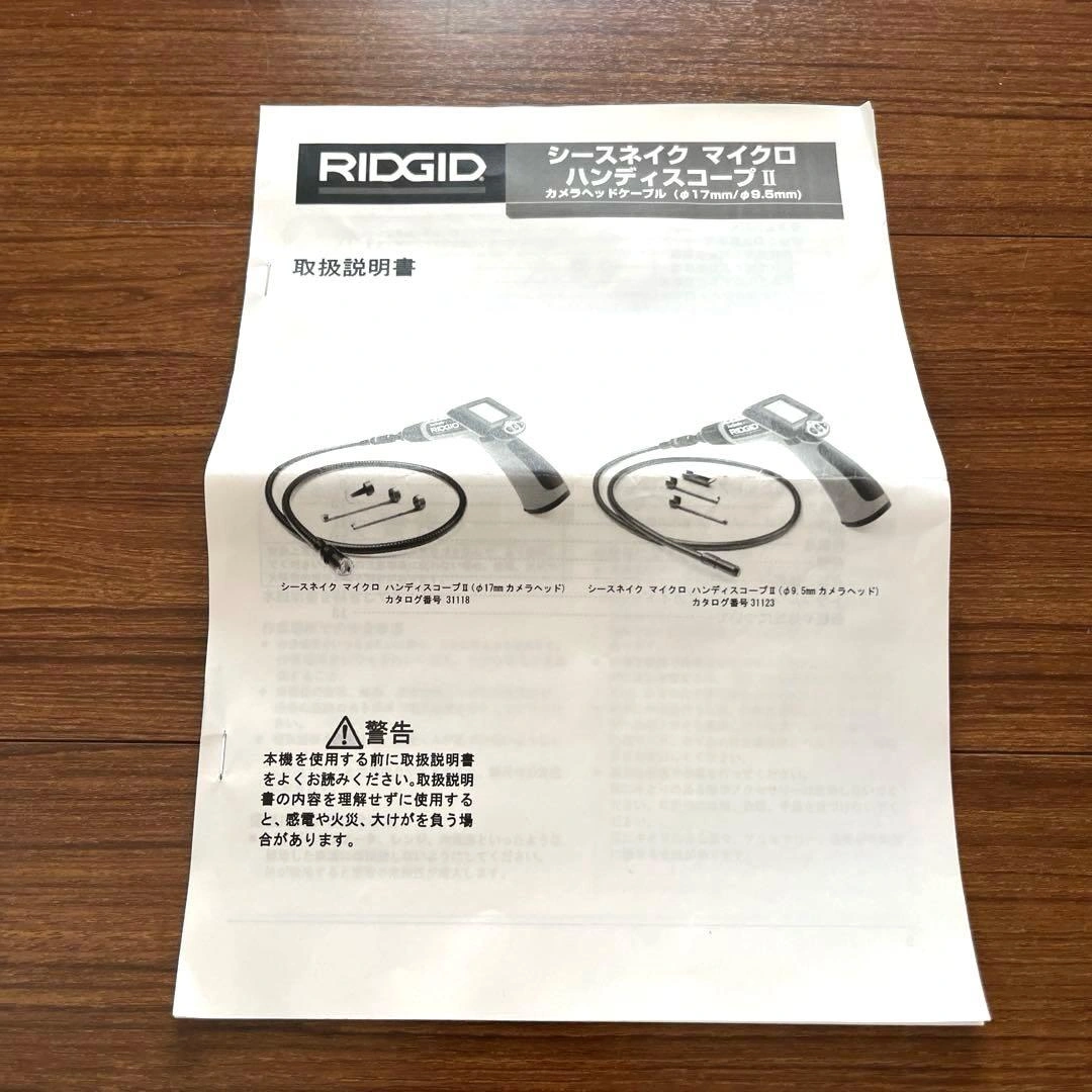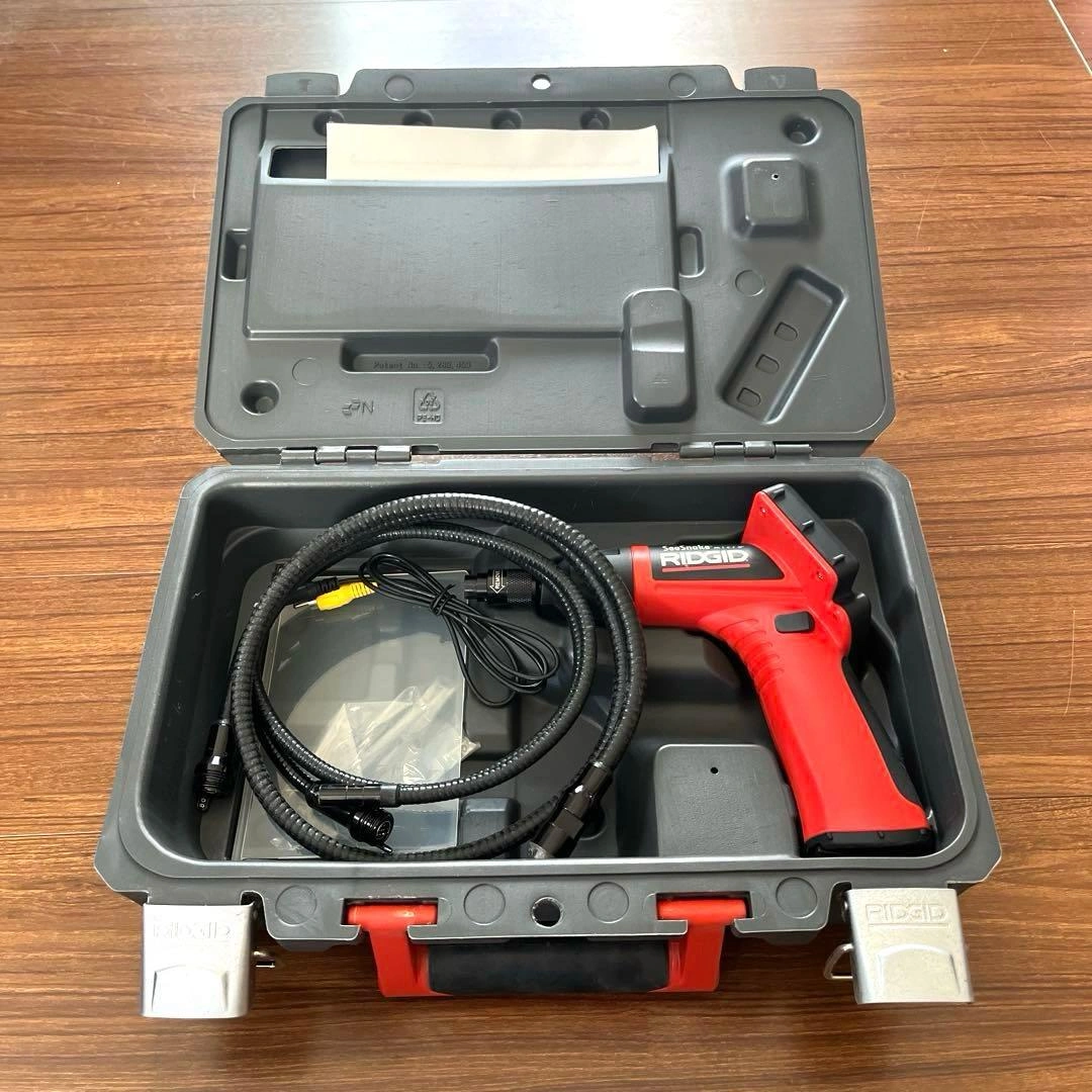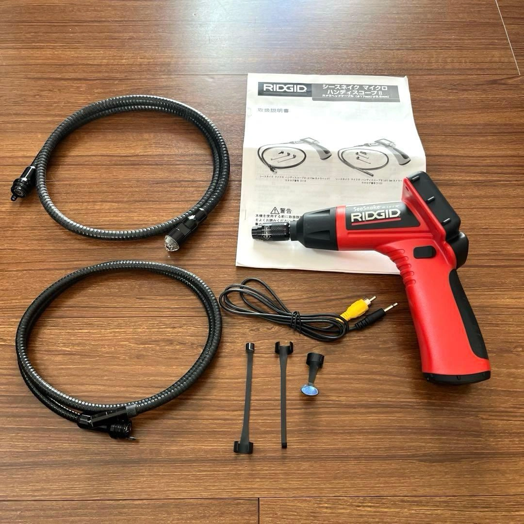 動作確認済み、電池交換済みです。 RIDGID シースネイクマイクロハンディスコープⅡ、カメラヘッドケーブル(中17mm/9.5mm)、ハードケースのセットです。 目立つ汚れはないと思いますが、しばらく使用していなかったため出品いたしました。 【商品の特長・基本仕様】 使用場所 屋内 可視距離 2.5 cm ~ 30 cm 電源 単三アルカリ電池 1.5V x4 電池寿命 約6時間(連続使用の場合) ※LED 光量調整と使用状況により異 質量 0.5 kg 寸法 長さ 17.8 cm 幅  9.2 cm 高さ 15.9 cm ディスプレイ 解像度  160 x 324 RGB モニター  2.5インチ LCD 動作環境 温度 0°C ~ 45°C 湿度 5%~95%(ディスプレイ部分について結露のない状態) 保管温度 -20°C ~ 70°C 防水 カメラヘッドケーブルアッセンブりおよびエクステンションケーブル(水深3mまで)(正しく接続されている場合) ケーブル長さ90cm (オプションのエクステンションケーブルを使用した場合、最長9mまで) ビデオ出力 アナログ RCA ケーブル/ピンジャック(90cm) 特長手の届かない空間や機械、配管、ダクト内部やエンジン内部、壁裏の検査や観察に最適な工業用検査カメラです。 軽量かつ片手でも操作が可能です。
