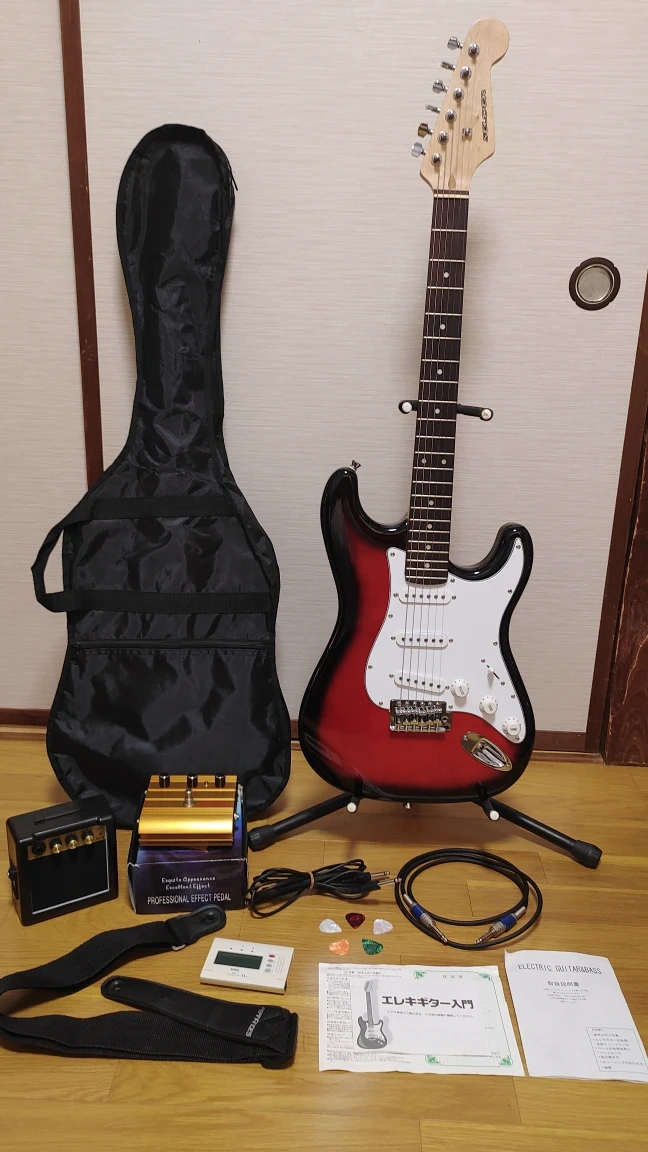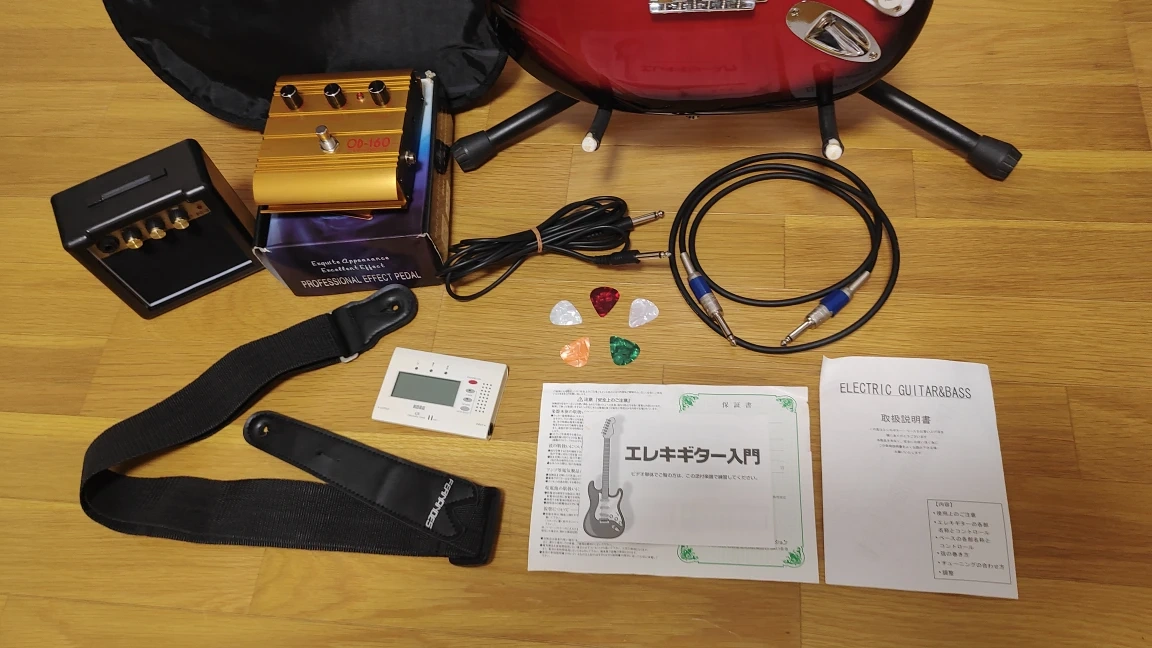 1. Selder エレキギター 2. アンプ TS PG-3 3. ソフトケース 4. エフェクター OverDrive OD-160 5. スタンド 6. ピック 5枚 7. チューナー 8. ケーブル x2 9. ストラップ