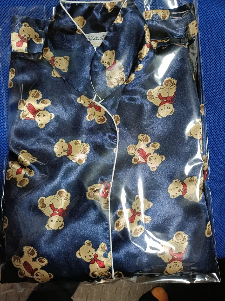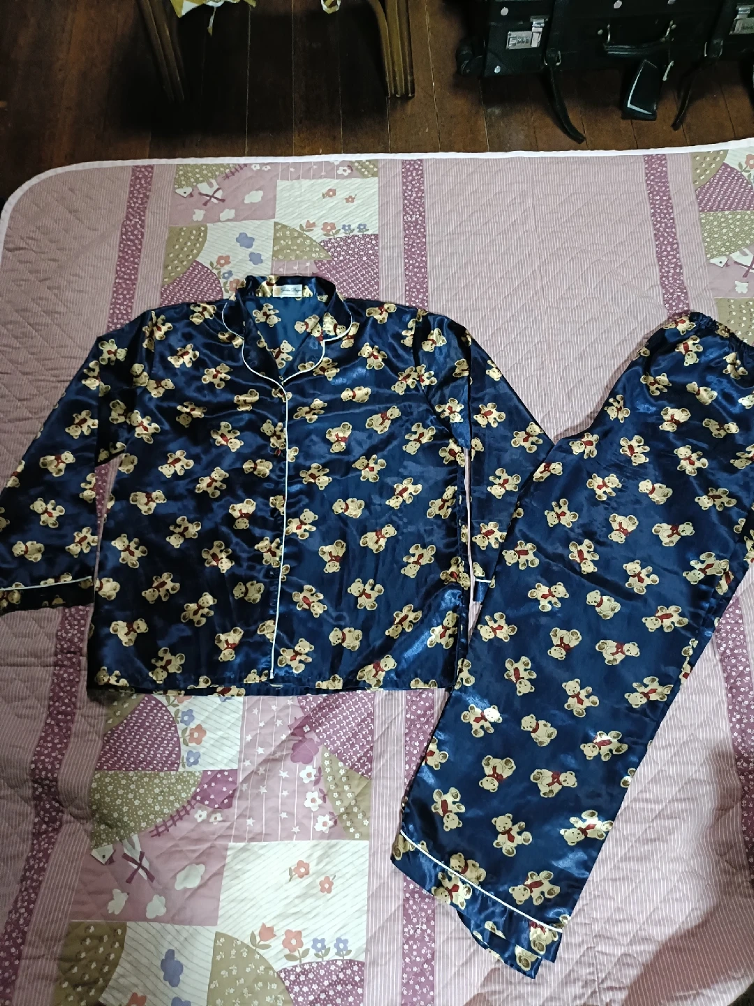 SILK100%のパジャマ上下セットです。 紺地に可愛いテディベアの柄入りです 3回ほど着用して洗濯、消毒の代わりにアイロン掛け済みです。 貧乏性の為、身体がツルツルして落ち着きませんので、中古でもよろしかったら、よろしくお願いします 【情報 色:紺色 柄:テディベア サイズ✼フリーサイズ (L寄りのM) 【状態】 使用感少なめ 中古品であることご了承ください、細いことが気になる方は購入をお控えいただきたく、よろしくお願いしますm(_ _)m