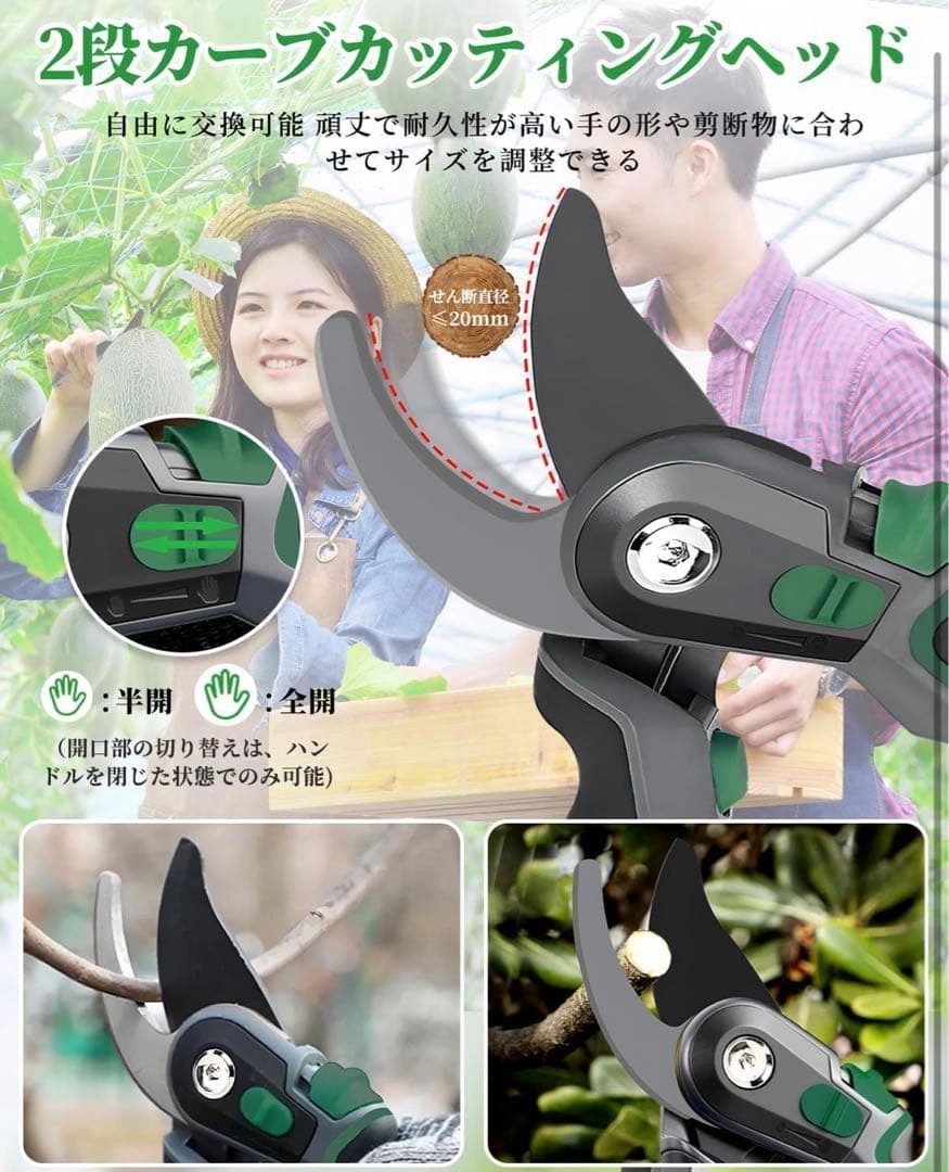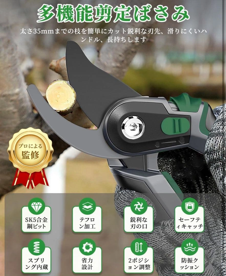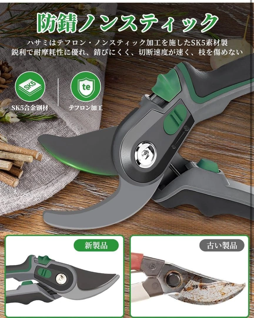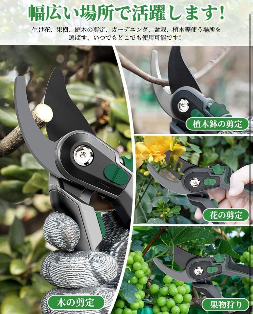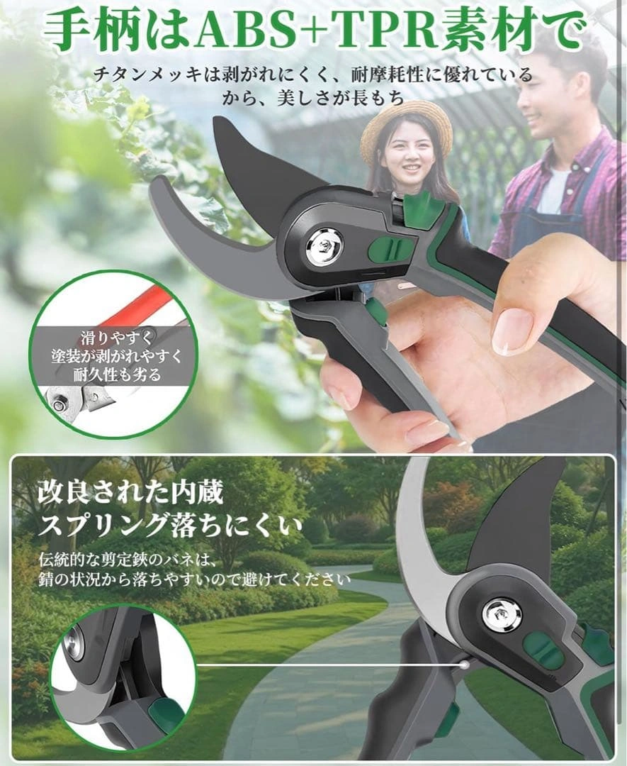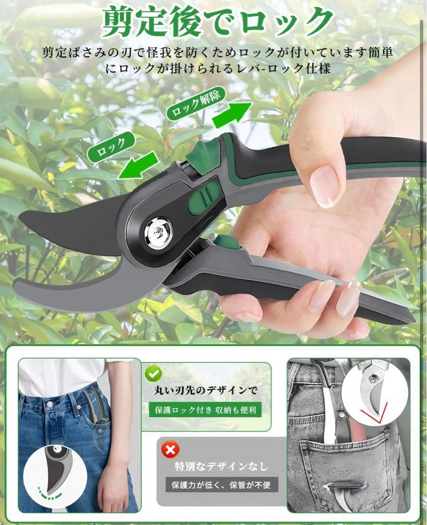 SK5鋼製刃とテフロン加工で、最大35mmの枝を切断できる剪定ばさみです。2段階調節可能、SK85高炭素鋼、アルミ合金製。開口部35mm、軽量化アルミハンドルで握りやすいです。果樹、庭木、盆栽、庭園作業、ガーデニング、観葉植物などにいかがでしょうか。ブランド: SK5、最大切断径: 35mm、刃の素材: SK5鋼、機能: テフロン加工、安全機能: セーフティキャッチ、グリップ: エルゴノミックデザイン、防錆: 防錆ノンスティック。ご希望の方はお気軽にご連絡ください。