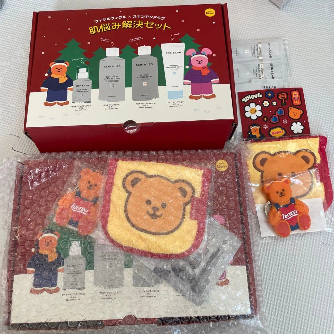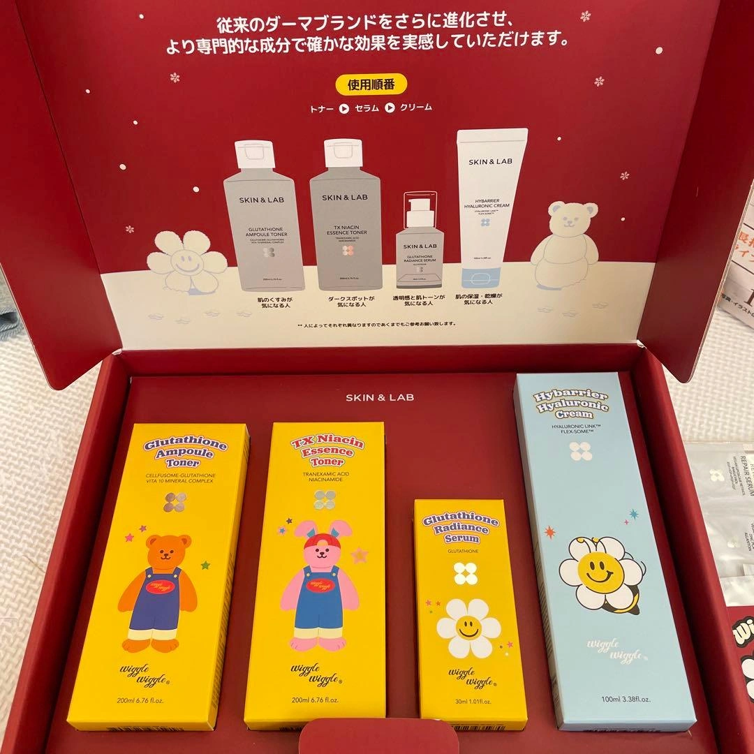 4種のスキンケアアイテムと特典付きのセットです。 こちらを2セット箱のままお渡しします。 ⋆┈┈┈┈┈┈┈┈┈┈┈┈┈┈┈⋆ - セット内容: グルタチオン アンプル トナー 200ml - セット内容: TXマイナスイオン エッセンス トナー 200ml - セット内容: グルタチオン アンプル セラム 30ml - セット内容: ハイパリアルヒアルロンクリーム 100ml - 特典: ウィグルウィグル ステッカー - 特典: ウィグルウィグル キーホルダー - 特典: ポーチ - 特典: サンプル各種 ご覧いただきありがとうございます。
