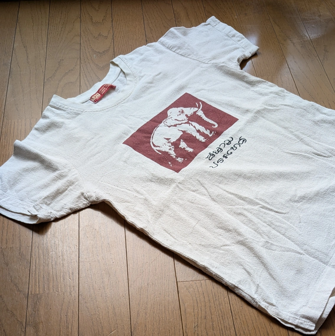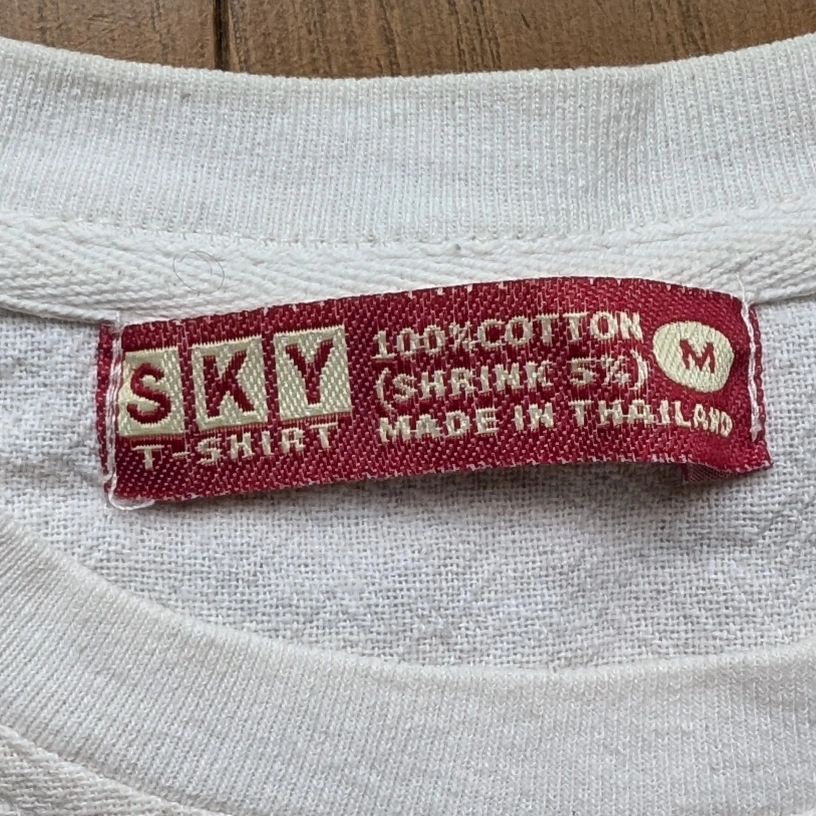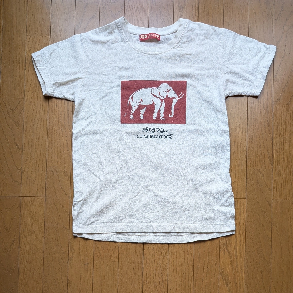 あたたかさタイ、バンコクのアパレルブランド「SKY」のシャツです。購入時「タイの昔の国旗なんだよ」とお店の方が教えてくれました。 吸水性の高い素材なので、サラッと着れます。 肩幅...42cm 身幅...48cm 袖丈...17cm 着丈...54cm カラー...ベージュ 柄・デザイン...プリント(ロゴなど)