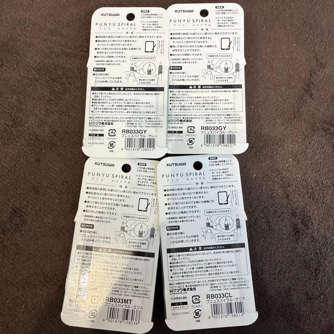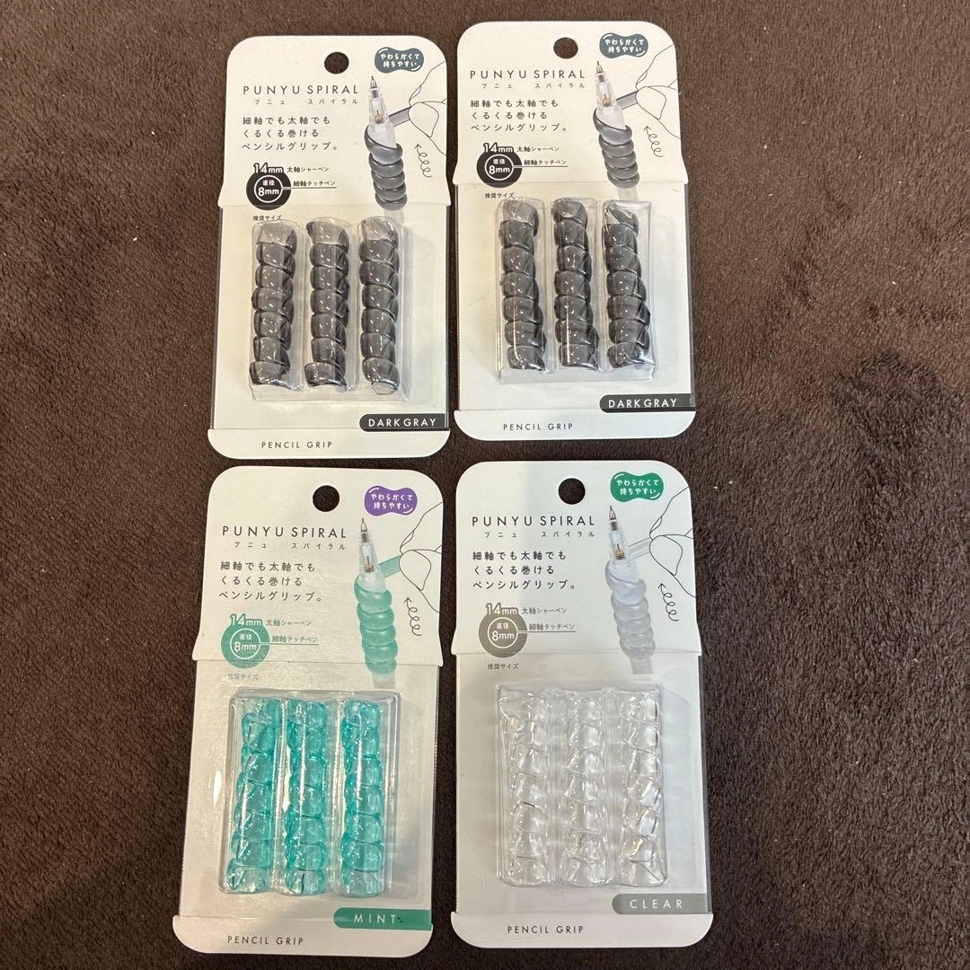プニュスパイラル 3個入り グレー2箱 クリア、ミント各1箱 未使用未開封です。 値札を剥がしたあとがすこしベタついています。 バラ売りは1つ600円です。 タッチペンや鉛筆、シャープペン、ボールペン等の様々な太さの軸の握る部分にくるくると巻いて使うペンシルグリップです。取り付け可能な太さは、細軸(約8mmの細いタッチペン等)から太軸(約14mm多色ボールペン等)の筆記具に取り付けできます。やわらかいエラストマー素材で疲れにくく、スパイラル形状が指にフィットします。 ご希望の方はお気軽にご連絡ください。
