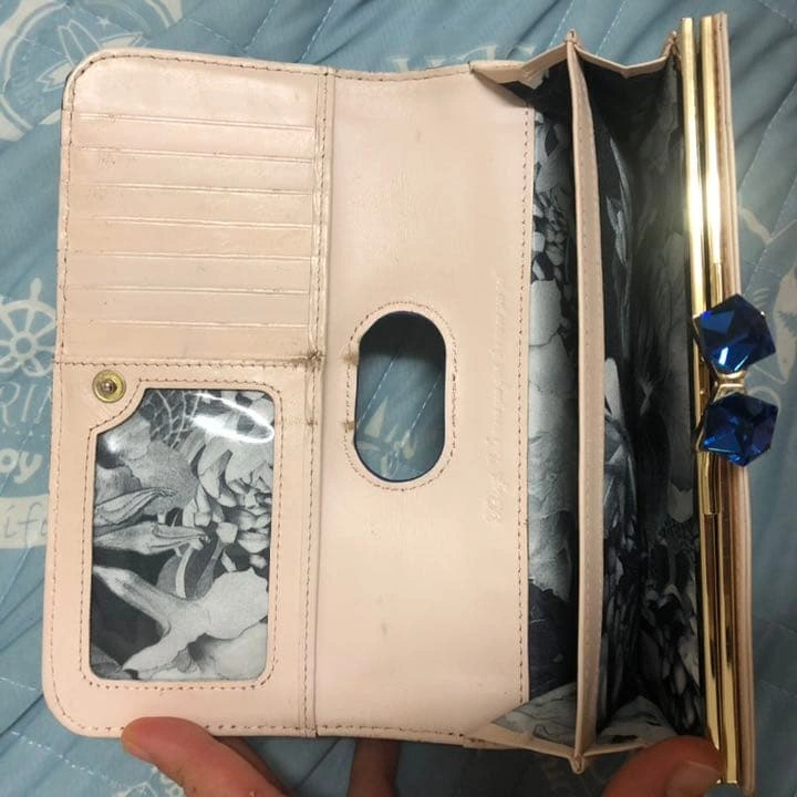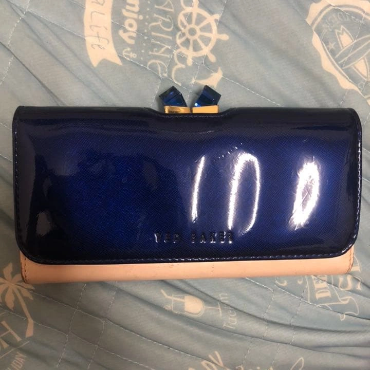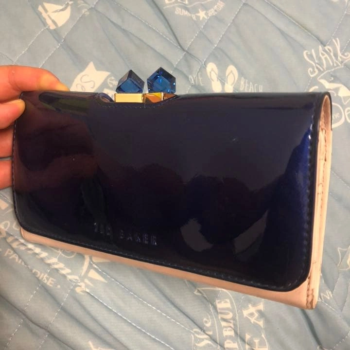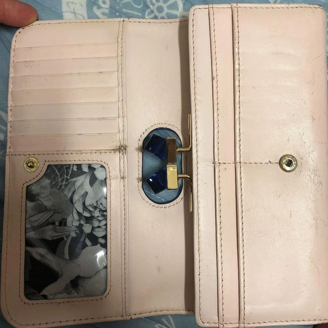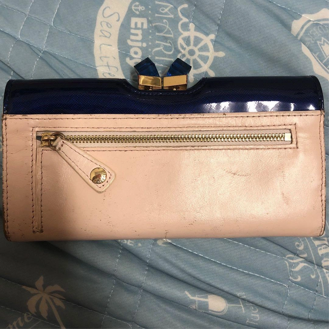 TED BAKERのがま口長財布です。がま口の部分がクリスタルのような形で、ブルーと淡いピンクのバイカラーで大人かわいいデザインです!中も白黒の花柄がデザインされており、開けても閉じても可愛い財布となっております! 1年ほど使用したので、かなり使用感はありますが、このデザインはとても人気とのことです。定価は3万円ぐらいでした。 ※箱なしで発送予定ですが、必要な方はご相談ください。 ご希望の方はお気軽にご連絡ください。