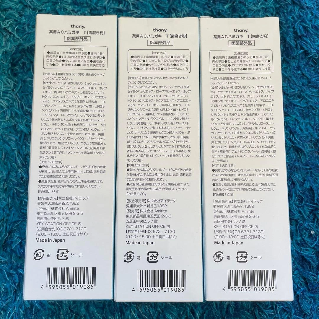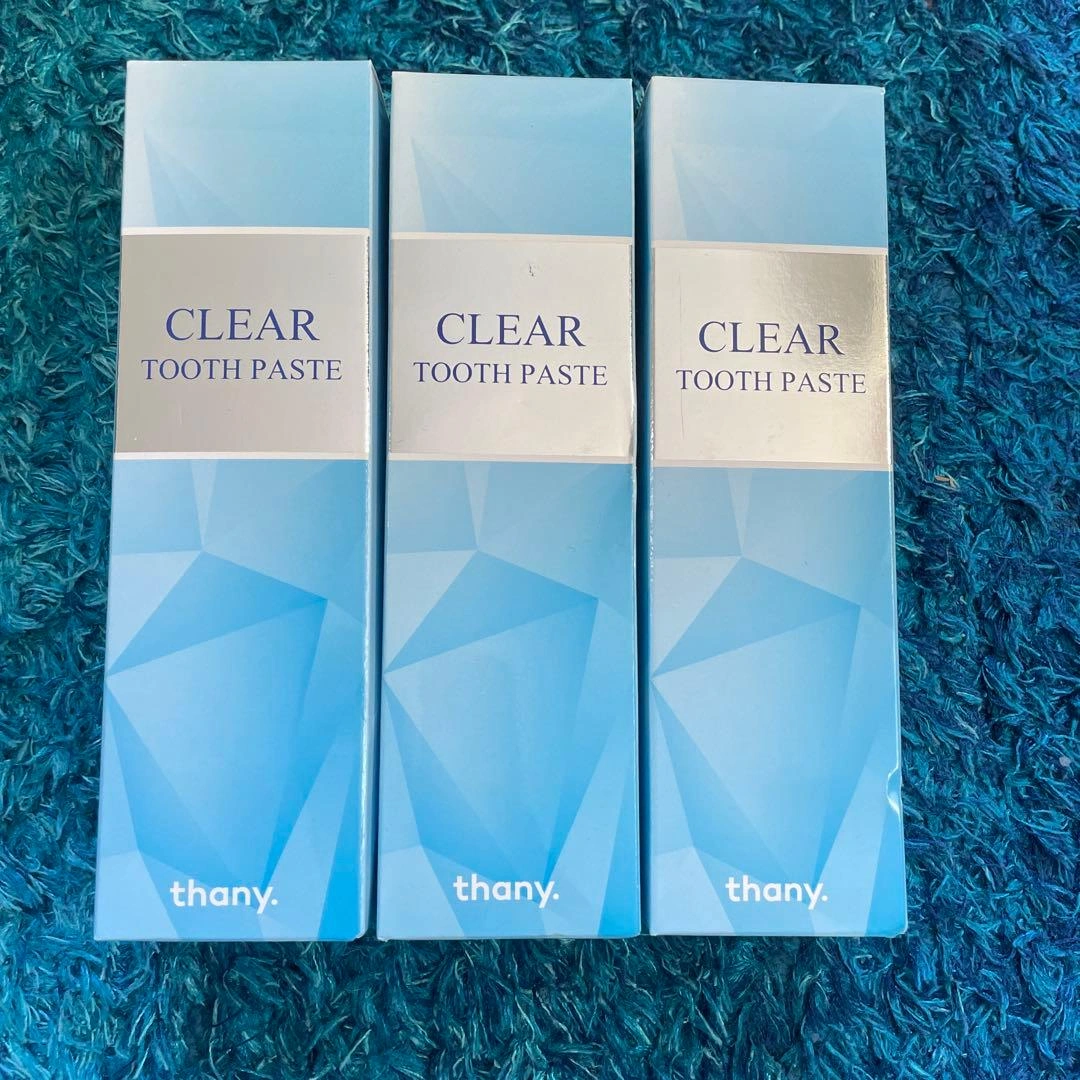 3本セットです。 【美しい歯を目指す新習慣】 歯の色で顔の印象は大きく変わります。thany.の薬用ホワイトニング歯磨きペーストで自信の持てる笑顔に✨ 【自宅で簡単ホワイトニング】 ホワイトニングに通うのはお金もかかるし大変。。。毎日の歯磨きをthany.に変えるだけ! 【使いやすいペーストタイプ】 口当たりの良いなめらかテクスチャ。歯は意外とデリケート。研磨剤フリーなのも嬉しいポイント! 【3種の有効成分】 医薬部外品処方でしっかり効果を実感。口内を徹底ケア。 【白い歯で清潔感】 「ポリエチレングリコール400」がブラッシング効果によりタバコのヤ二を落として本来の白い歯に導きます。 【ホワイトニングだけじゃない!】 口臭×歯周病も予防。「塩化セチルピリジニウム」が口臭原因菌を殺菌、「グリチルリチン酸ジカリウム 」が歯ぐきを炎症から守ります。 【癖のないスッキリミント味】歯磨き粉の味って結構大事!癖のないミント味で、毎日使いやすく仕上げました。 【美しい歯の新習慣】thany. 歯磨き粉 120g 医薬部外品 薬用 ホワイトニング 歯磨き粉 120g 口臭ケア 歯周病 歯肉炎 虫歯予防 歯の黄ばみ ヤ二取り 美白 歯を白くする 自宅 セルフホワイトニング はみがき粉 ご希望の方はお気軽にご連絡ください。