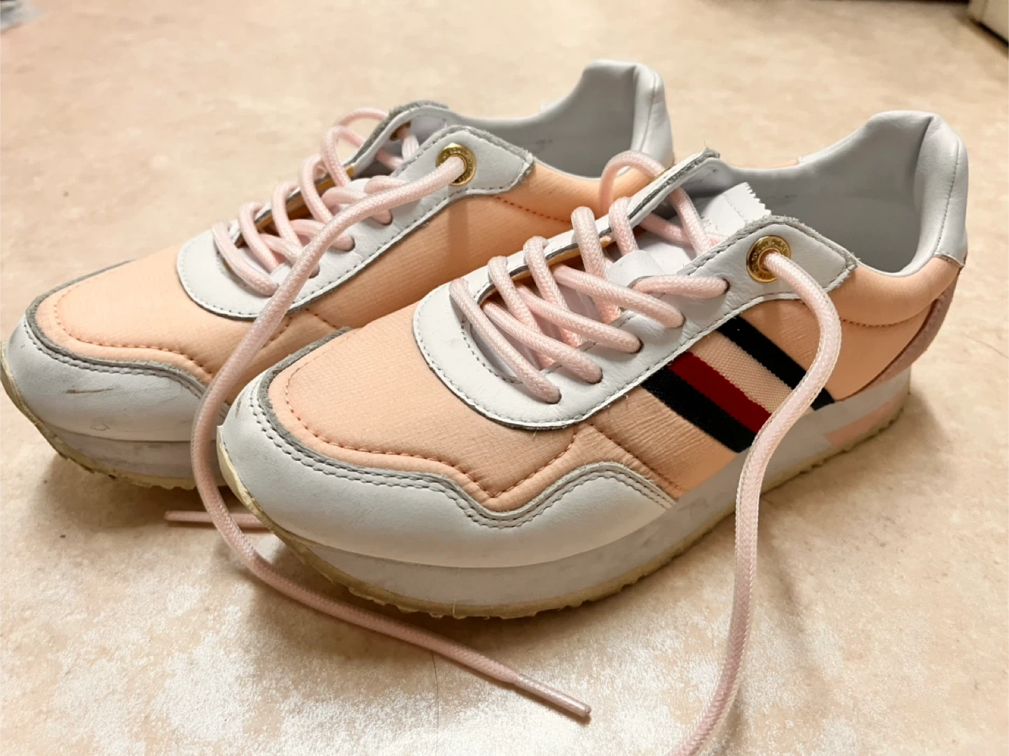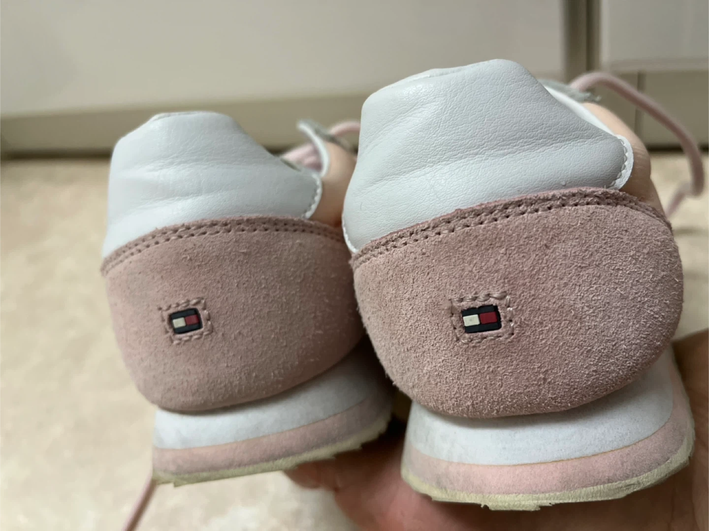 Tommy Hilfiger ピンク スニーカー21.5-22cm ・つま先に小さなキズあり ご覧いただきありがとうございます。 とっても可愛いカラーです。使用感はありますが、大事に置いておきすぎてあまり回数は履けていません。Tommy Hilfigar、23cmという表示があるのですが、比較的硬めの生地なので、普段使いのスニーカーが22.5cmの娘が、なくなくサイズアウトで諦めたので21.5-22cmとして出品します。