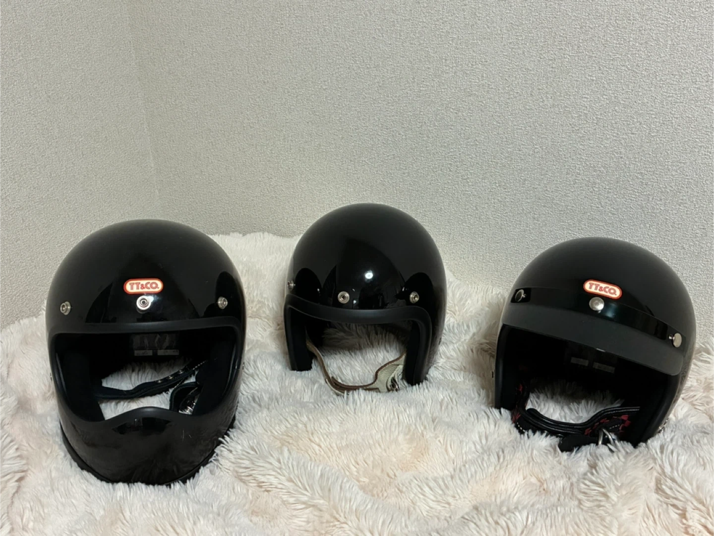 TT&COのバイク用ヘルメット3点です。 ・色:黒 ・ブランド:TT&CO ・種類:ヘルメット スーパーマグナム M/L (57-58cm) 500TX L/XL (59-59cm) トゥーカッター M/L (58-59cm) 各4000円(まとめ買いの場合割引可) ・状態:使用感あり 中古品であることをご了承ください。