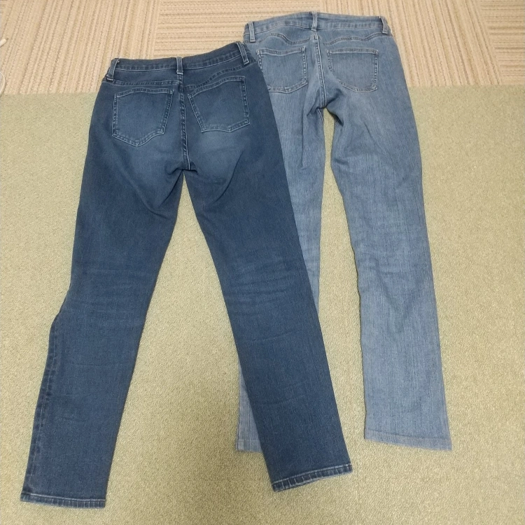 UNIQLOのスキニーデニム2本セットです。 濃いブルーはサイズ25 ハイライズ、2wayストレッチ、股下短め 薄めのブルーはサイズ26 ミドルライズ、ウルトラストレッチ、股下普通(?) サイズが違いますが、履いた感じはほぼ変わらず、同じ時期(太る前…)に着用していたのでセットにします。 着用回数はそんなに多くなく、全体的に状態は良いと思います。 ストレッチ効いていてシルエットもキレイで、足が細く見えます。サイズが合えばとてもおすすめです! どなたかぜひ!