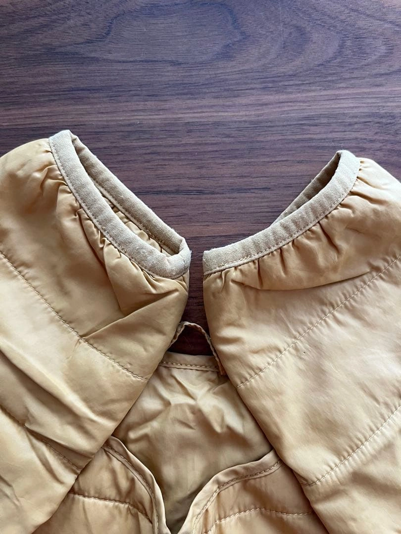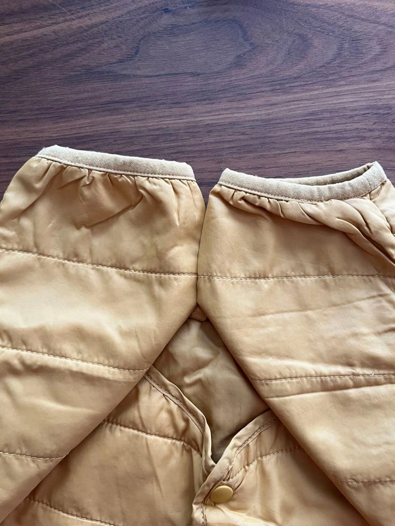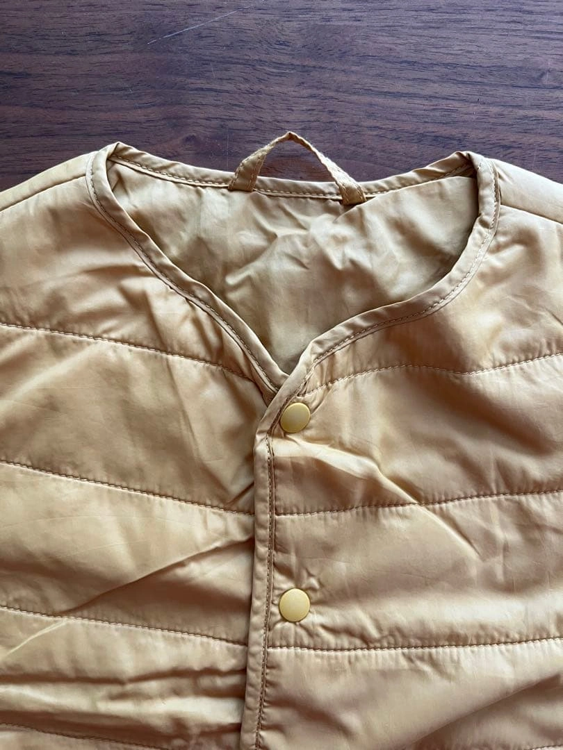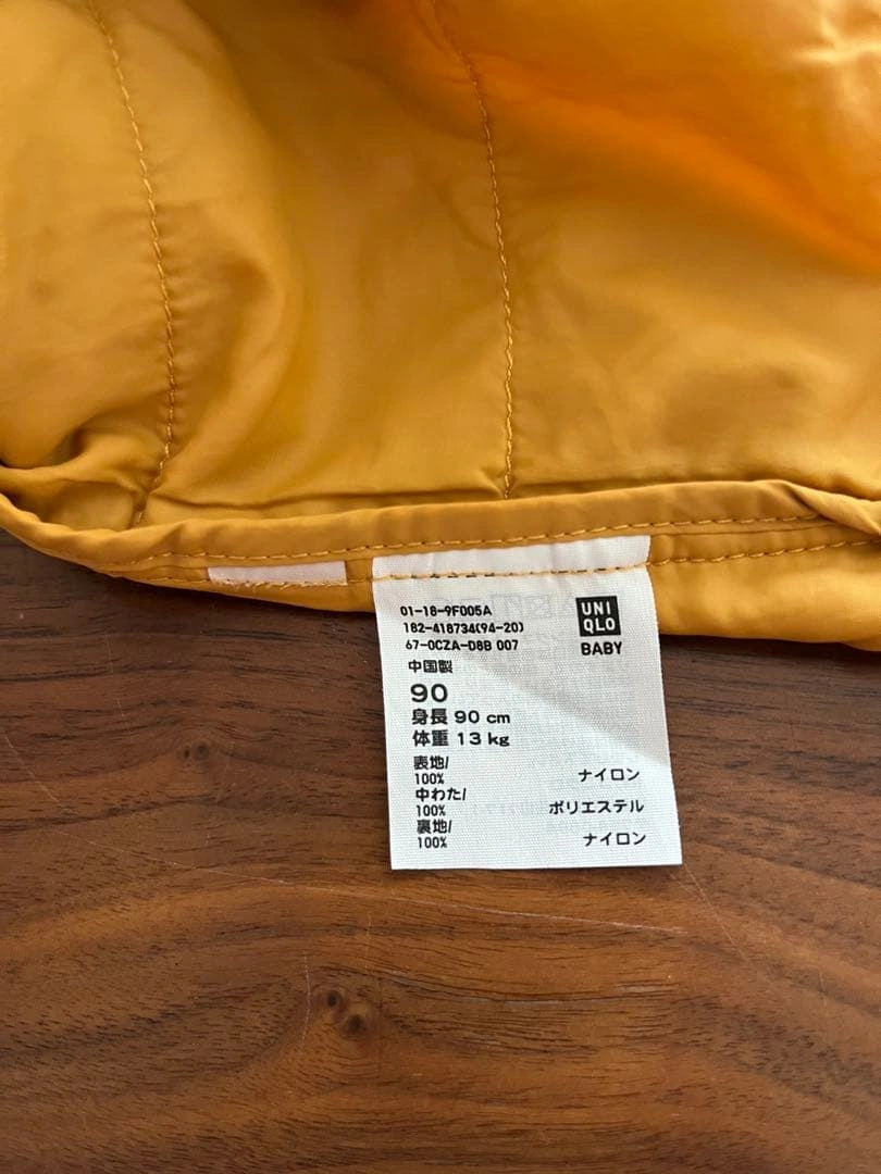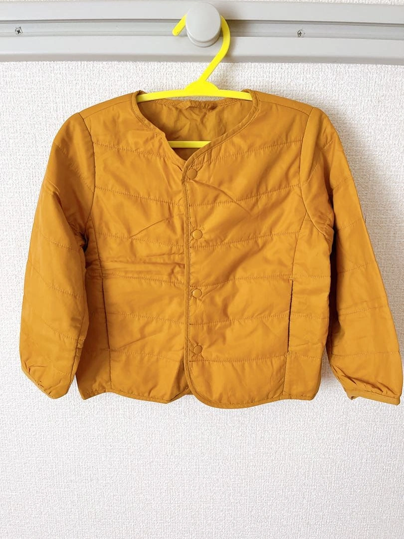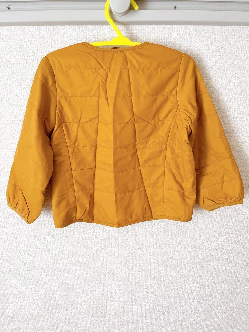 ユニクロのベビー用キルティングジャケットです。 軽くてあたたかく、これからの季節にぴったり。 シンプルなデザインなので男女問わず着ていただけます。 スナップボタンで着脱も簡単です。 首元に輪っかがついている為、掛けておく時に便利です。 名前のタグは切ってあります。 【カラー】 マスタード(イエロー系) 【サイズ】 90cm 【素材】 表地:ナイロン100% 中わた:ポリエステル100% 裏地:ナイロン100% 【状態】 大きな汚れや傷はなく、比較的きれいな状態です。 まだまだ着ていただけます。 (あくまでも中古品ですのでご理解のある方のみお願いします) 受け渡し場所は、綱島駅、新綱島駅でも 可能です。