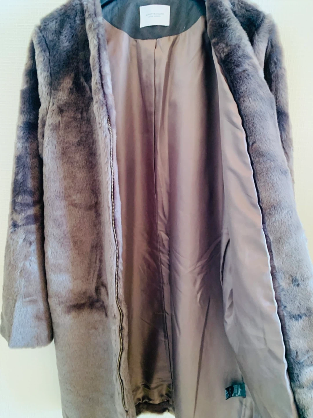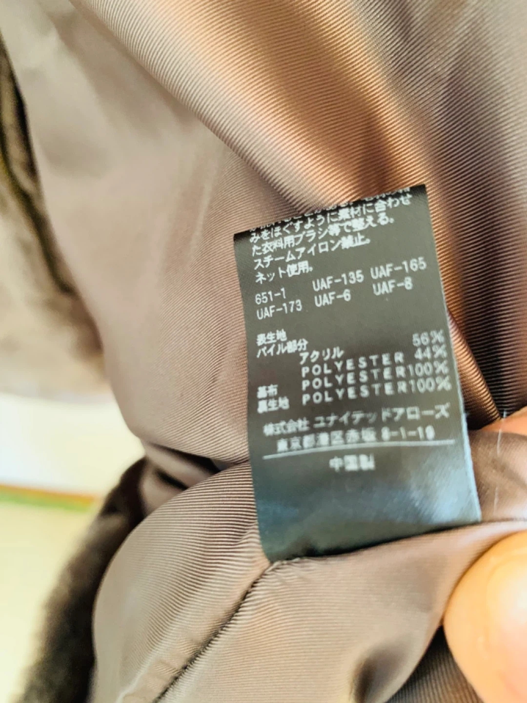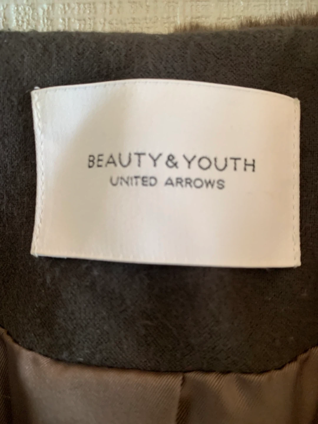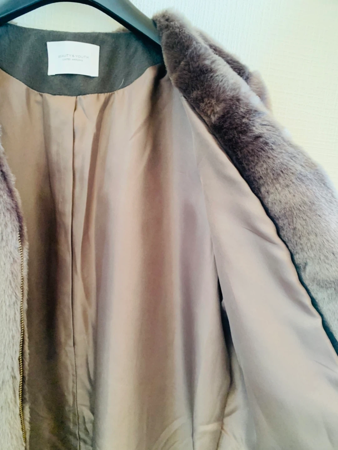 カーキブラウン系の軽く温かい、お洒落なフェイクファーコート。 全面ファスナー、ノーカラーデザインが特徴です。 - ブランド: BEAUTY&YOUTH UNITED ARROWS - 色: カーキブラウン系 - 素材: フェイクファー アクリ ル56%、ポリエステル44% - スタイル: ハーフコート - デザイン: ノーカラー 肩幅/身幅/袖丈/着丈 肩幅···38cm 身幅···46cm 袖丈···60cm 着丈···95cm 汚れ・破れ・臭いなど···なし 手数料、送料込、自宅保管品。 大変温かくお洒落で気に入って購入しましたが、殆ど(1〜2回?)着用していません。他コートを多用している為、素敵に着こなして下さる方にお譲り出来たらと思います。
