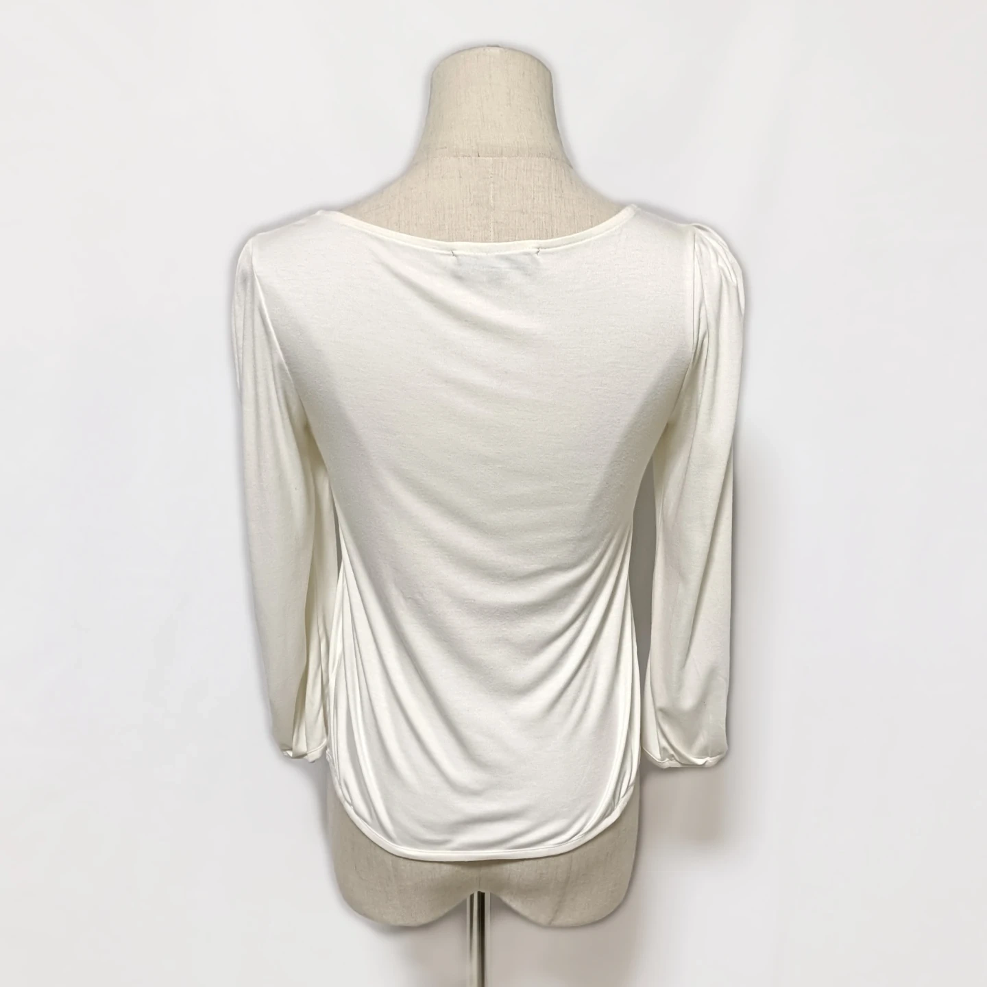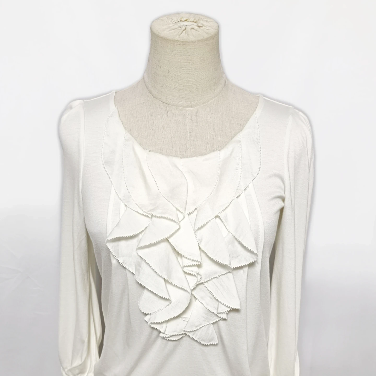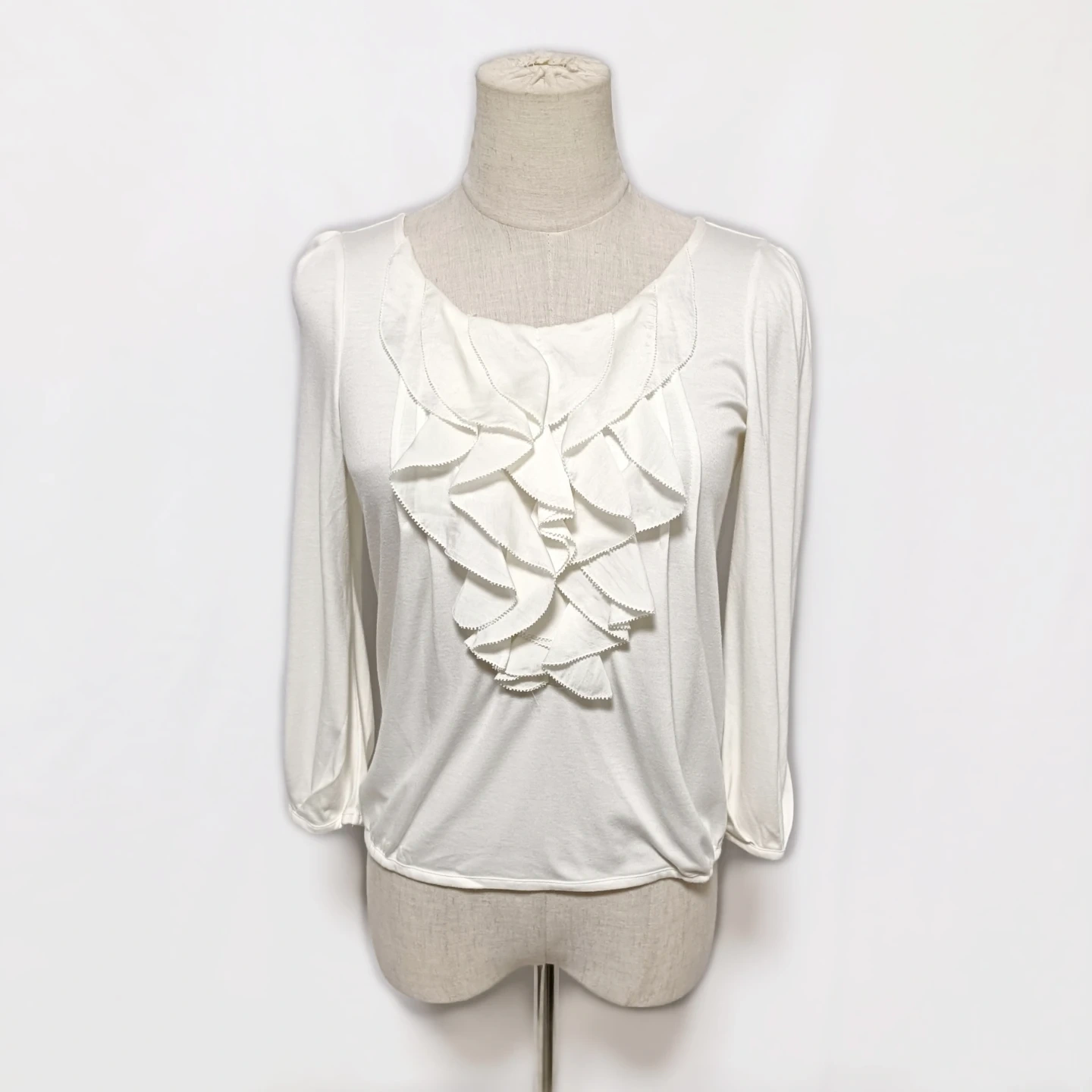 ご覧いただきありがとうございます! ​​​アンタイトルの、胸元のボリュームフリルが華やかなカットソーブラウスです。 上品なホワイトカラーと、とろみのある柔らかな生地感で、1枚で着てもジャケットのインナーにしても顔周りがパッと明るくなります。 通勤などのオフィススタイルはもちろん、お子様の学校行事やセレモニー、発表会など、きちんとした場面でも重宝する一着です。 ​ □商品名□ ​UNTITLED アンタイトル フリルブラウス 1 きれいめ 通勤 清楚 □ブランド□ UNTITLED アンタイトル □表記サイズ□ 1(Sサイズ相当) □実寸サイズ(cm) □ 着丈:48 肩幅:36 身幅:40 袖丈:47 ※実寸につきまして多少の誤差はご了承ください。 ※表記サイズだけではなく実寸のサイズをご確認ください。 □カラー□ ホワイト □素材□ 本体:レーヨン70%、ポリエステル30% ​別布:ポリエステル100% □コンディション□ 目立った汚れやダメージなど特にございません。 ※汚れはできる限り写真にて掲載しております。まずは画像をご確認ください。 どうぞよろしくお願い致します。 □商品管理番号□ HH3-R-5643