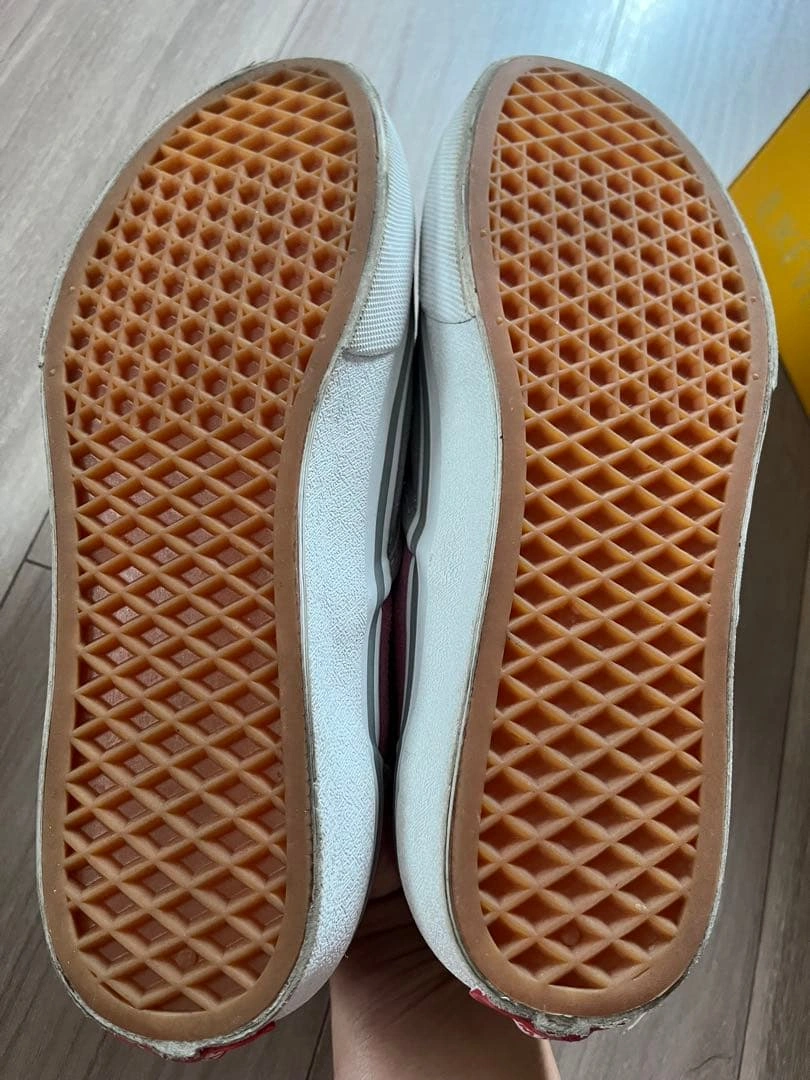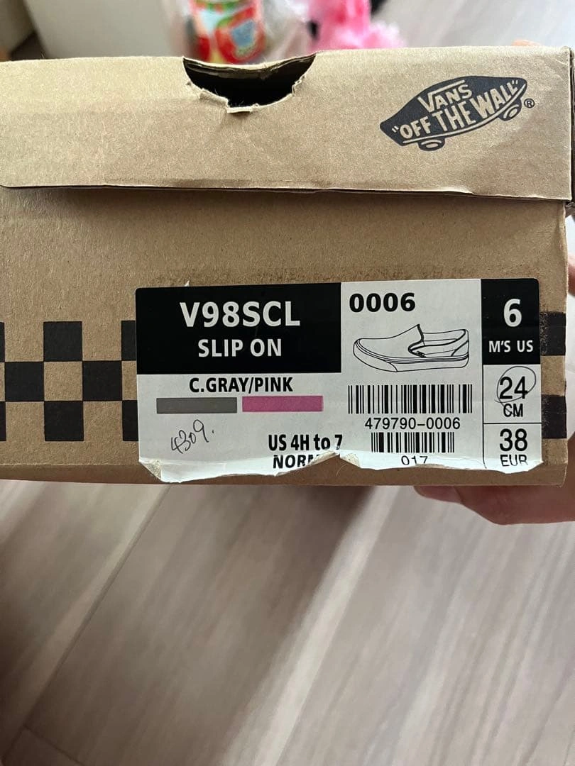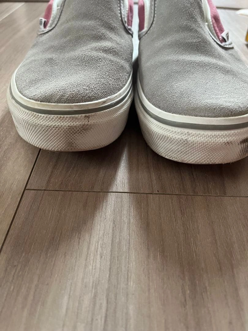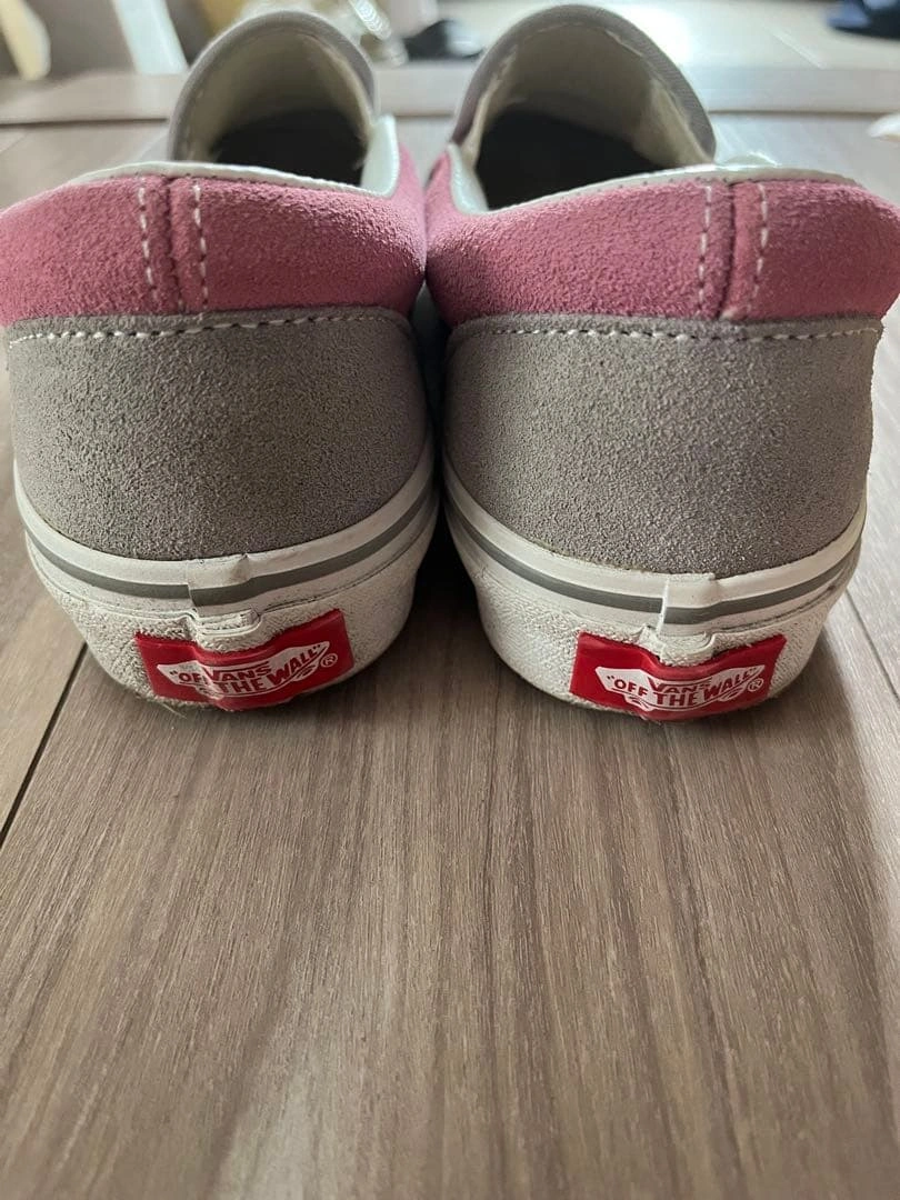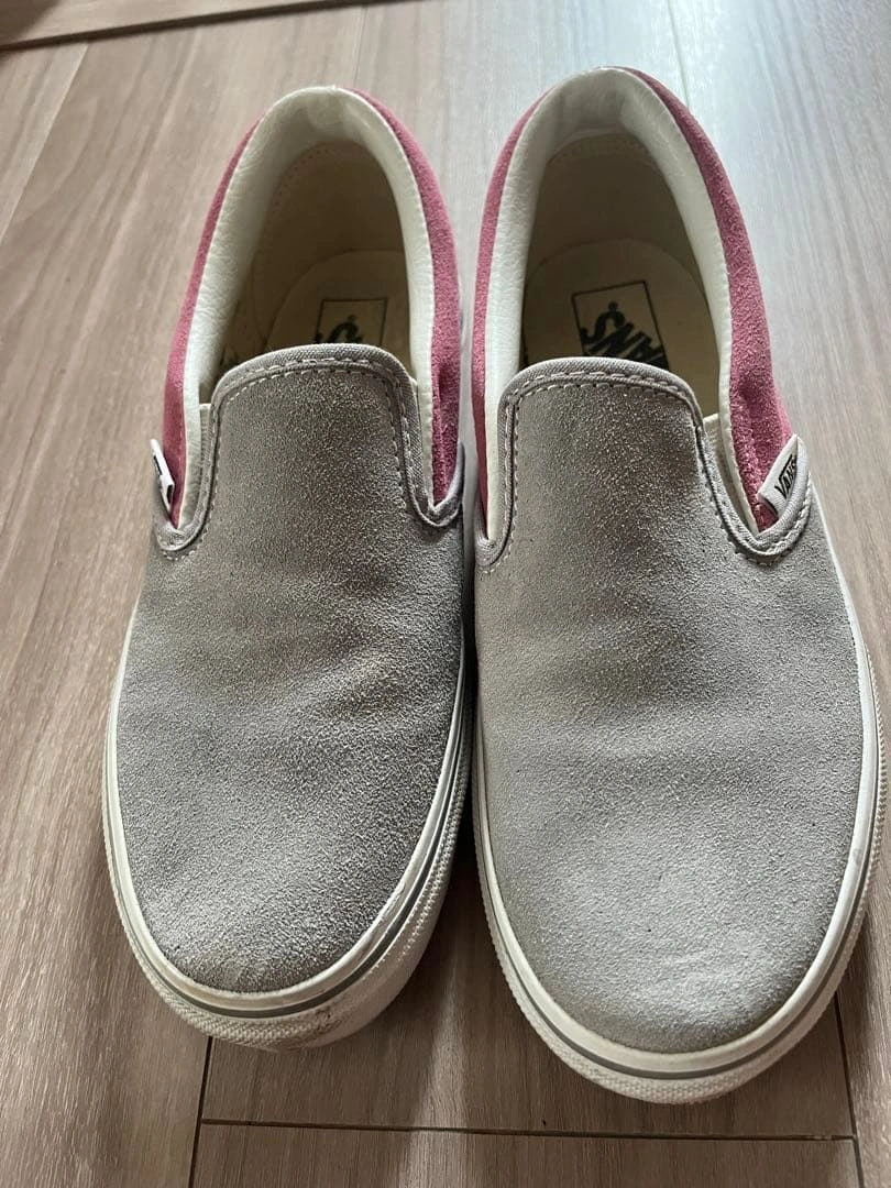 グレーとピンクのスエード素材のスリッポンスニーカーです。 - ブランド: Vans - カラー: グレー/ピンク - スタイル: スリッポン - 素材: スエード - 特徴: オフホワイトのソール ご覧いただきありがとうございます。 使用回数少ないですがつま先に若干汚れがあります。 カラー···ピンク系 ご希望の方はお気軽にご連絡ください。