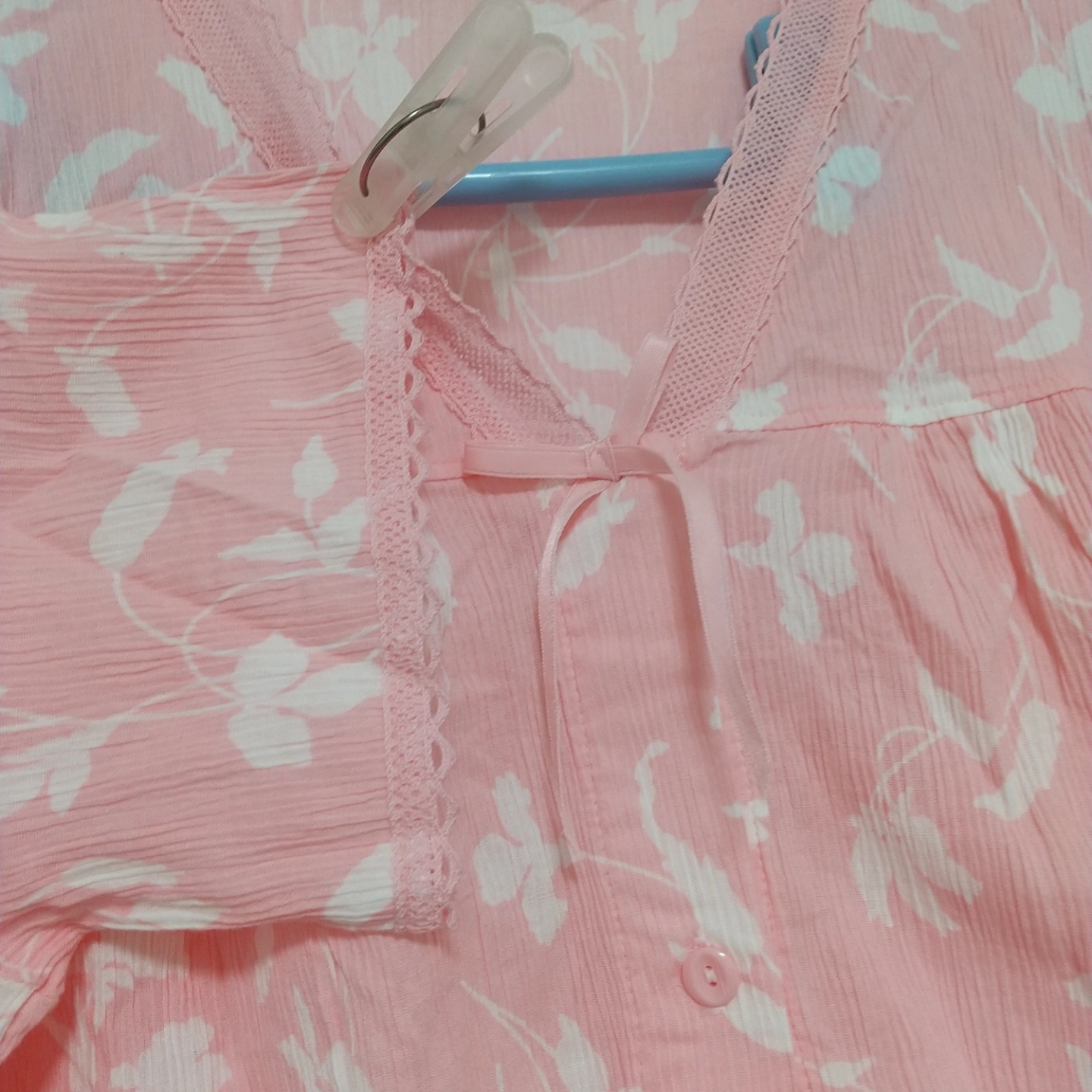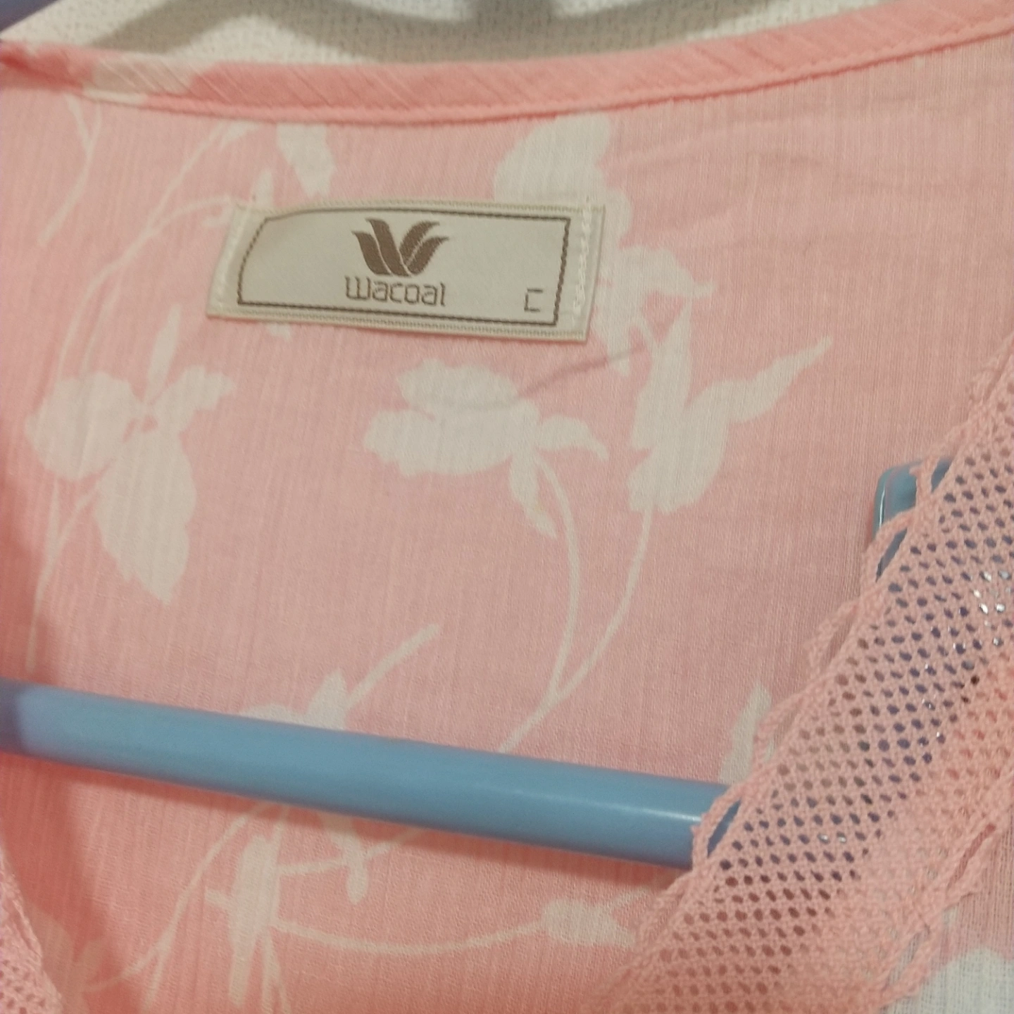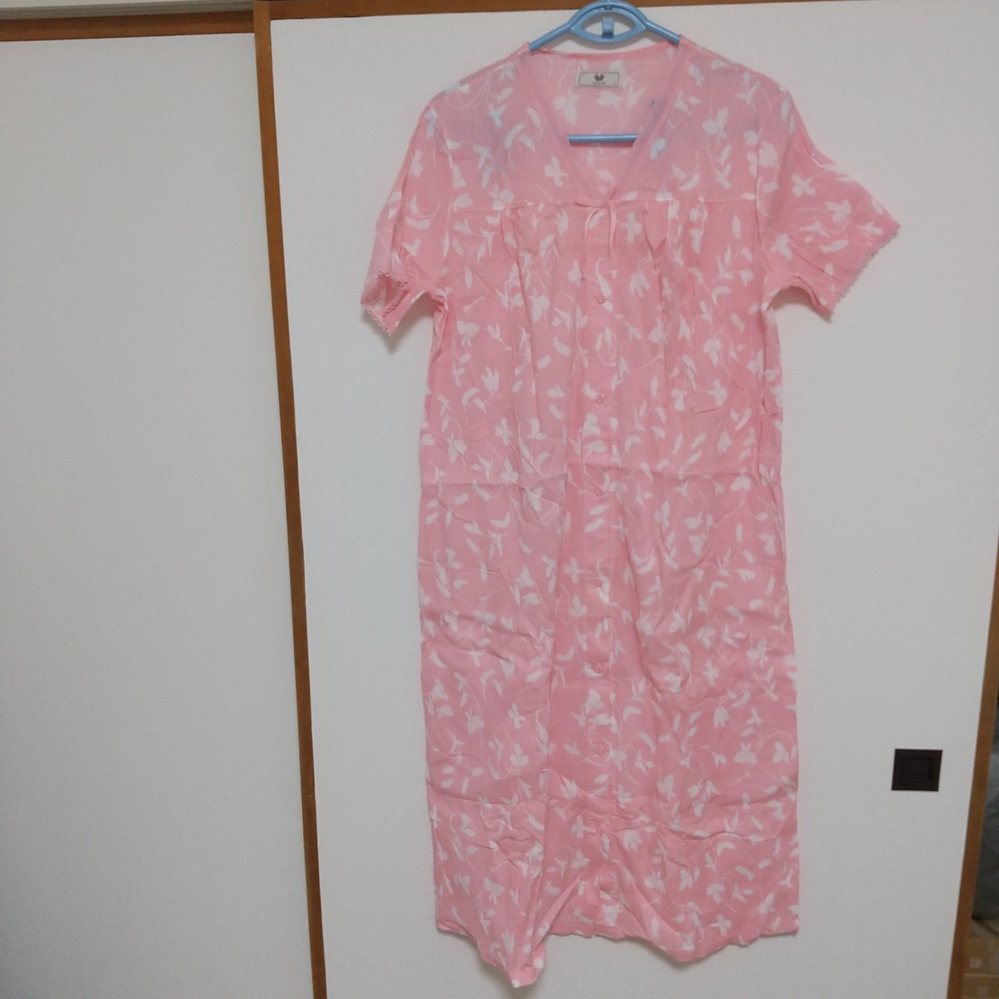 Wacoalのワンピースタイプのルームウェア ピンク地に白抜きの花柄(?) Lサイズ 着丈:約115cm、身幅:約51cm (シワ加工されており、横に伸縮性があります) 綿100% 一度だけ着用しました。 夏によさそうな、涼しげな生地で、 レトロな感じが可愛いです。 前がボタンで全開しますので、 入院用や、マタニティ、授乳中の方にも よろしいかと思います(^_^) ナイティ ワンピース パジャマ ネグリジェ 前開き