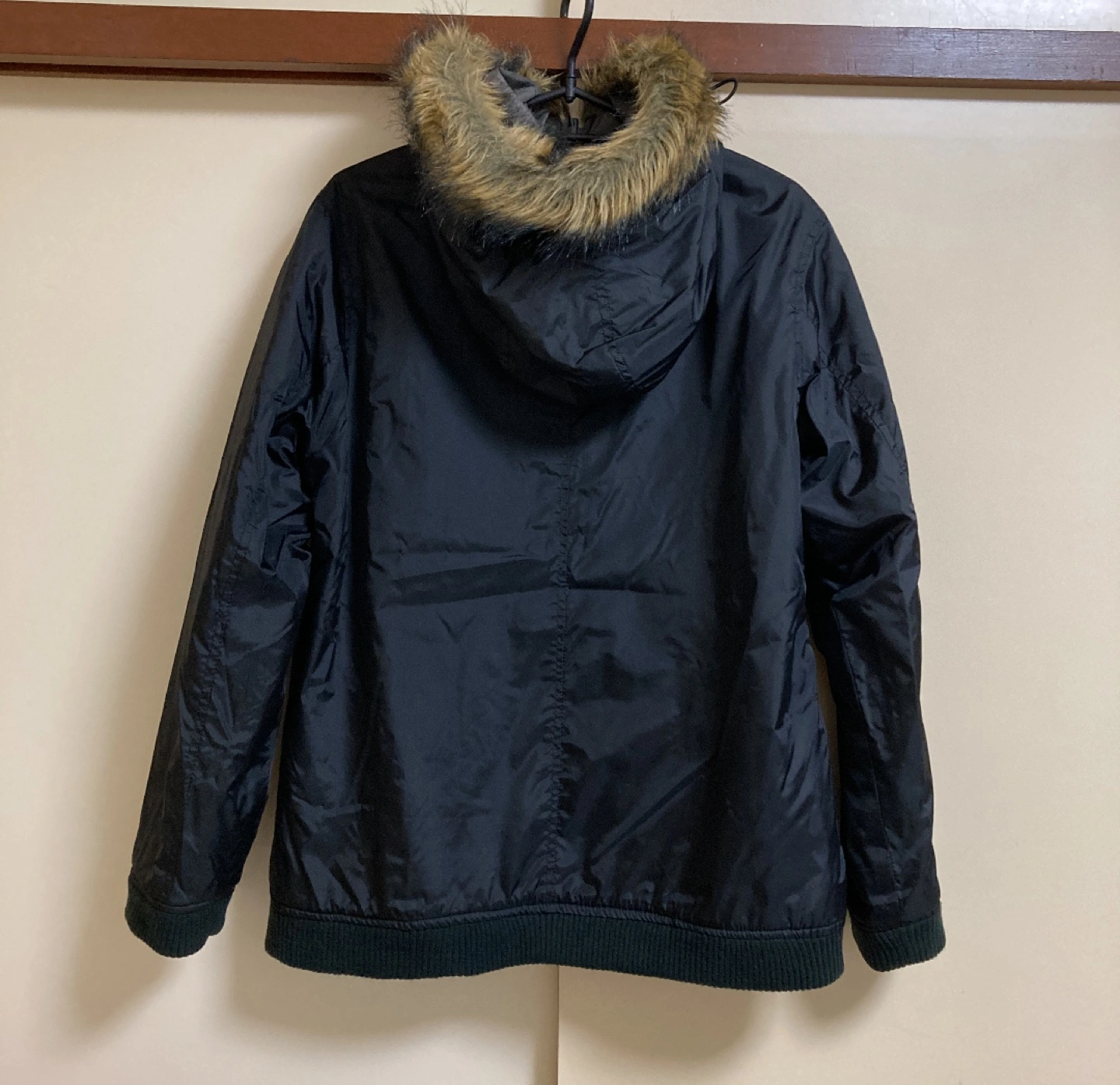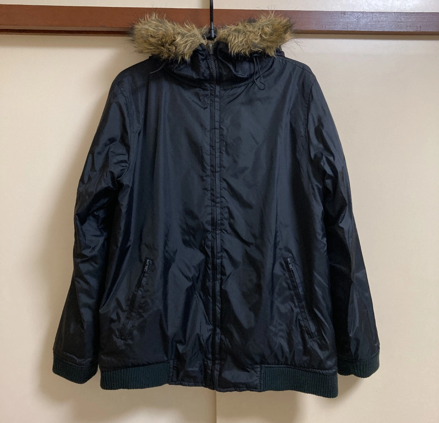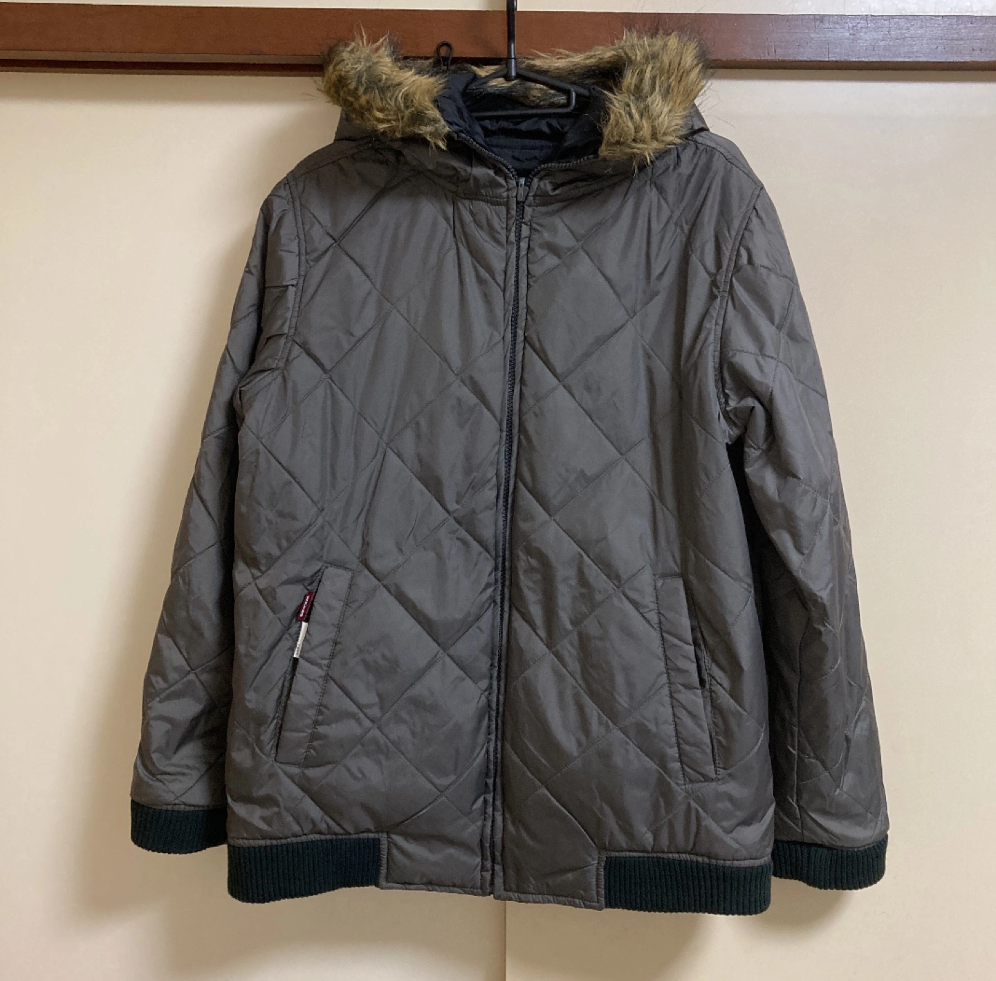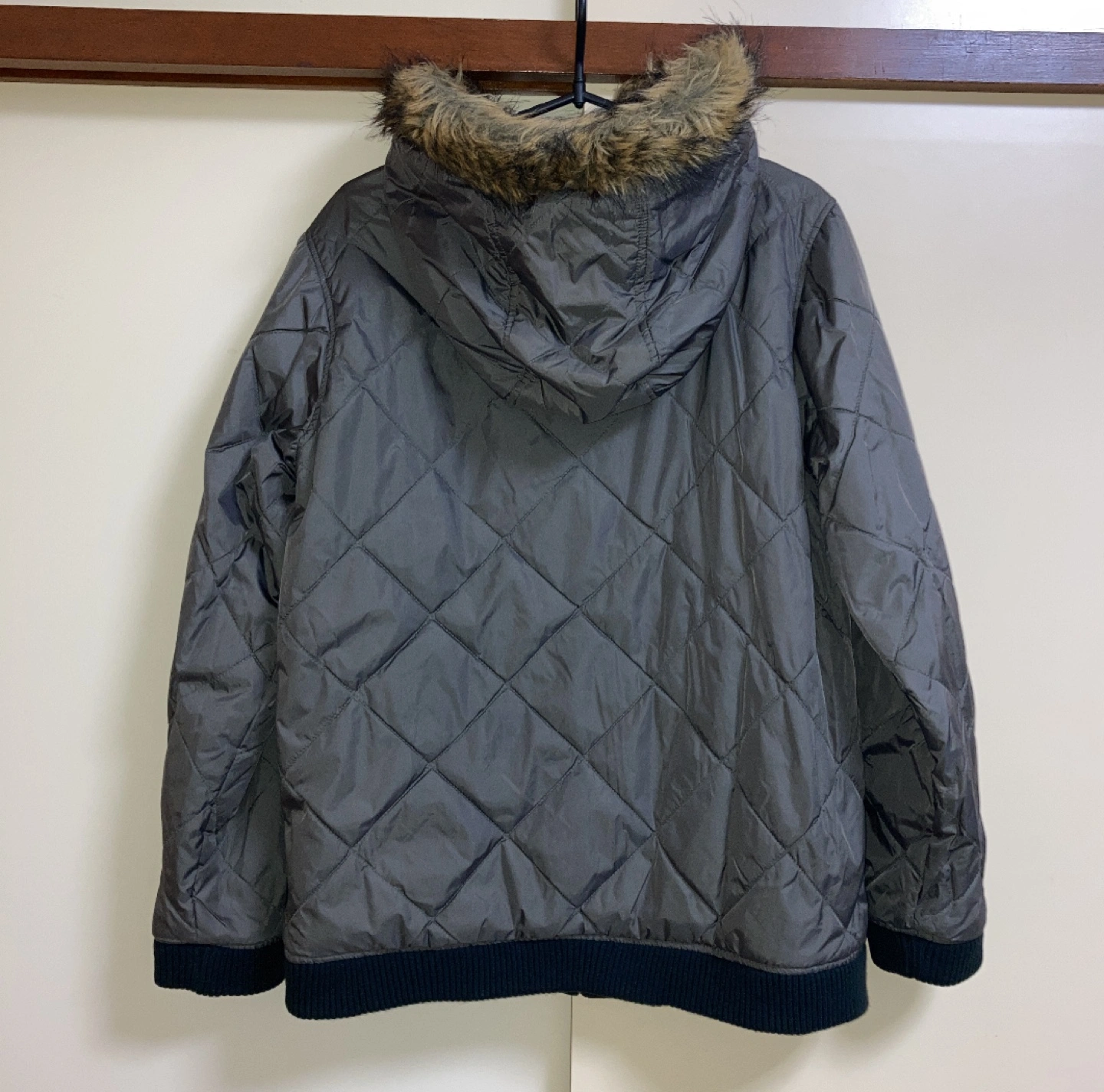 ブラックムジ×グレーのキルティングのリバーシブルナイロンコートです。 キルティングは9枚目に近い色味です。 フード部分調節可能(8枚目) 数回着用。 フェイクファーがボサボサしています。 ZIPの金具部分、色剥げあり(10枚目) 少し使用感あり。 ★表地 ナイロン 100% 裏地 ナイロン 100% 中綿 ポリエステル 100% ファー部分 アクリル 100% リブ部分 アクリル 100% ★フリーサイズ ★身幅 55 身丈 66 ※画像の商品は光の照射や角度、お使いのモニター環境により、実物と色味が異なる場合がございます