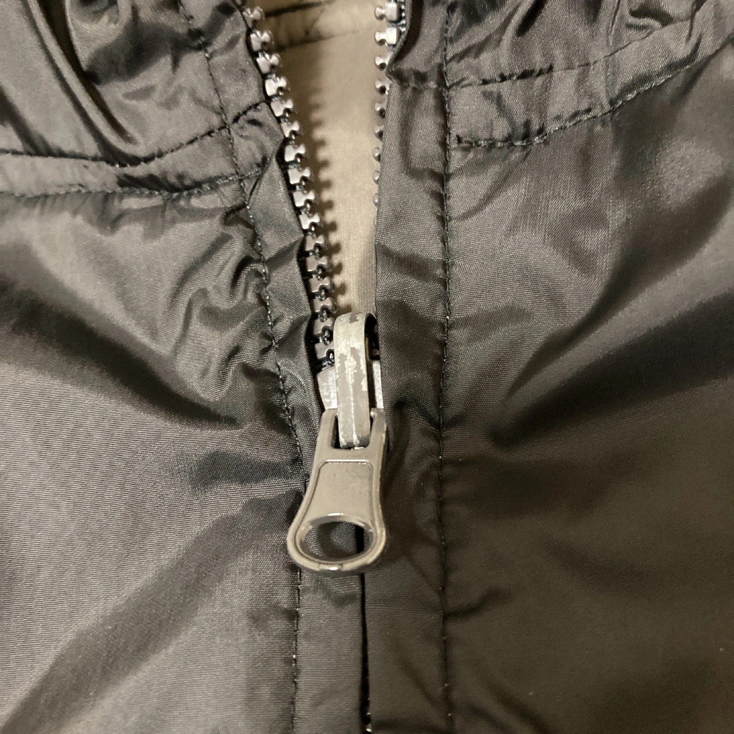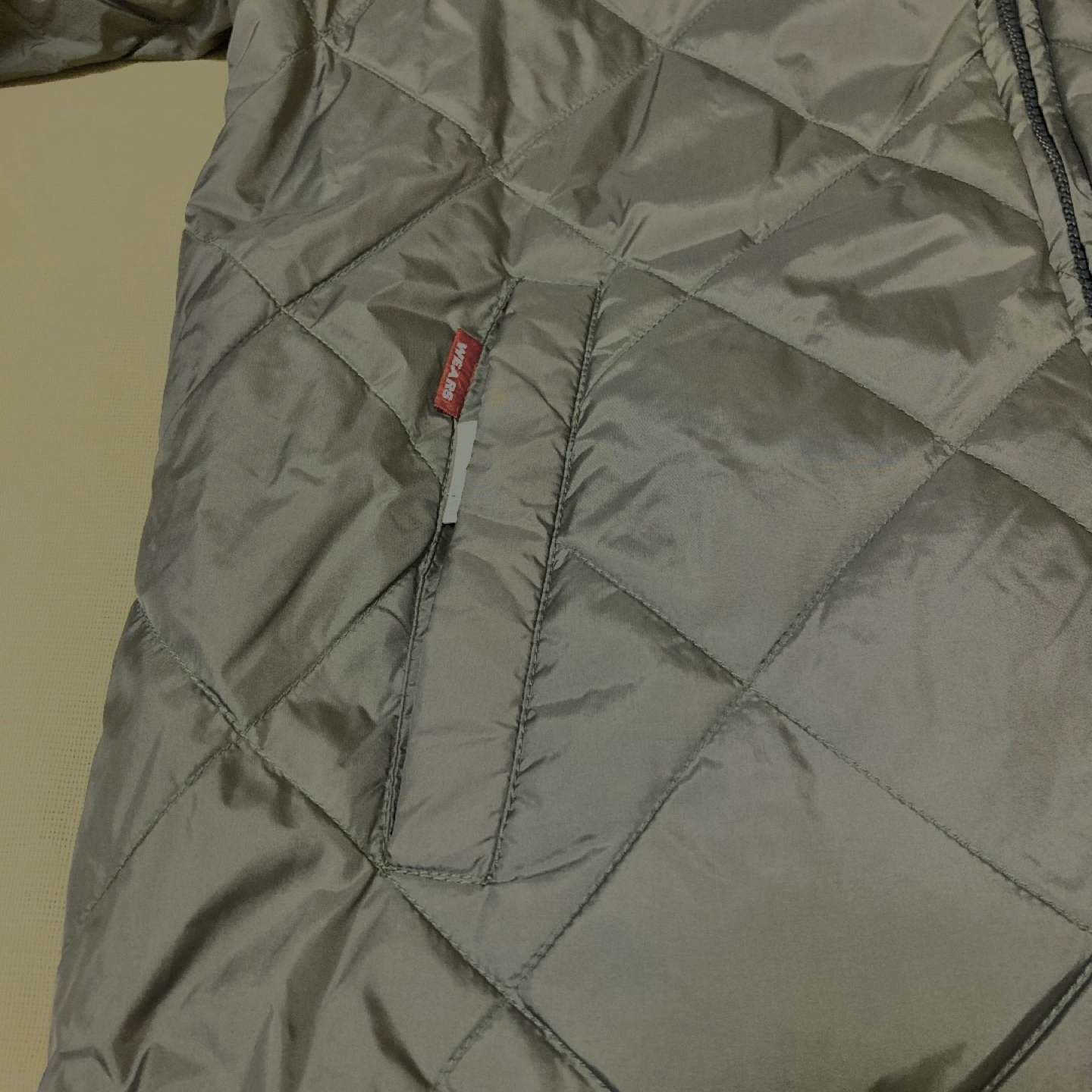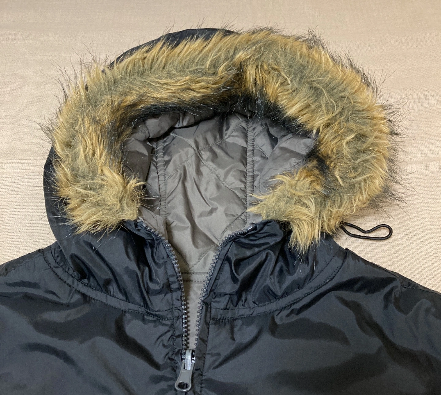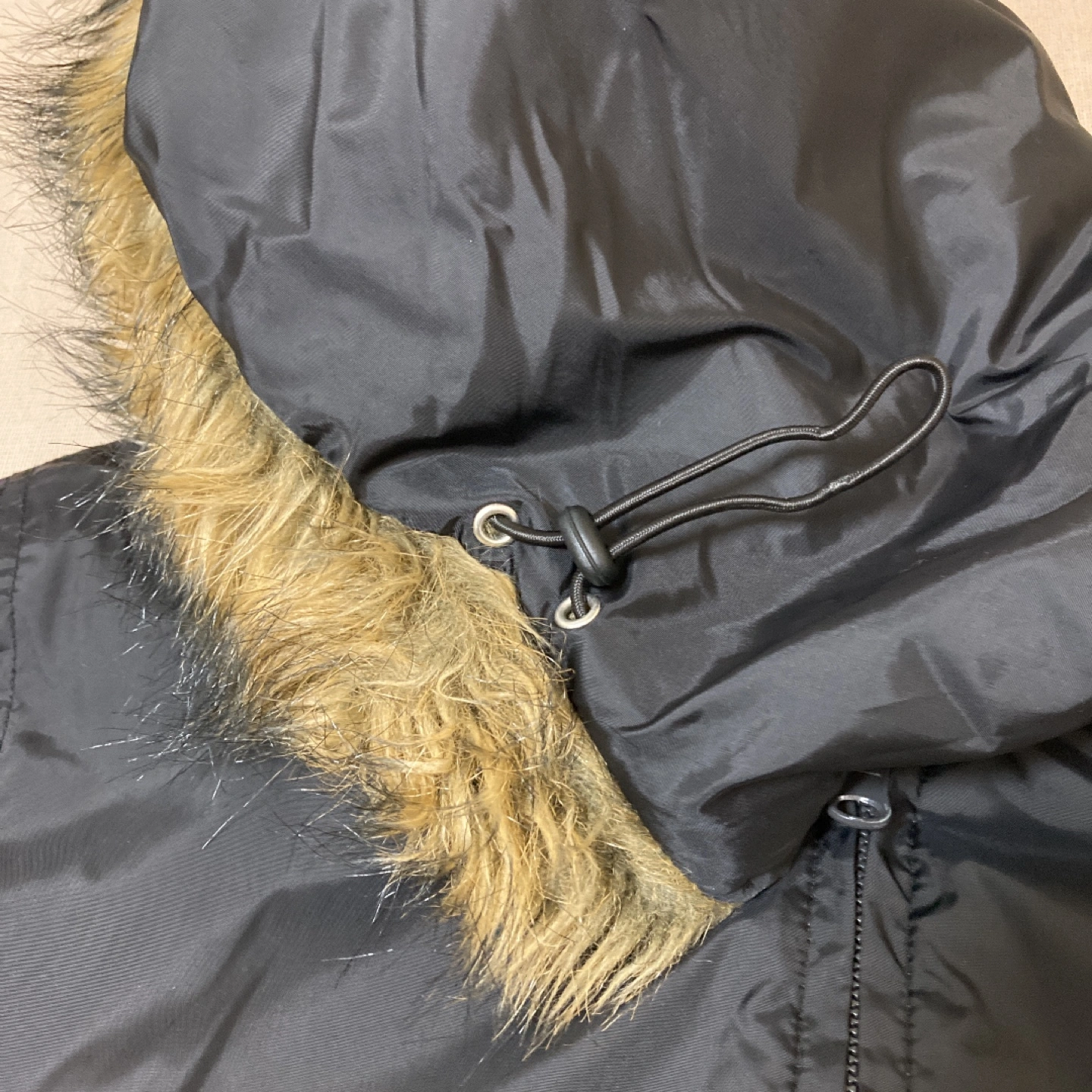 ブラックムジ×グレーのキルティングのリバーシブルナイロンコートです。 キルティングは9枚目に近い色味です。 フード部分調節可能(8枚目) 数回着用。 フェイクファーがボサボサしています。 ZIPの金具部分、色剥げあり(10枚目) 少し使用感あり。 ★表地 ナイロン 100% 裏地 ナイロン 100% 中綿 ポリエステル 100% ファー部分 アクリル 100% リブ部分 アクリル 100% ★フリーサイズ ★身幅 55 身丈 66 ※画像の商品は光の照射や角度、お使いのモニター環境により、実物と色味が異なる場合がございます
