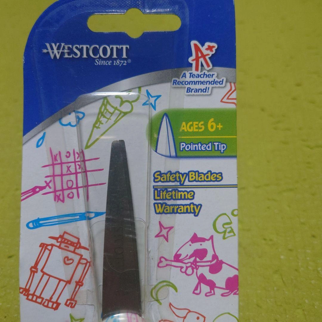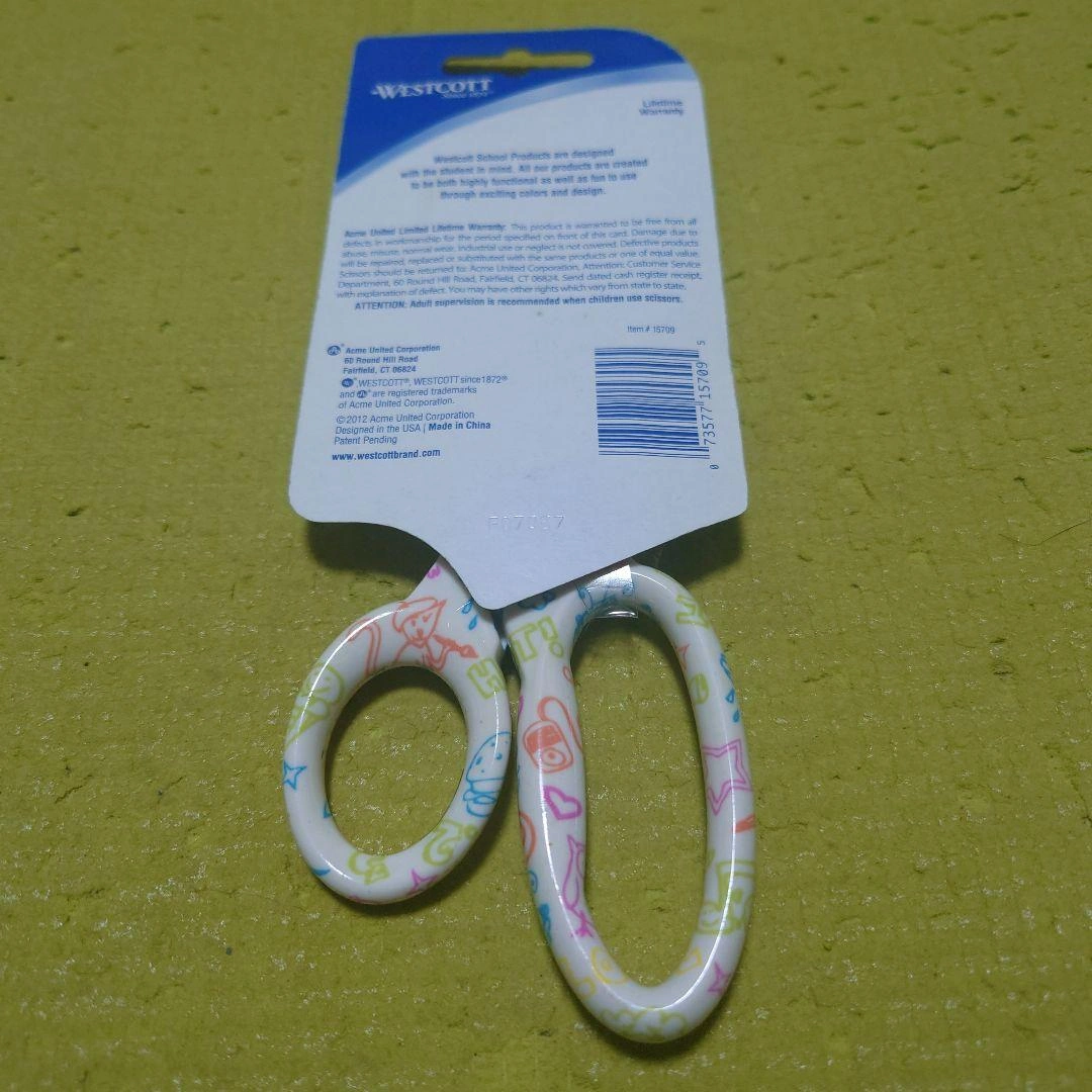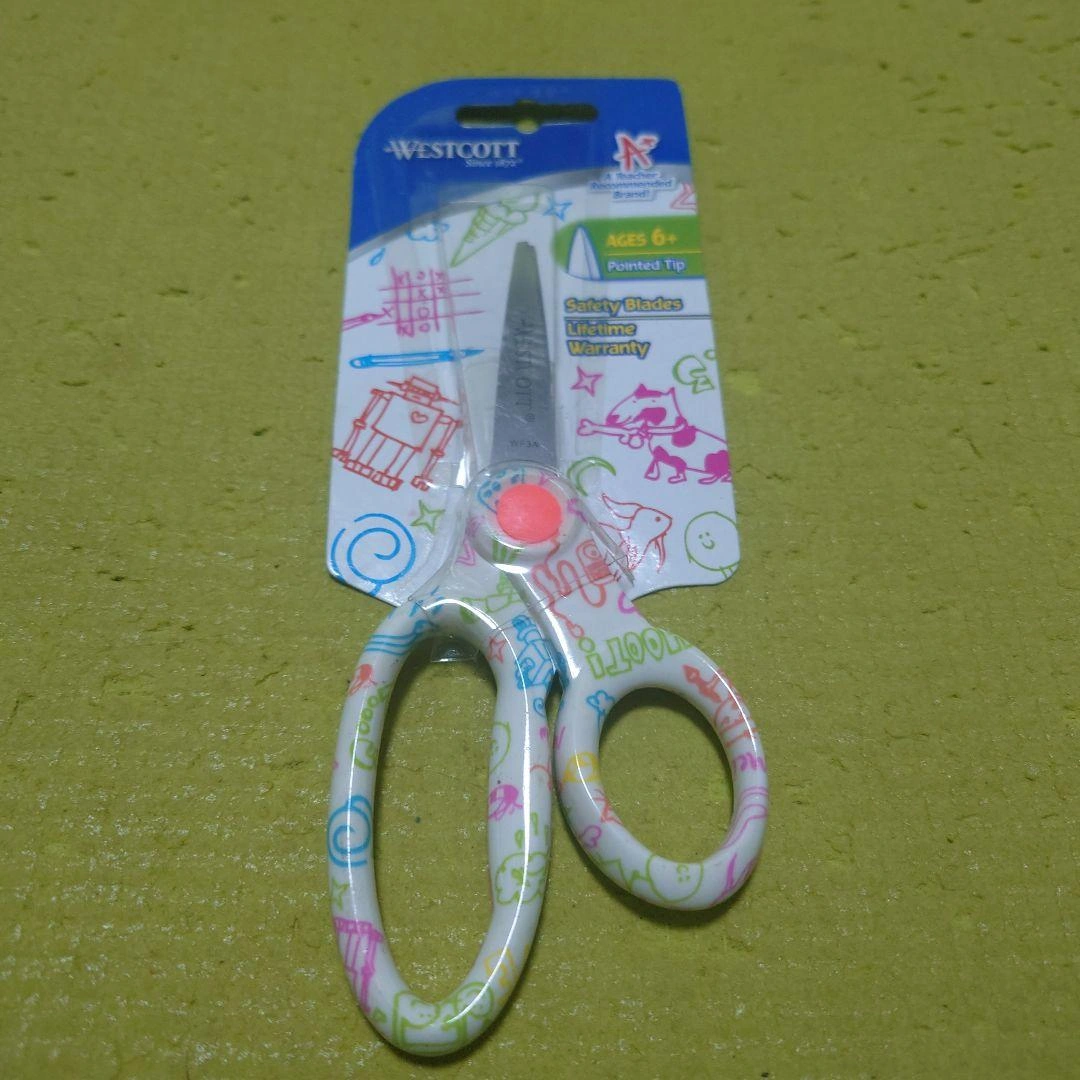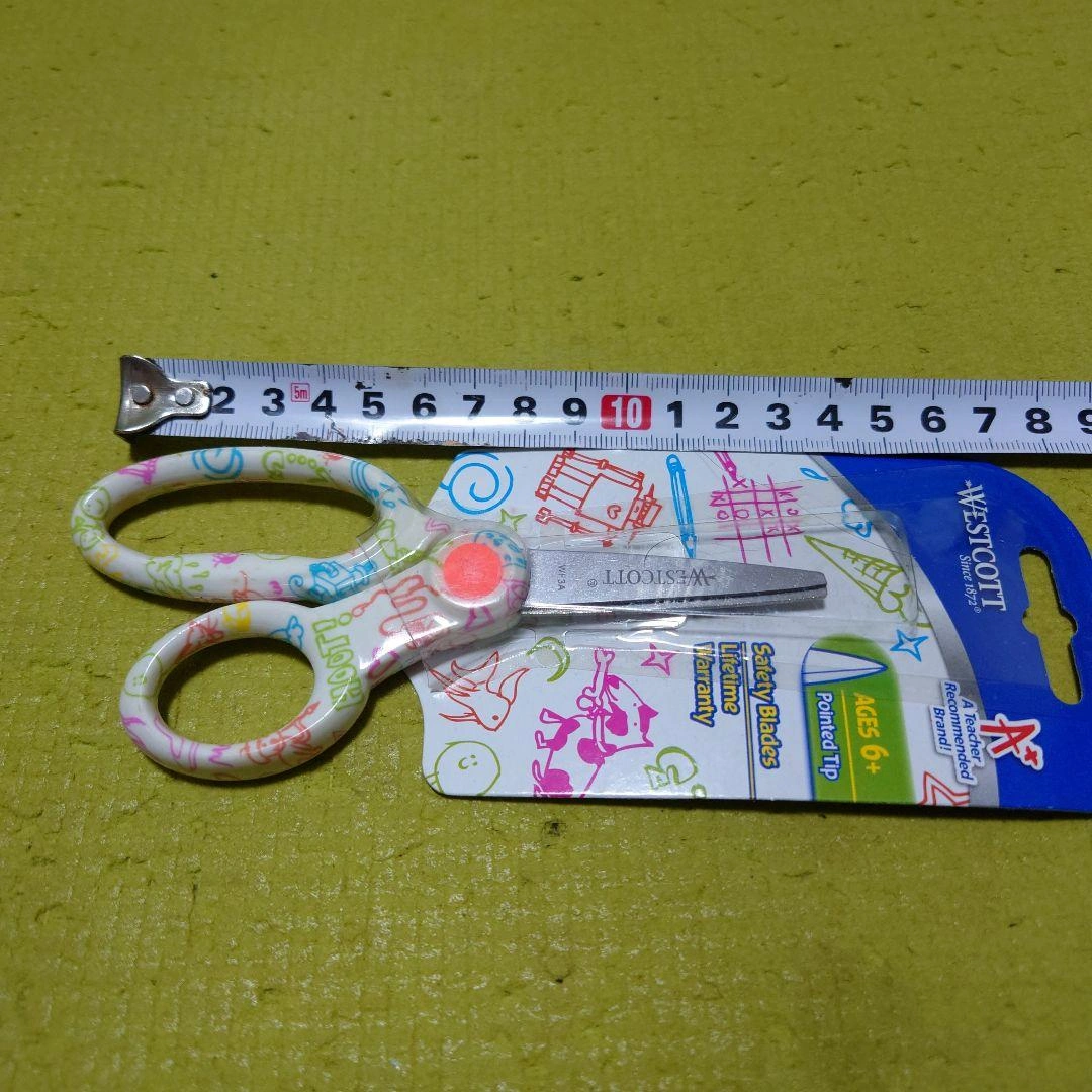刃5.5センチ 【安全性】 このはさみは安全刃を使用しており、子供が使用する際にも安心です。 【デザイン】 カラフルなイラストが施されたデザインで、子供たちに喜ばれる見た目です。 【耐久性】 生涯保証が付いているため、長期間使 用することができます。 - ブランド: Westcott - 対象年齢: 6歳以上 - デザイン: カラフルなイラスト入り - 刃のタイプ: 安全刃 - 保証: 生涯保証 - 先端の形状: 尖った先端 ご覧いただきありがとうございます。