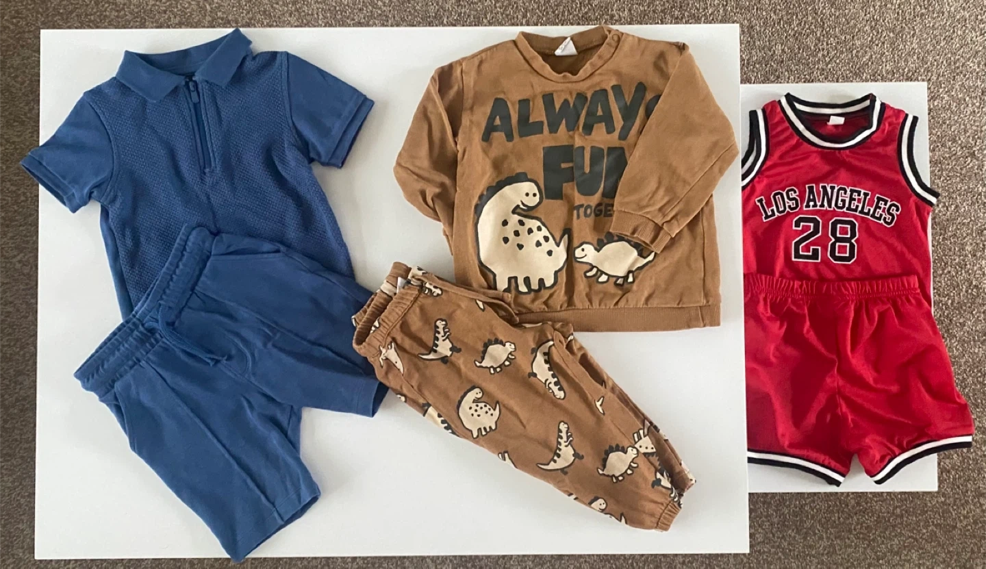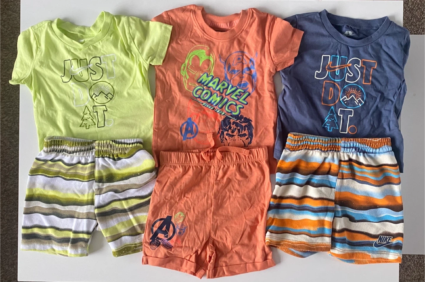 4 reviewsBundle of 12-18 month outfits consisting of 2 sets of Nike shorts and top, one green one blue. 1 set of Marvel shorts and top in orange. 1 North face tracksuit in grey with white logo. 1 next polo shirt and short set in blue. 1 tracksuit in brown with dinosaur print and 1 basketball shorts and vest set printed with Los Angeles 28 in red. All in excellent condition.