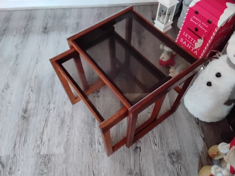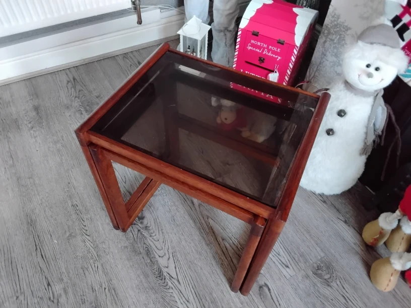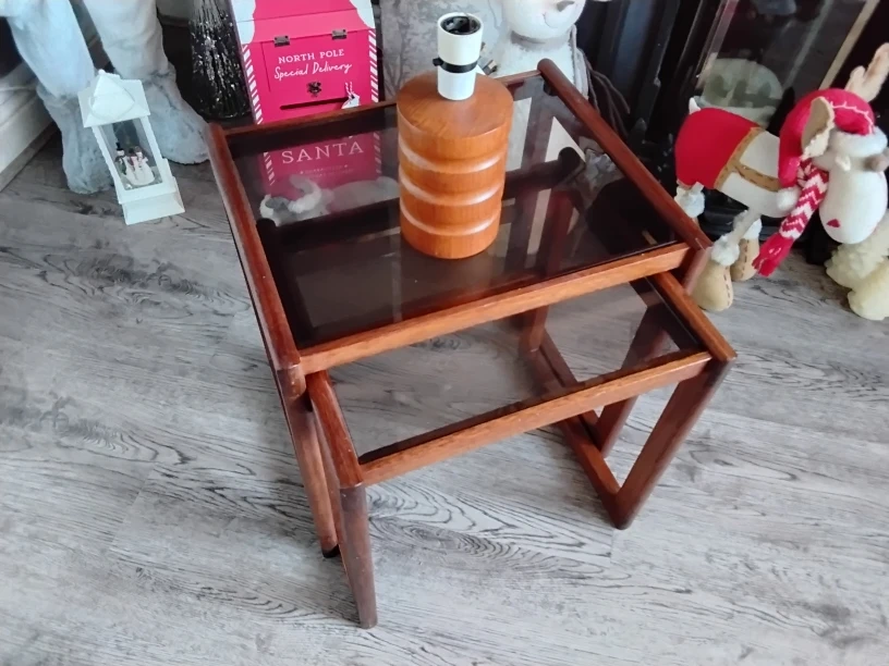 1 reviewPlease read carefully before buying I will include for free the retro Danish ? Wooden table lamp for free only if the full asking price is paid 2 mid century smoked glass side tables Come and take a look with no obligation Cash on collection only Birmingham b26 No postage no returns no other items included