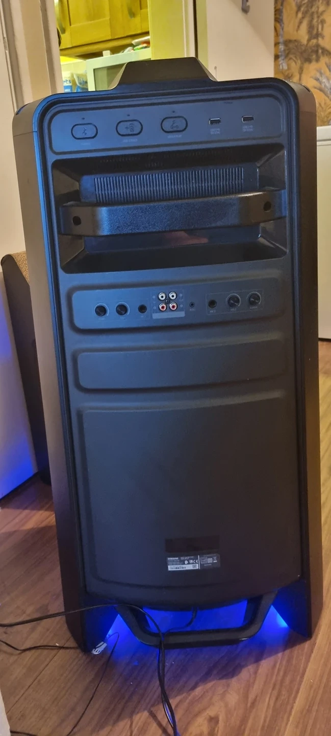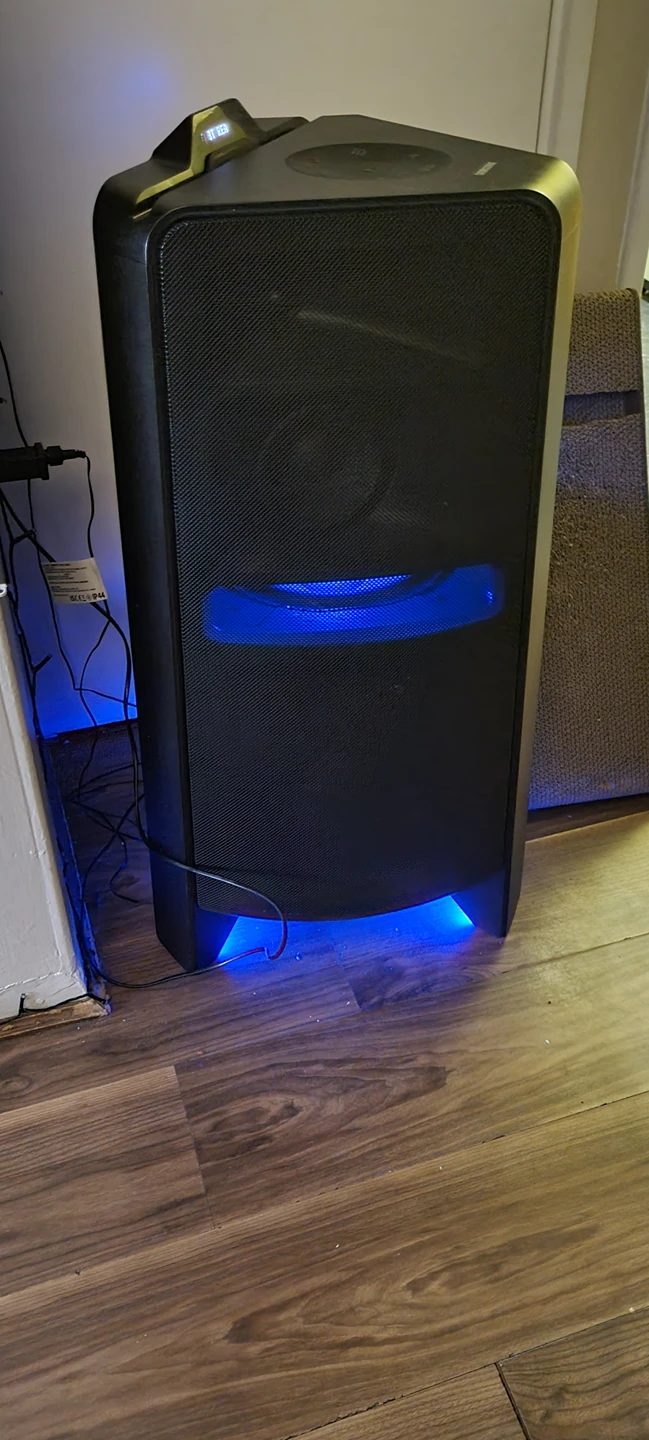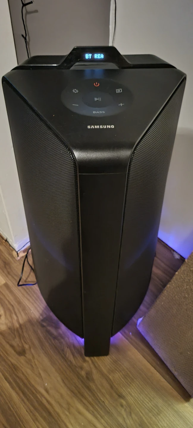 1 review2 x samsung party speakers amazing sound 1500 watts in each speaker powerful and 5 preset light effects bluetooth wireless connectivity to pair both speakers amazing for karaoke to buy they are 550.each. your getting 2 for 550.00.