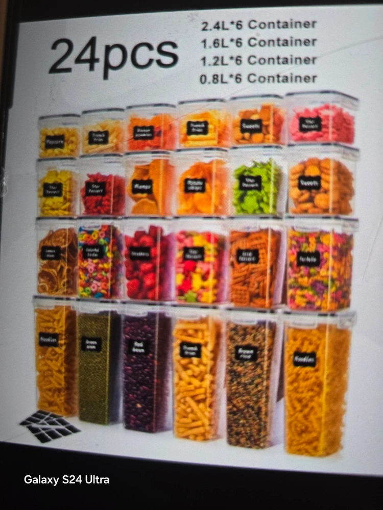 1 reviewSelling a brand new set of 24 food storage containers. The set includes 6 containers each of the following sizes: 2.4L, 1.6L, 1.2L, and 0.8L. Perfect for organising your kitchen and keeping your food fresh!