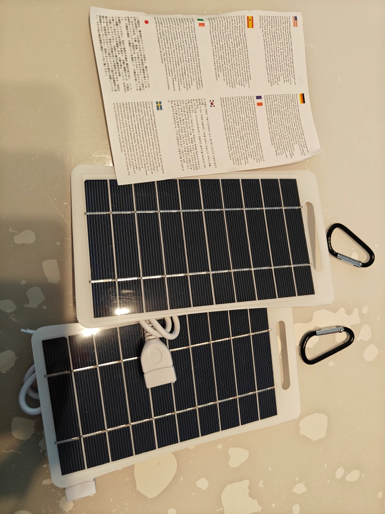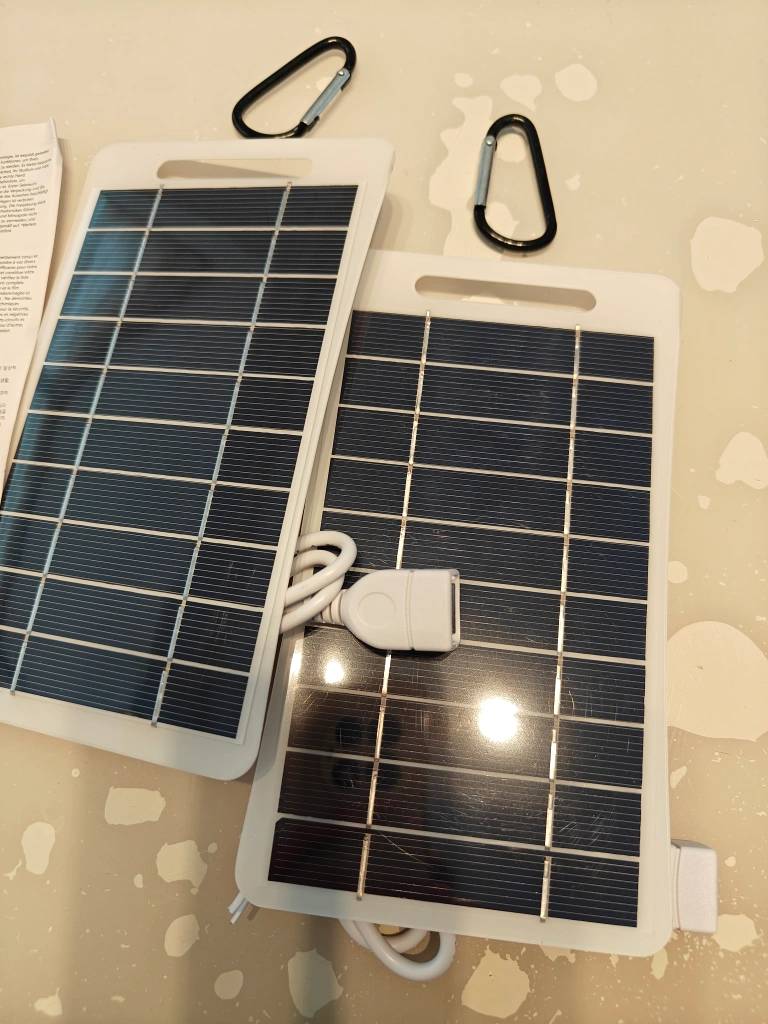 275 reviewsI'm selling 2x portable solar panel chargers. It's perfect for camping or any outdoor activities. It includes a carabiner for easy attachment to your backpack or gear. Please note that there is a clear film protectors on top the panels, to get best out of them as advised please peel them off when use. both brand new, with output power 2-3watts on each.
