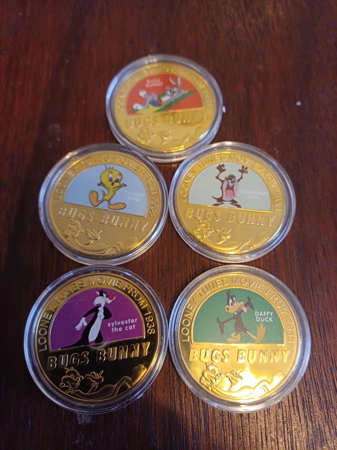 243 reviewsSelling a set of 5 Looney Tunes coins featuring characters from the movie series from 1938. Each coin features a different character like Bugs Bunny, Daffy Duck, Sylvester the Cat, Tweety Bird and Tasmanian Devil. They're in great condition and would be perfect for a collector