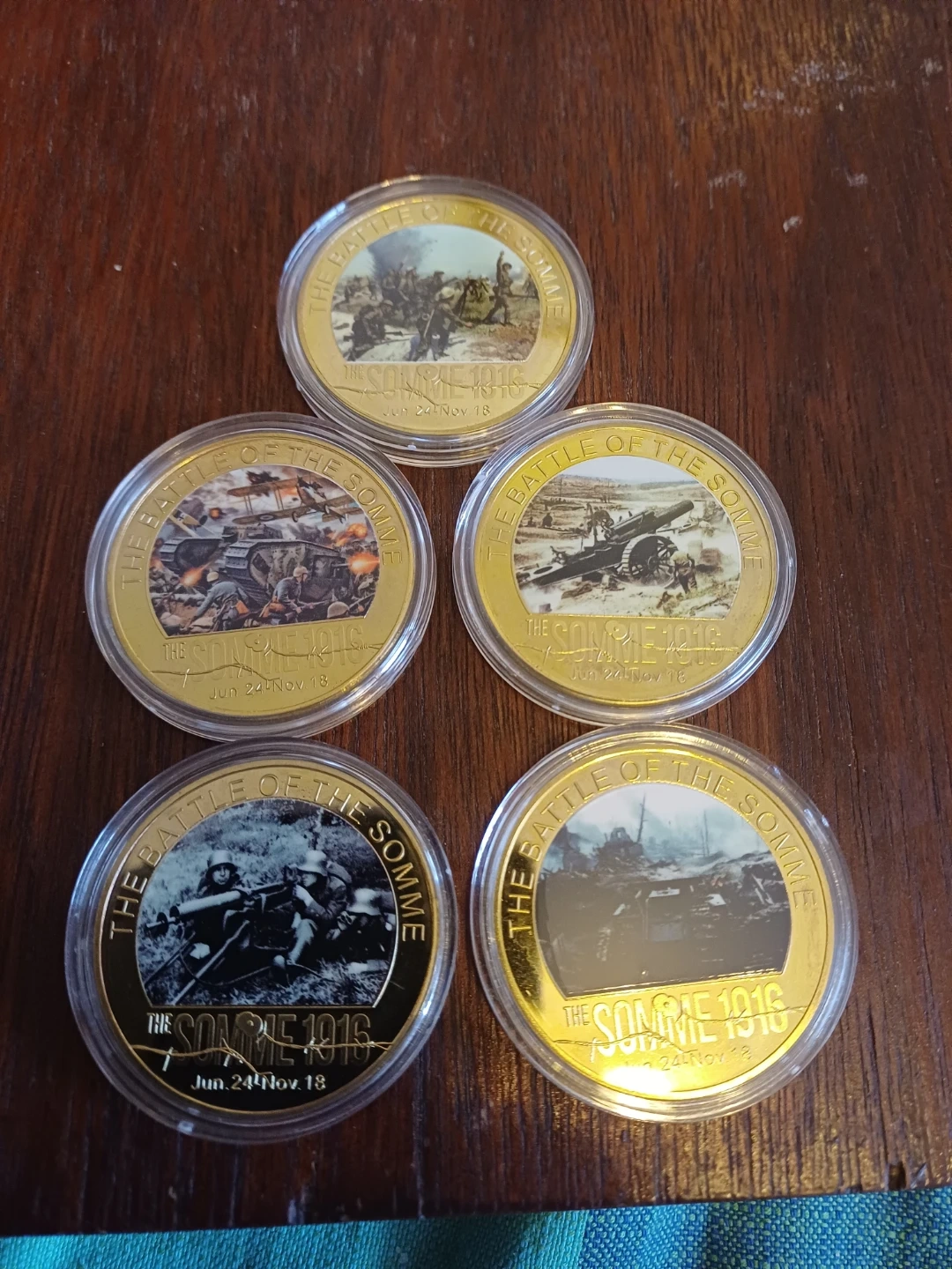 243 reviewsSelling a set of 5 coins commemorating The Battle of the Somme 1916. Each coin depicts a different scene from the battle, dated july 1st November 18th. They are in protective cases.