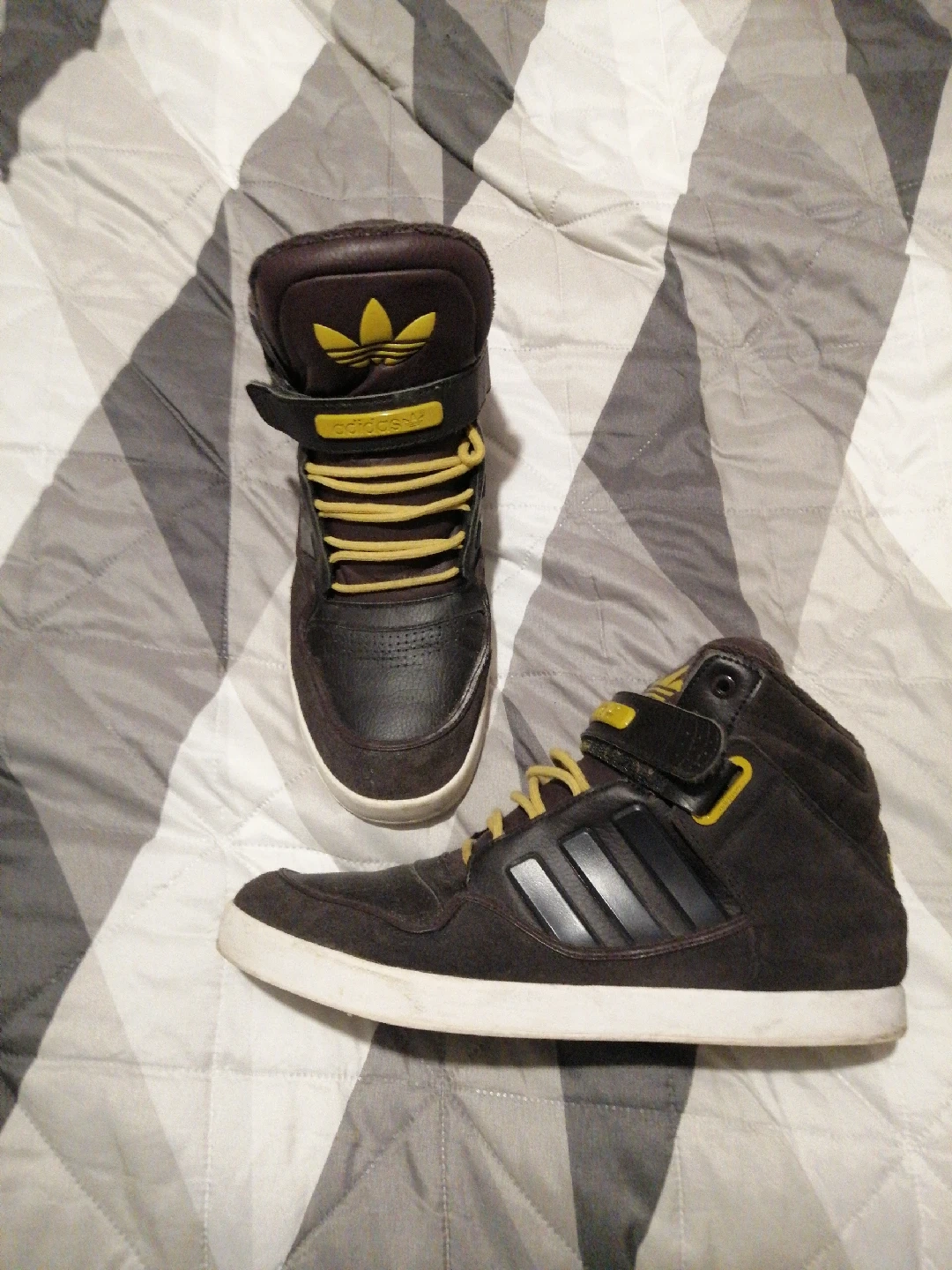 0 reviewsAdidas high top trainers in a dark brown colour with yellow laces and logo. They're in good condition and ready for a new home
