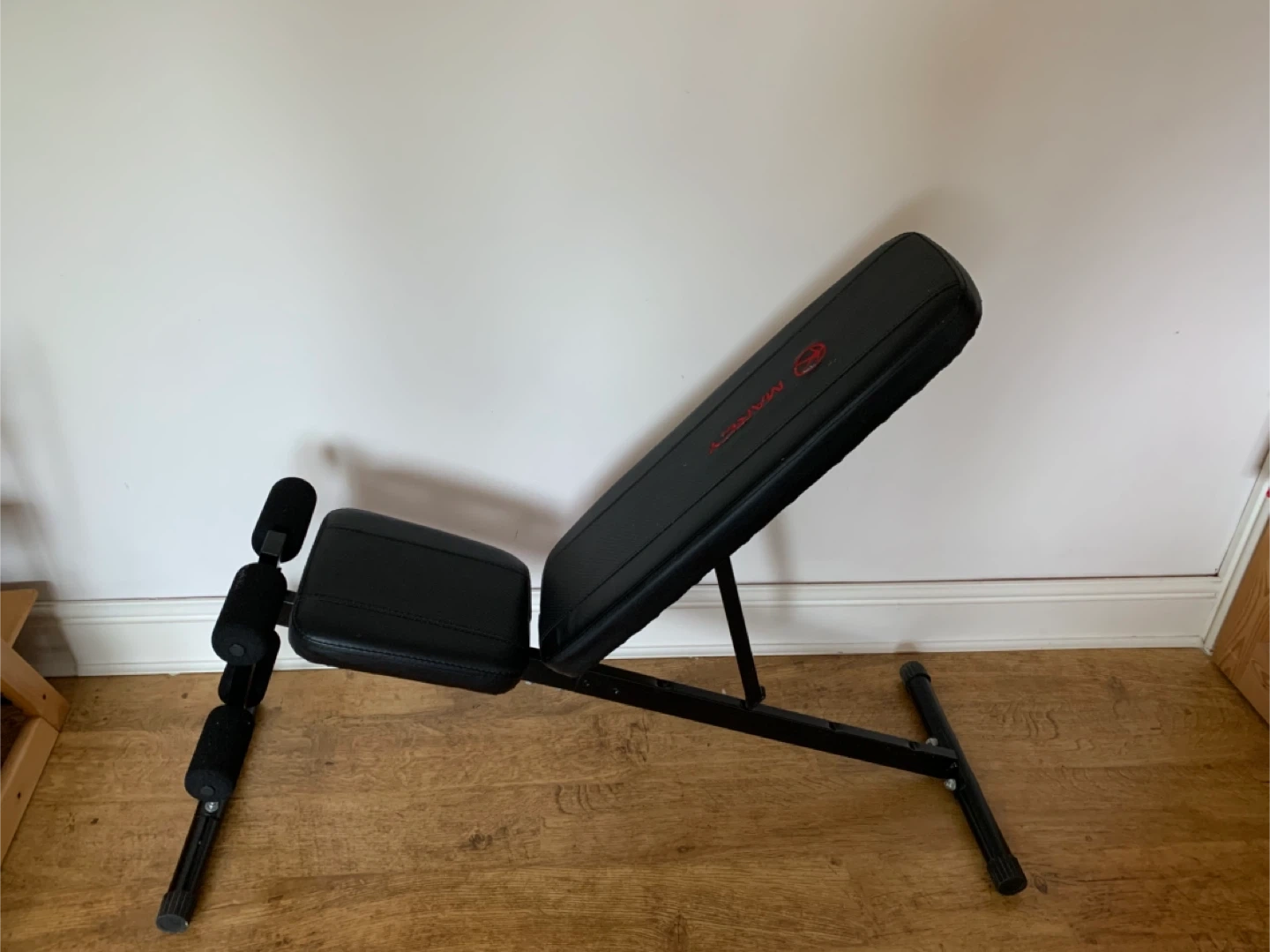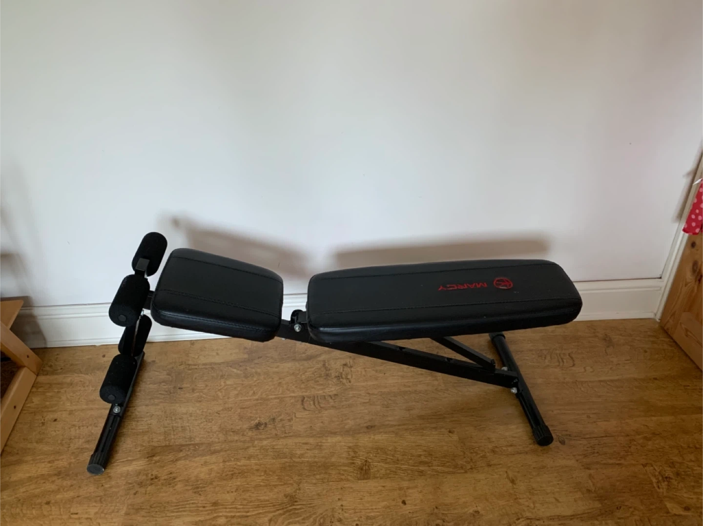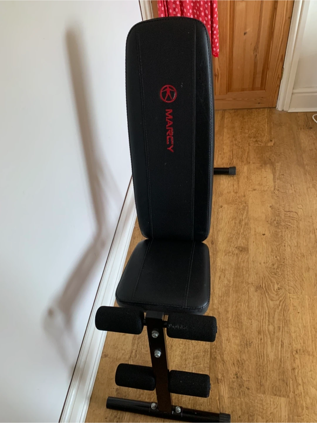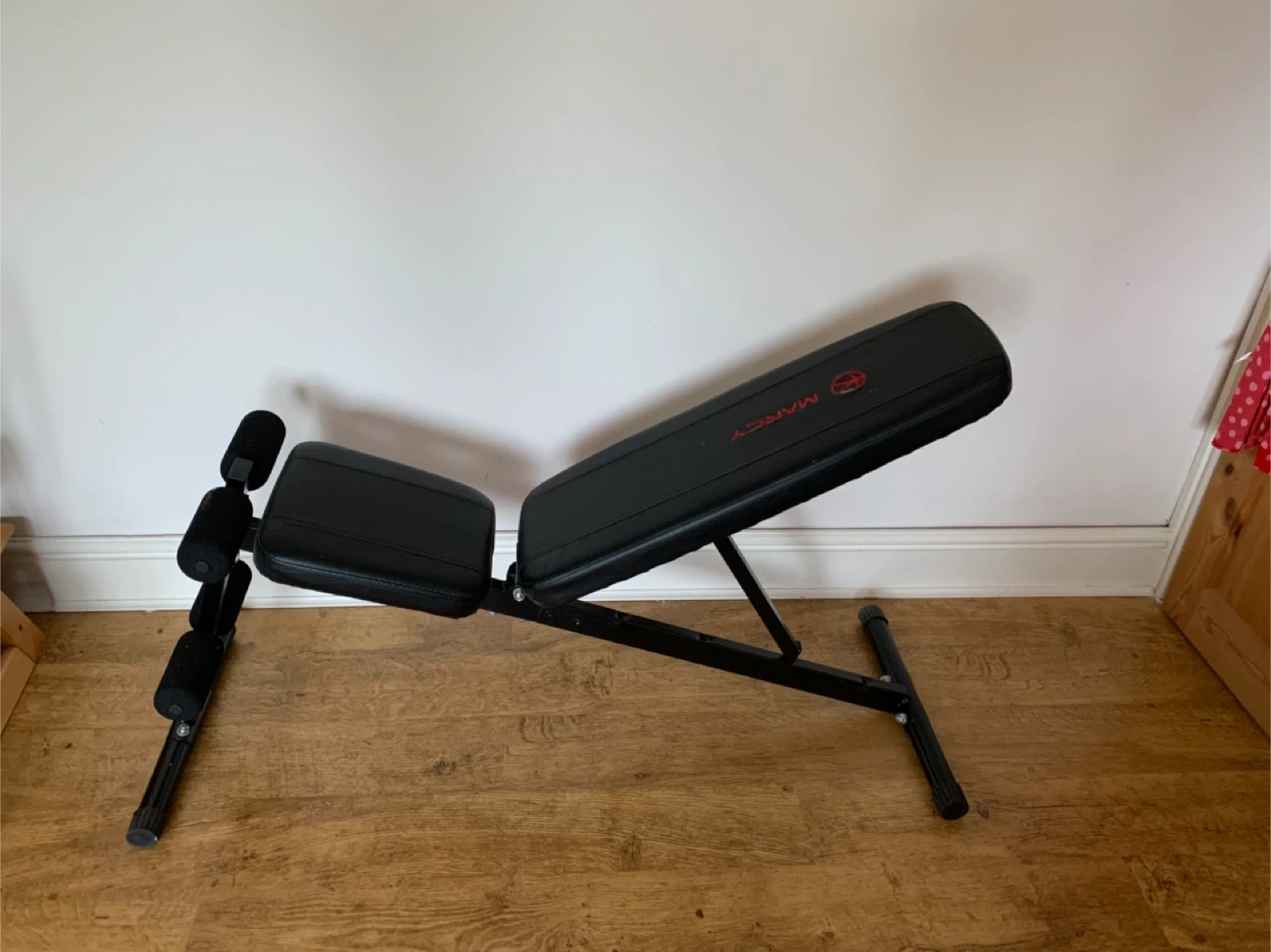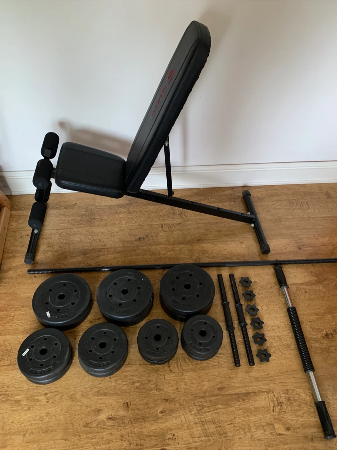 0 reviewsAdjustable weight bench with weights, all in great condition. Comes with a pair of dumbell bars, barbell bar, 6x spinlock collars, and a chest expander bar. Total weights is 47.5kg: 6x5kg 4x2.5kg 6x1.25kg Collection only from B73.