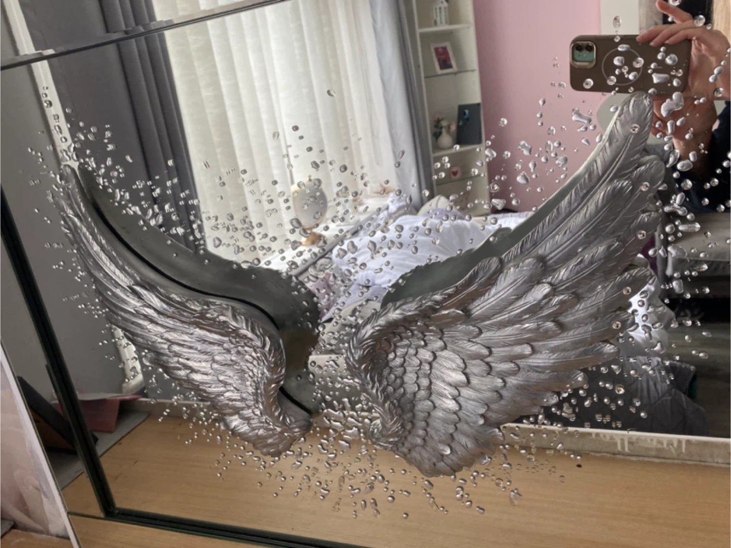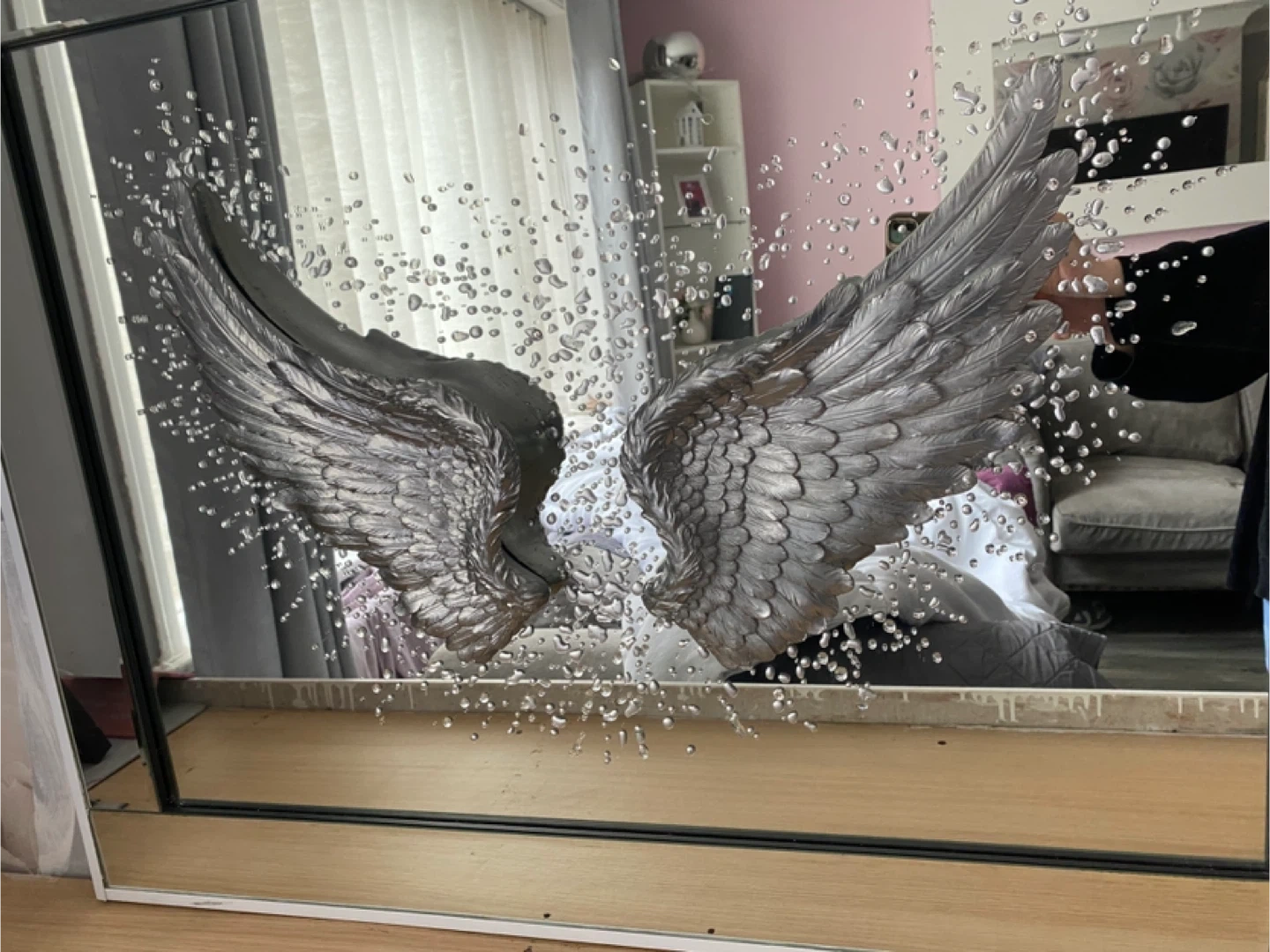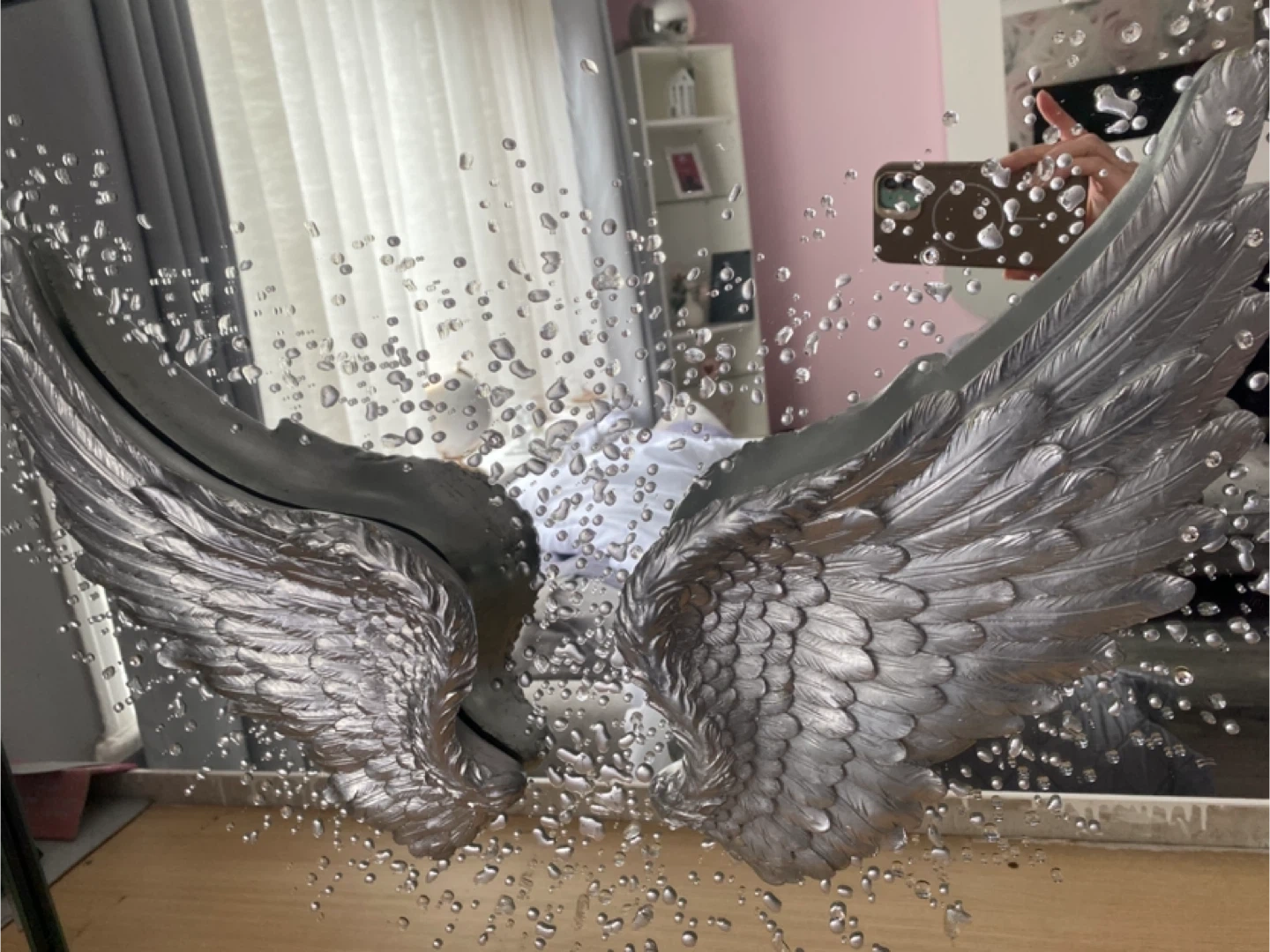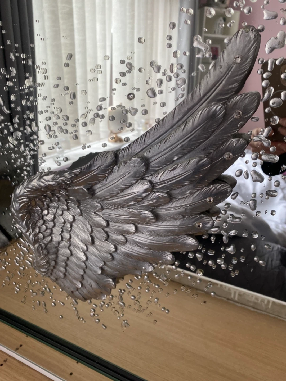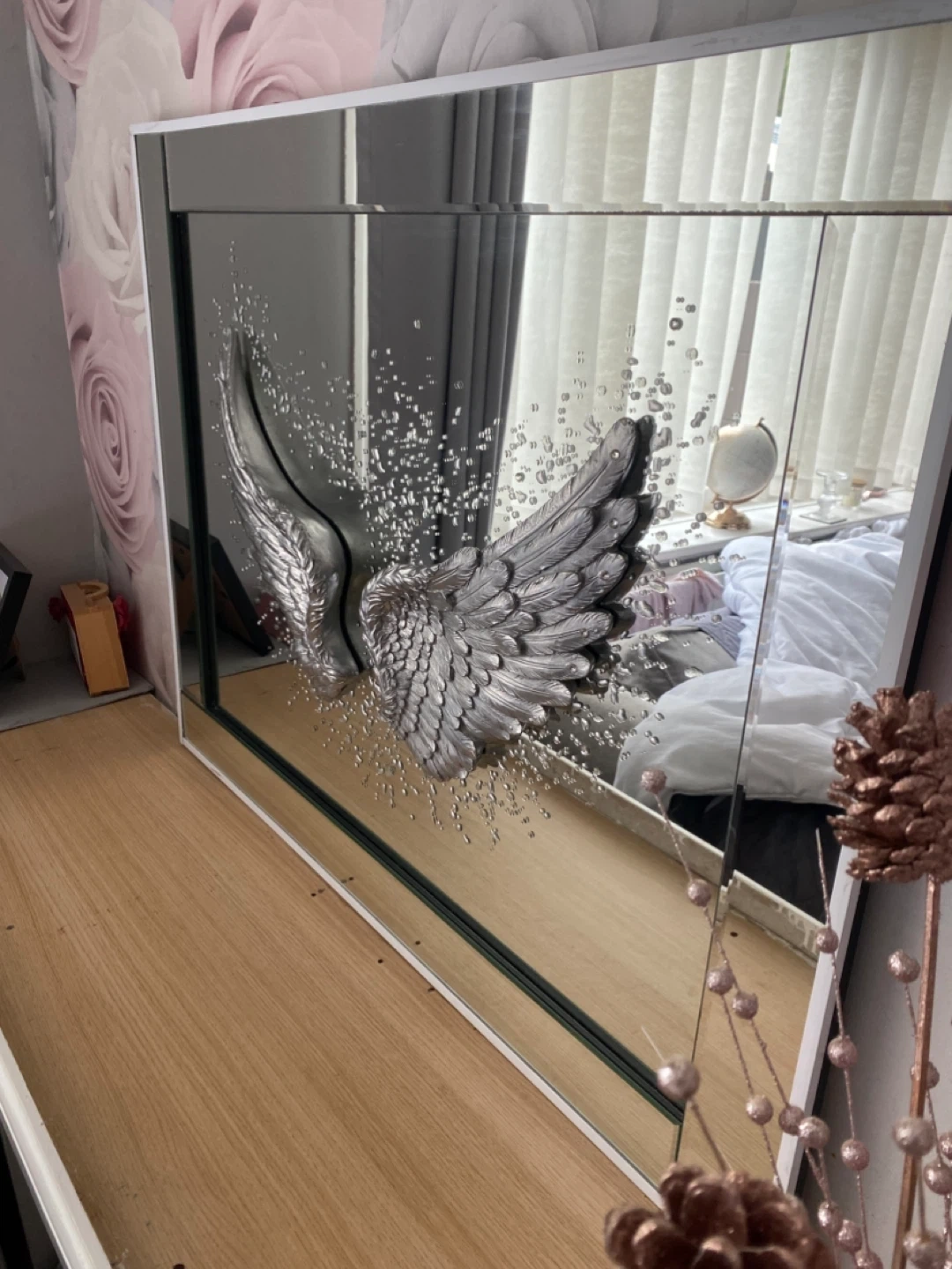 5 reviewsSelling a lovely angel wing mirror. It's a real statement piece and would look great in any room. The mirror features detailed silver angel wings with water droplet effect. It's in great condition and ready for a new home 38 inches wide 30 length