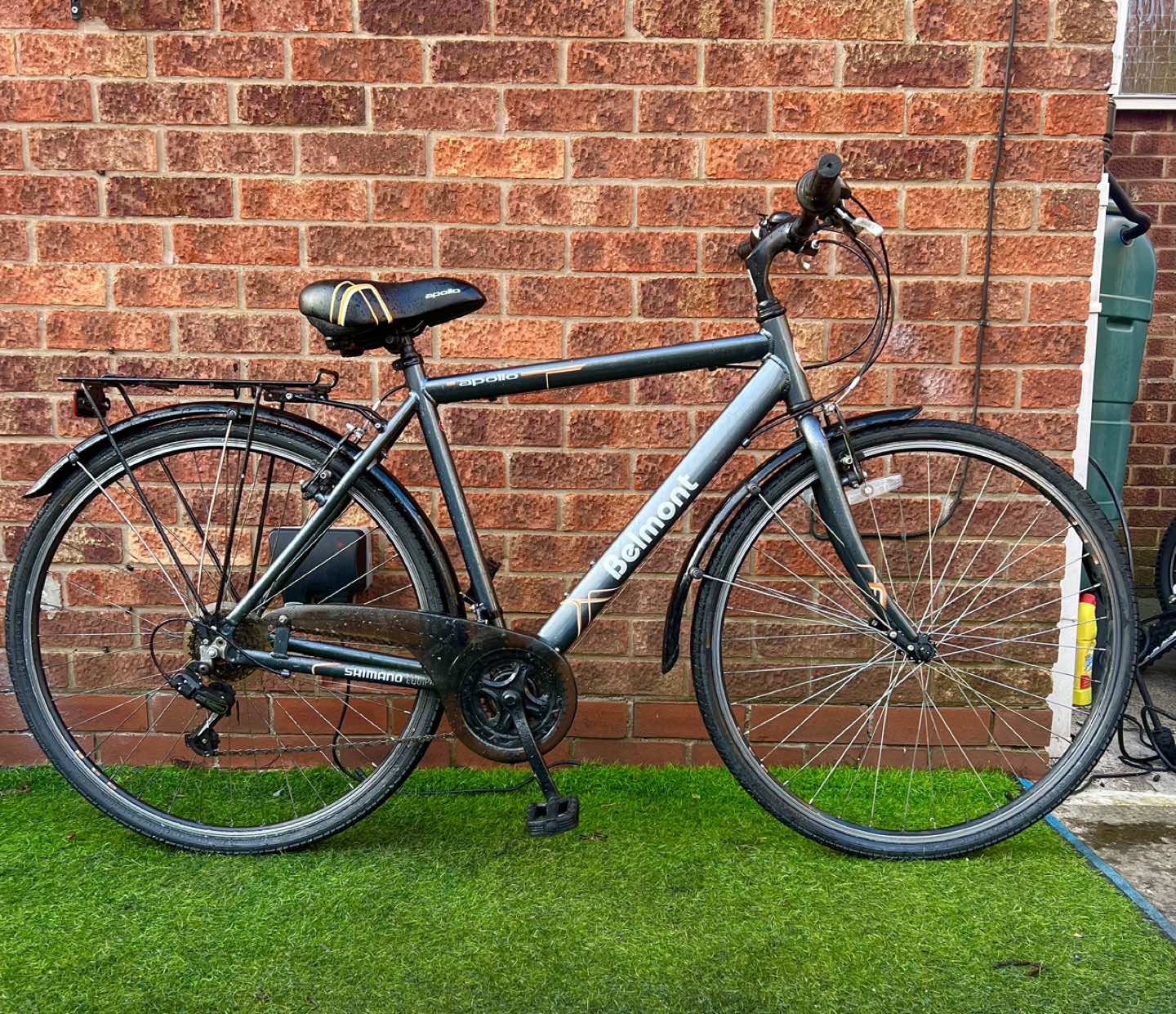 8 reviewsAPOLLO BELMONT MENS HYBRID BIKE, fully working and fantastic condition! £75 REALLY SOLID WELL MADE BIKE! Please ask for more pics ❗️28” 700 WHEELS - REALLY GOOD TYRES ❗️18 SPEED - SHIMANO REVOSHIFT GEARS ❗️21” LARGE FRAME (5ft 10 - 6ft 3) ❗️NEW HANDGRIPS ❗️CHUNKY GEL COMFORT SEAT ❗️FRONT AND REAR MUDGUARDS ❗️CHAIN GUARD ❗️BELL ❗️PANNIER RACK ❗️QUICK RELEASE FRONT WHEEL ❌ 🚴♀️🚴♂️ I HAVE LOTS MORE BIKES FROM SMALL KIDS TO ADULTS, click the link below to my page, I add more bikes every evening 🚴♂️🚴♀️❌ Please ask for link 🖐 like and share my page to follow me and see the bikes as they go on 😄👍 🚴♀️Try before you buy - Sold as seen 🚴