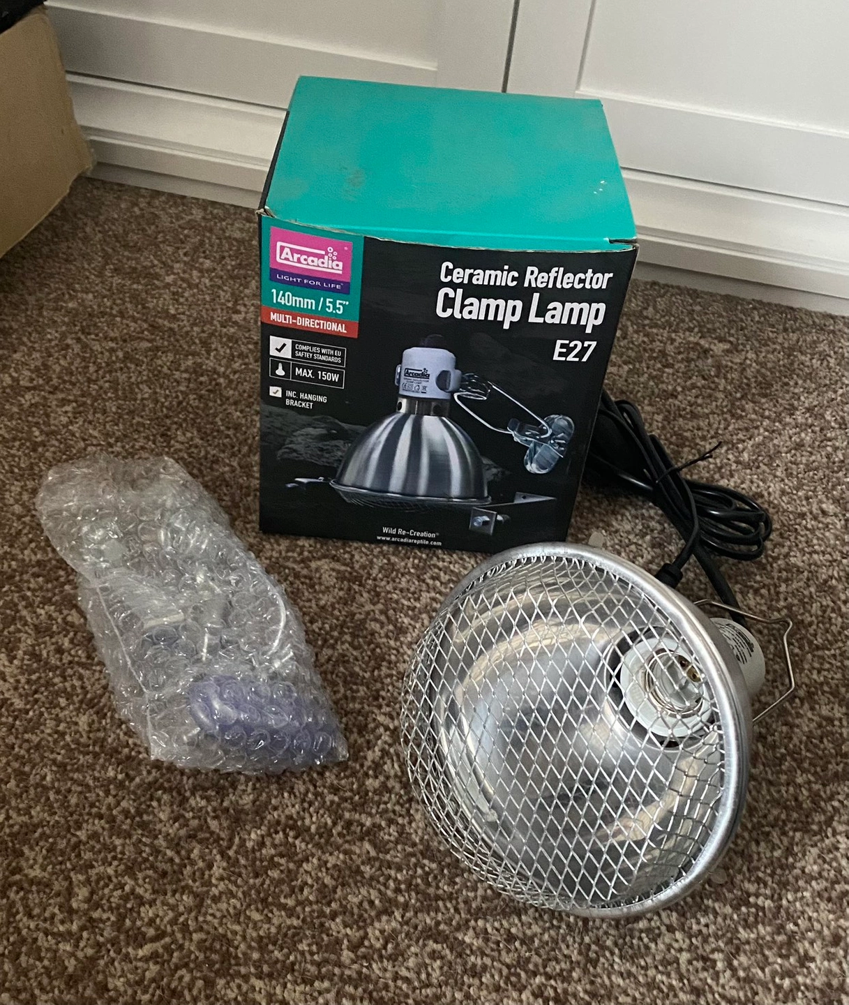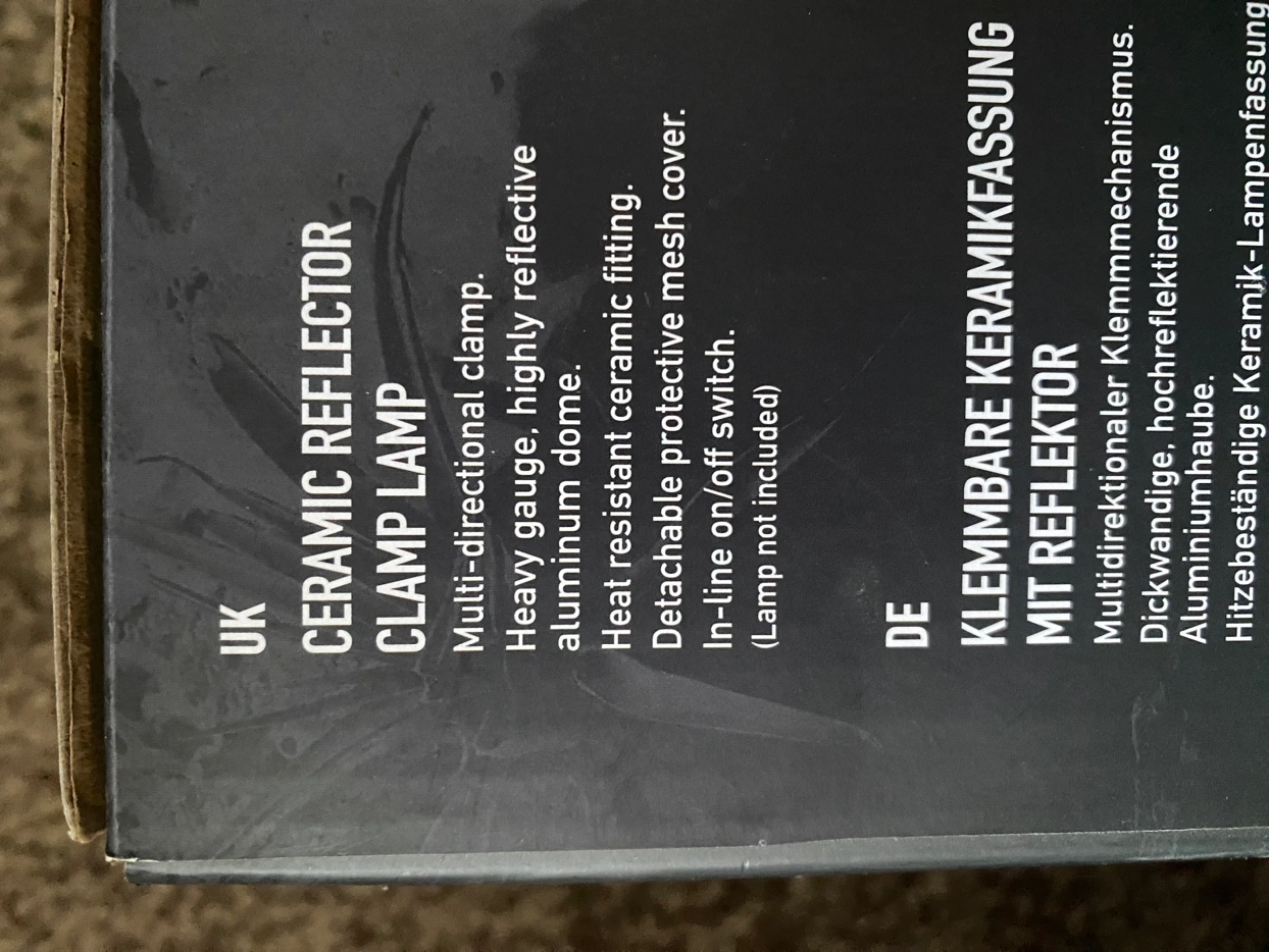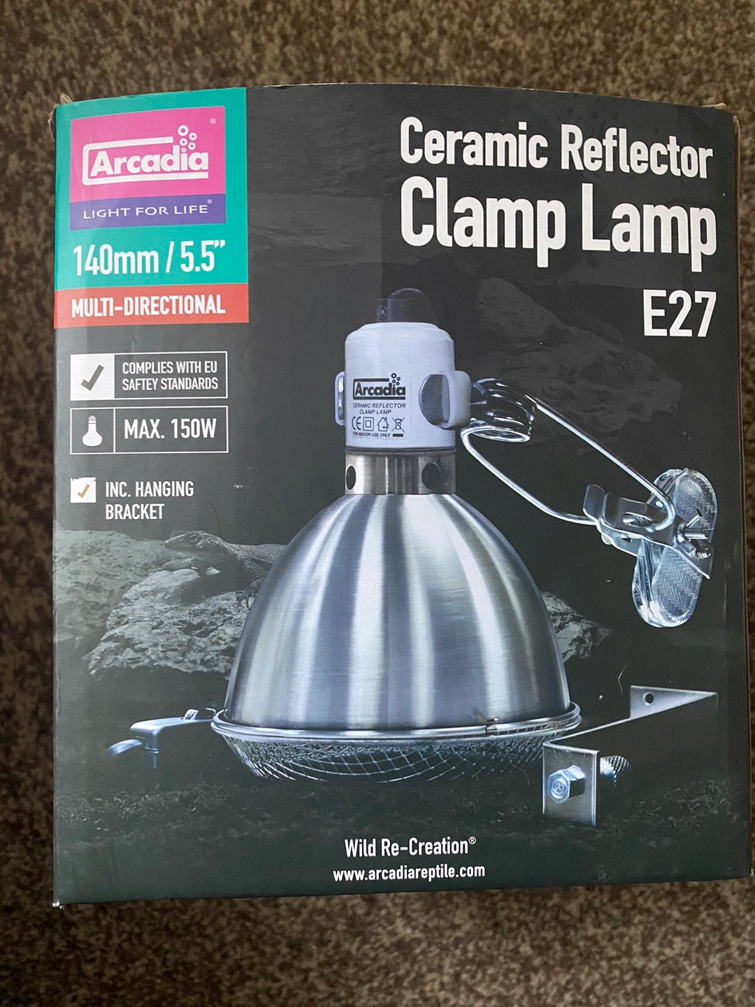 4 reviewsBrand-new in box, Arcadia ceramic heat reflector. This is a ceramic heat dome that can either be hung or it comes with a clamp kit. There is a in-line switch on the cable and removable mesh guard.
