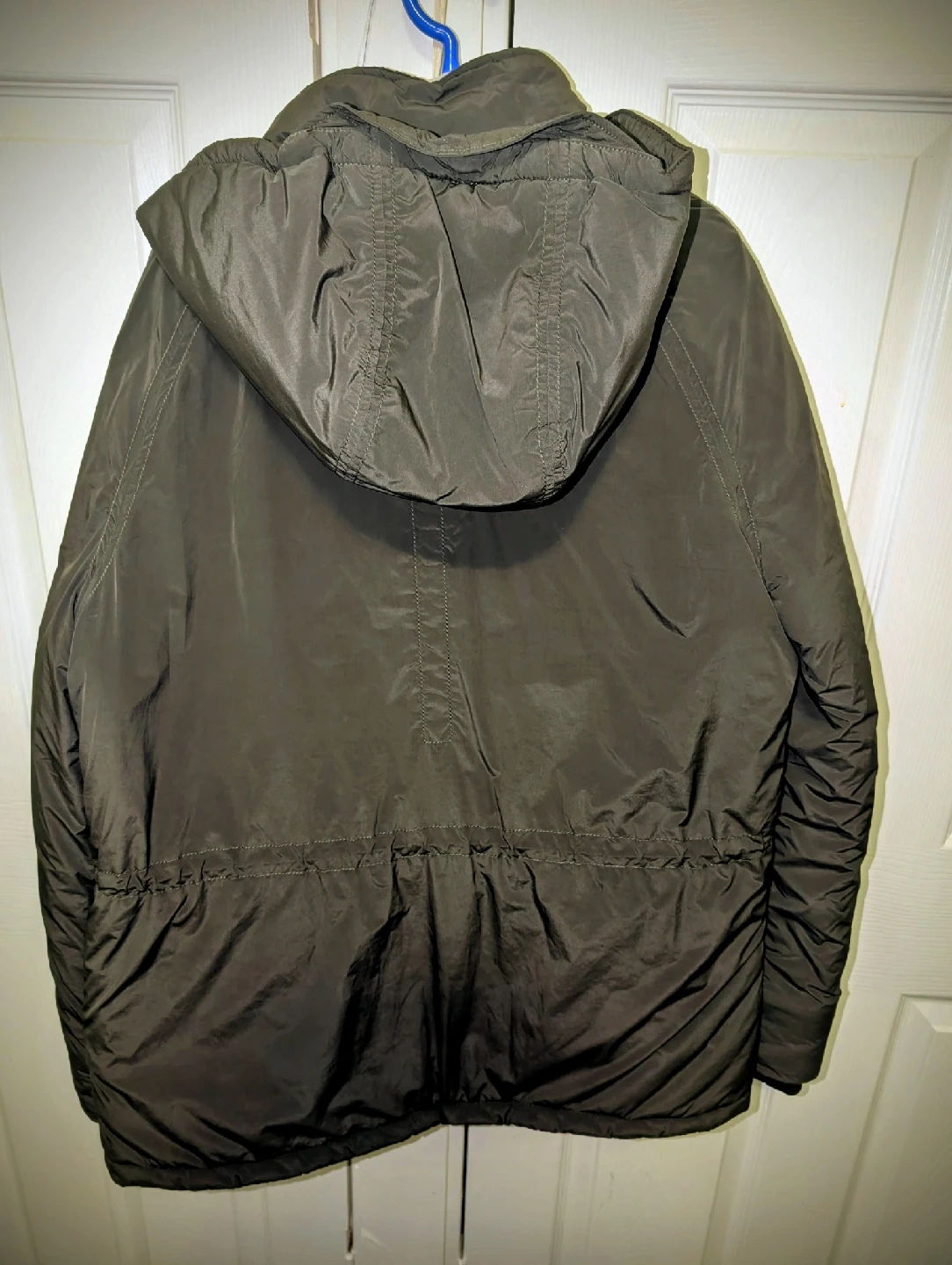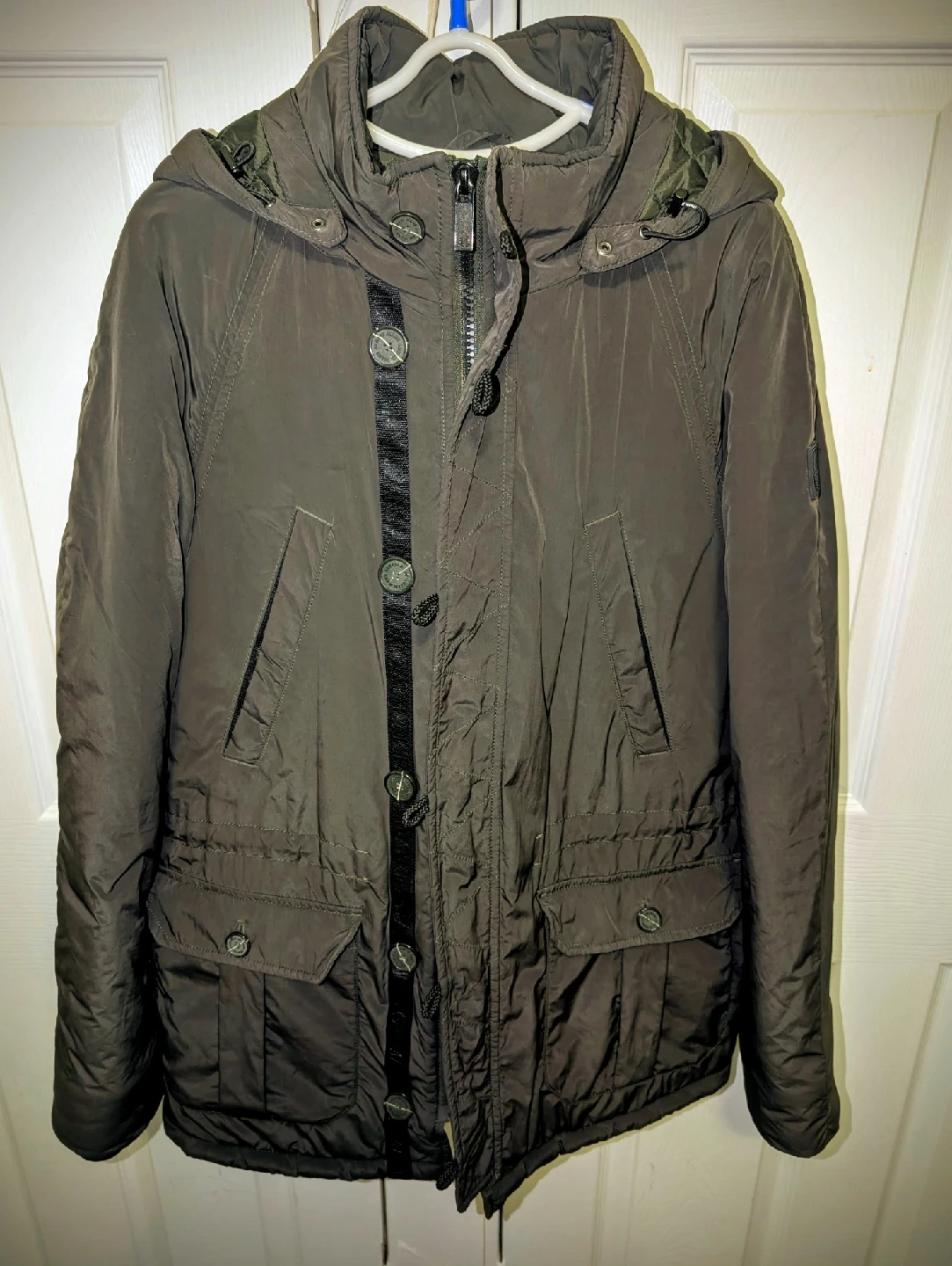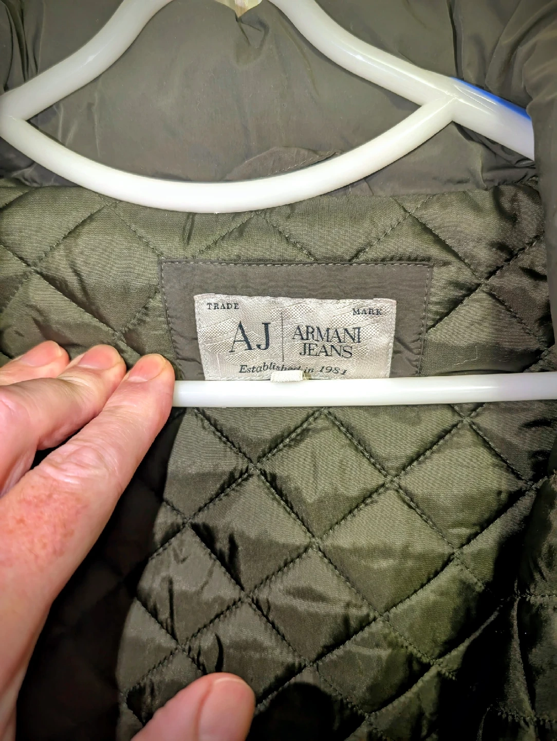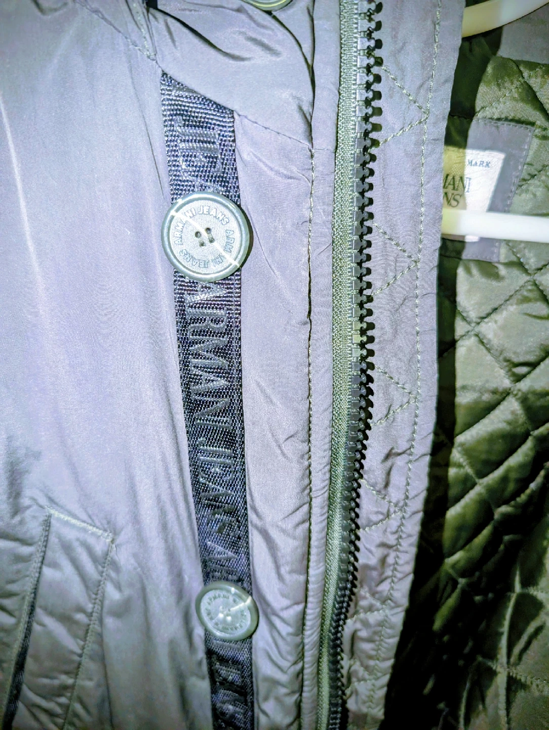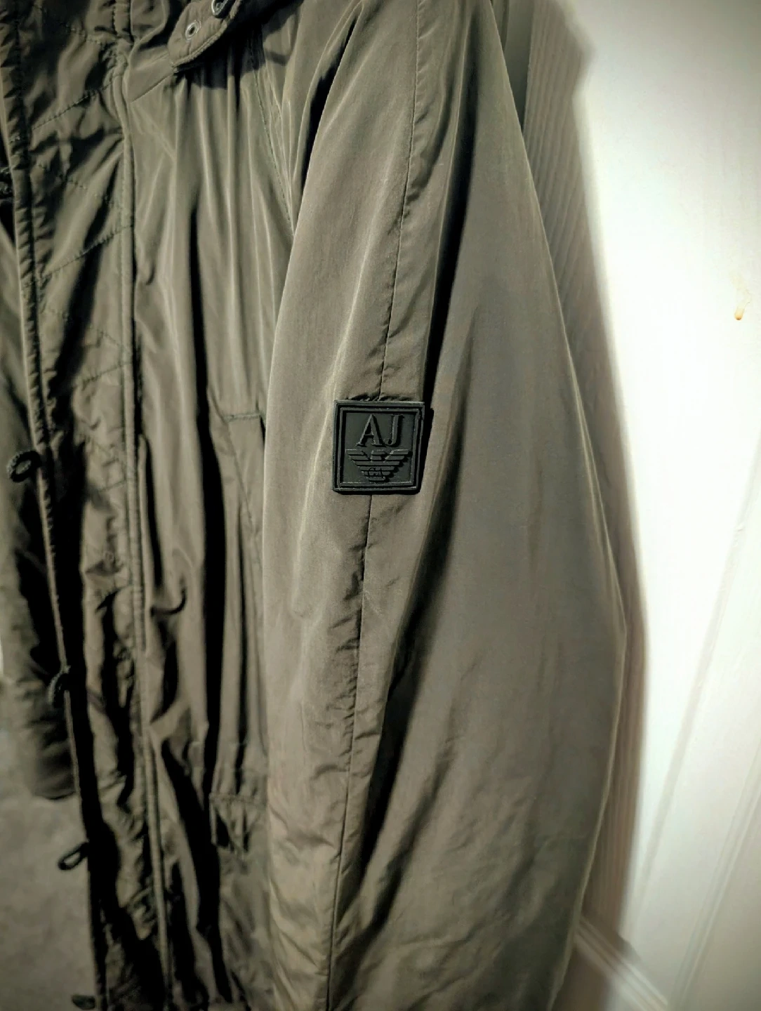 0 reviewsHere's an Armani Jeans jacket in an olive green colour. It's a padded jacket with a hood, perfect for keeping warm. The inside is quilted, adding an extra layer of comfort and style mens xl