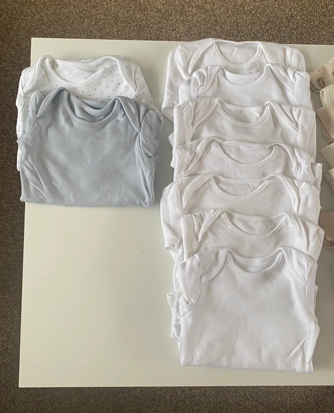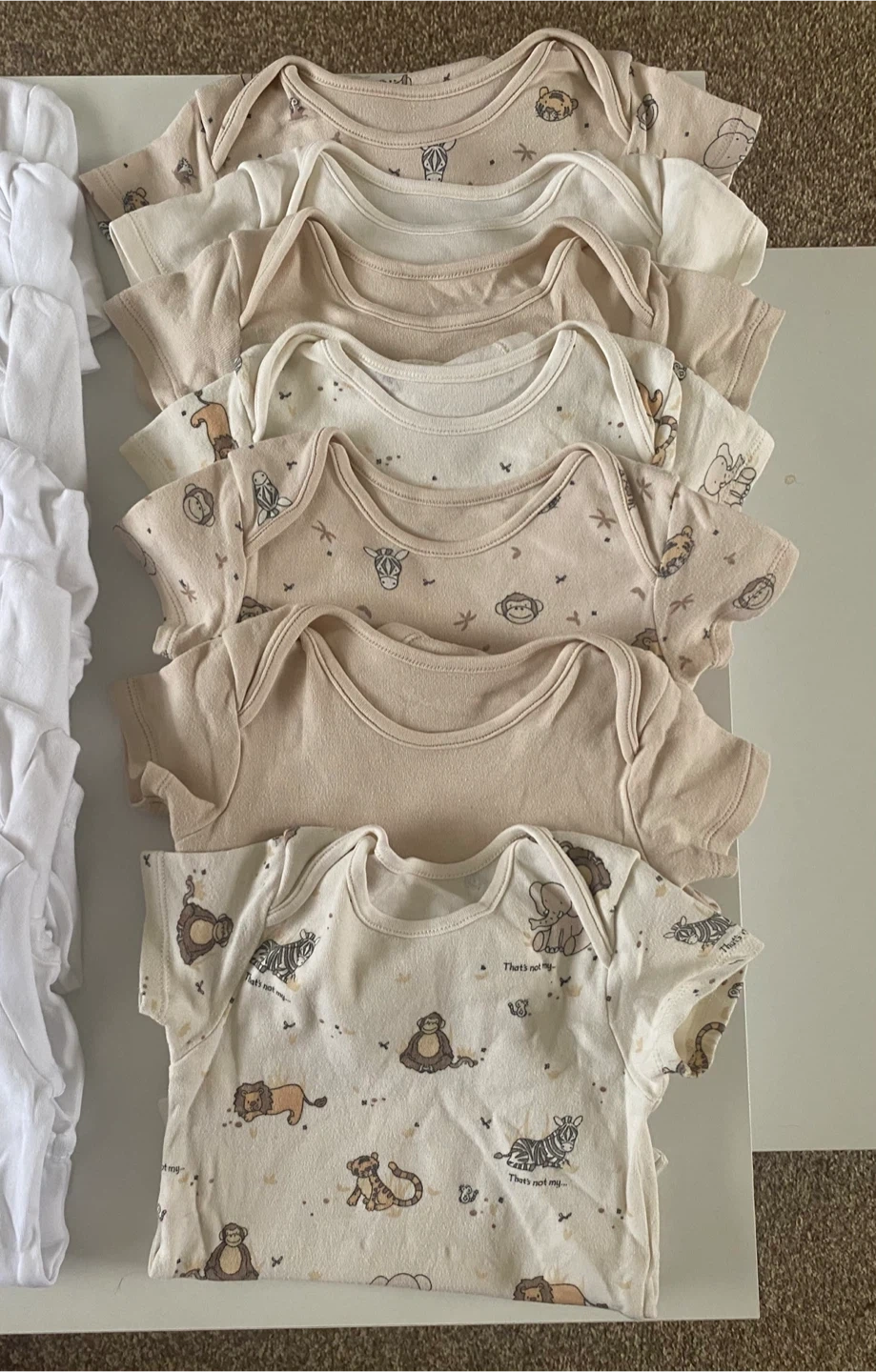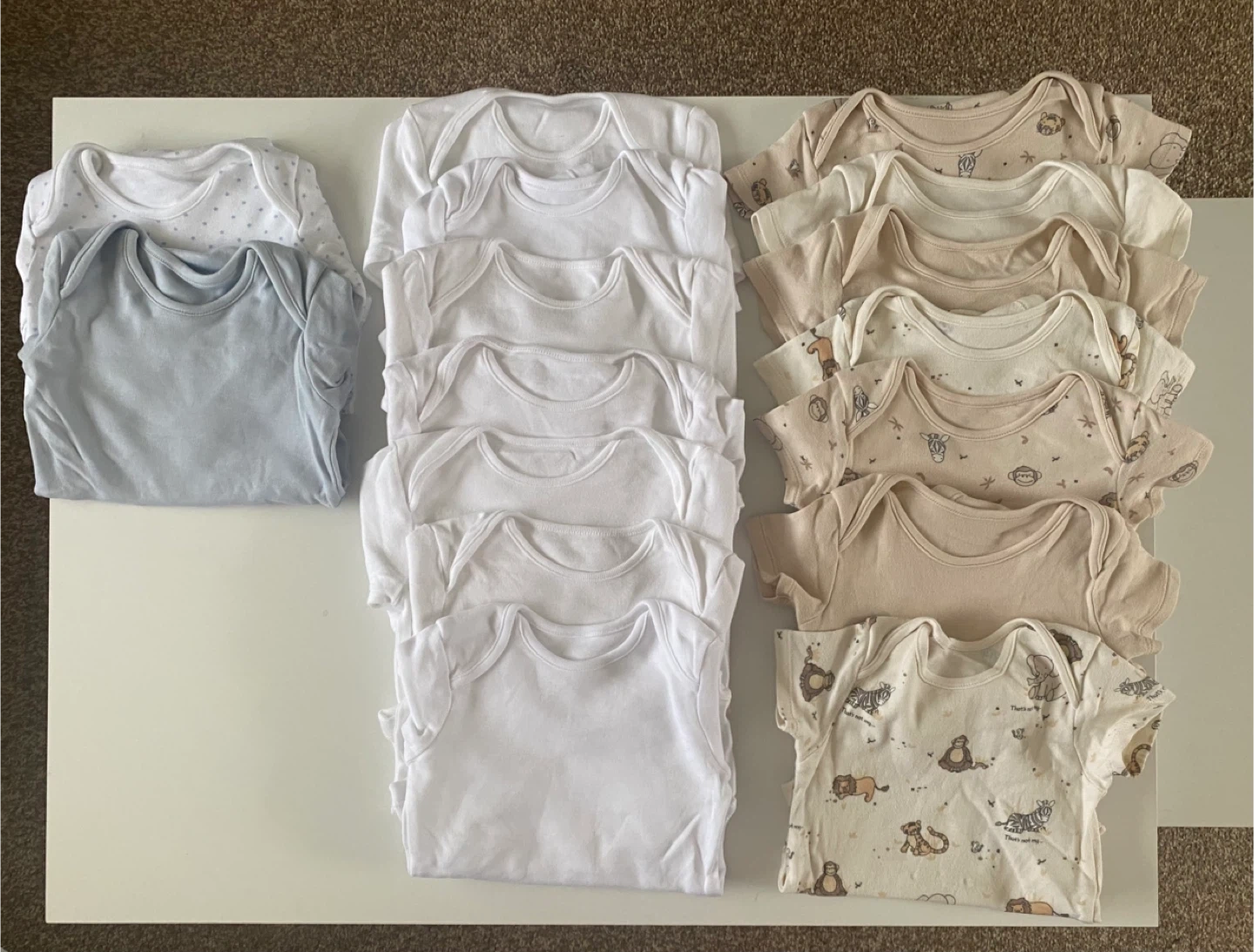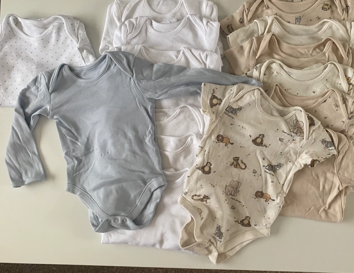 4 reviewsBundle of baby grows all size 12 to 18 months. 7 white and 2 plain ones all have long sleeves, all the beige ones and animal prints have short sleeves. 16 in total.