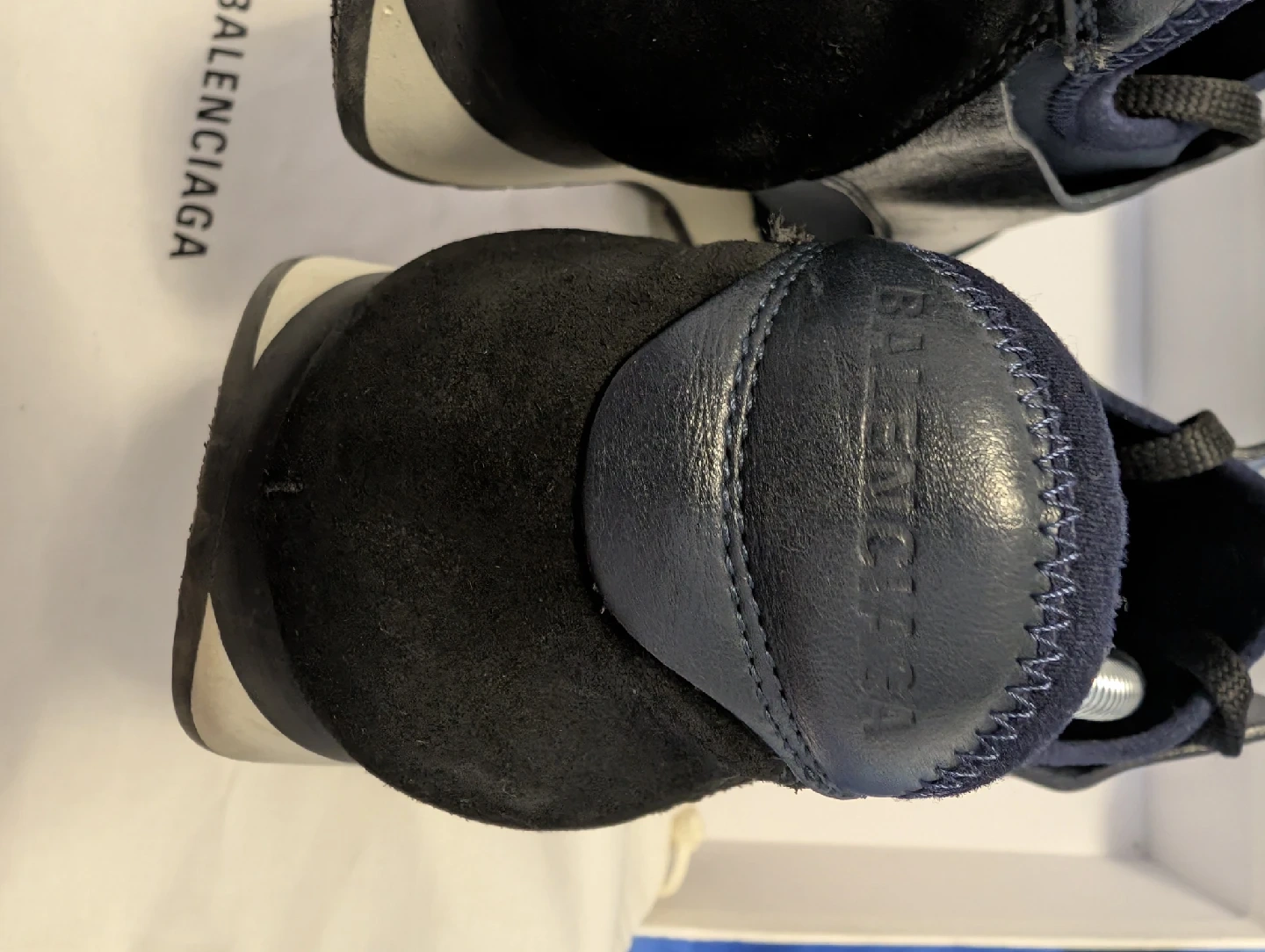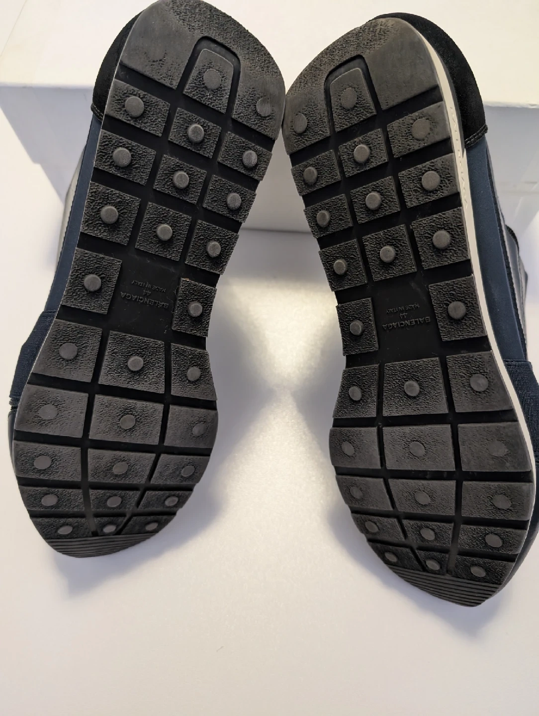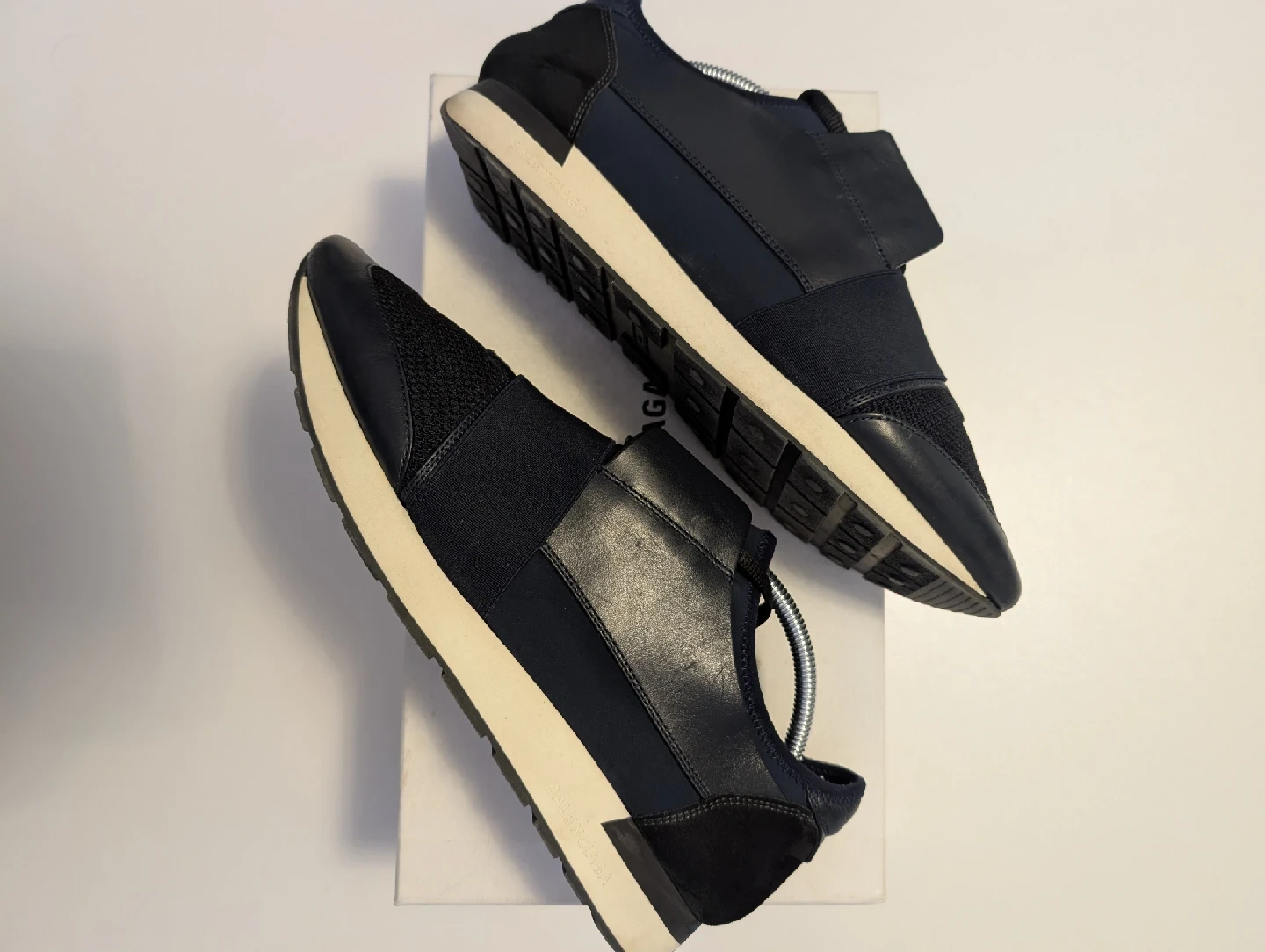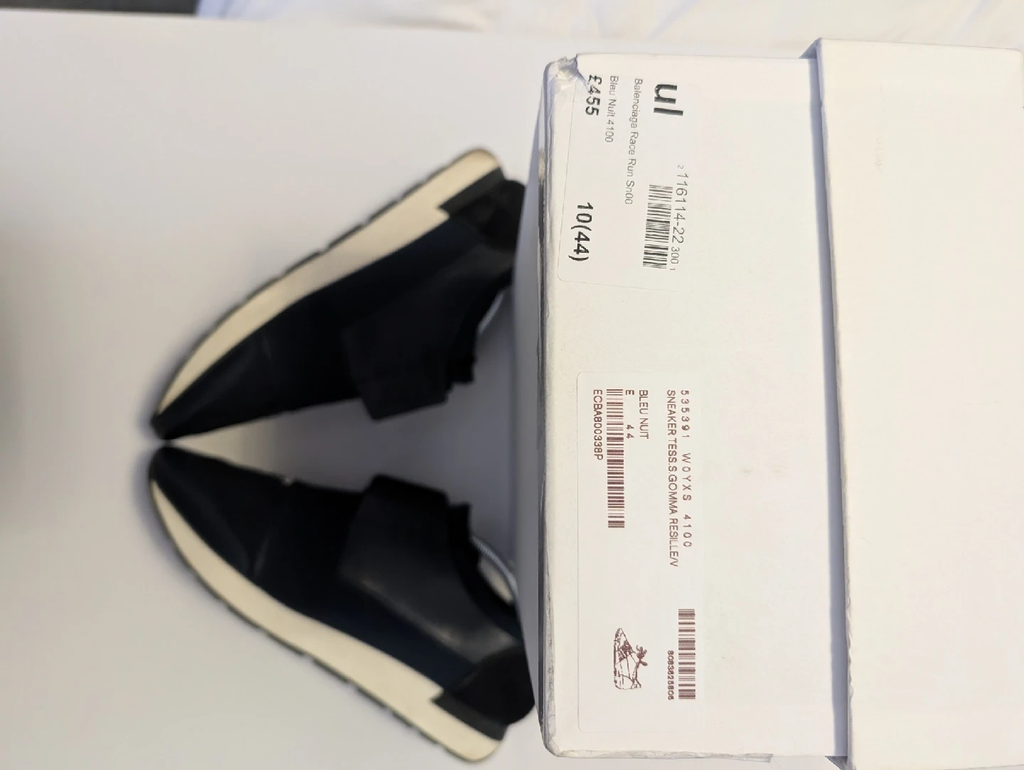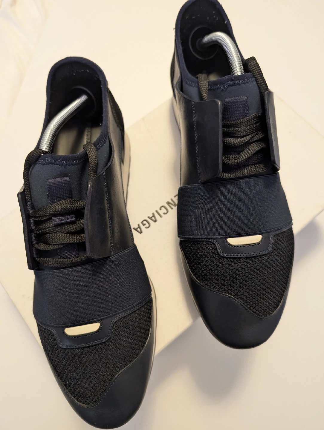 0 reviewsBalenciaga Race Runner trainers in a lovely navy colour. They are a UK size 10 (EU 44). Comes with the original box. Grab a stylish pair of trainers!