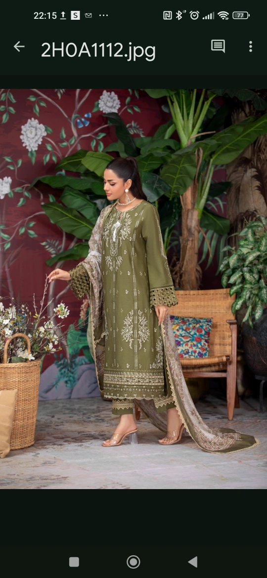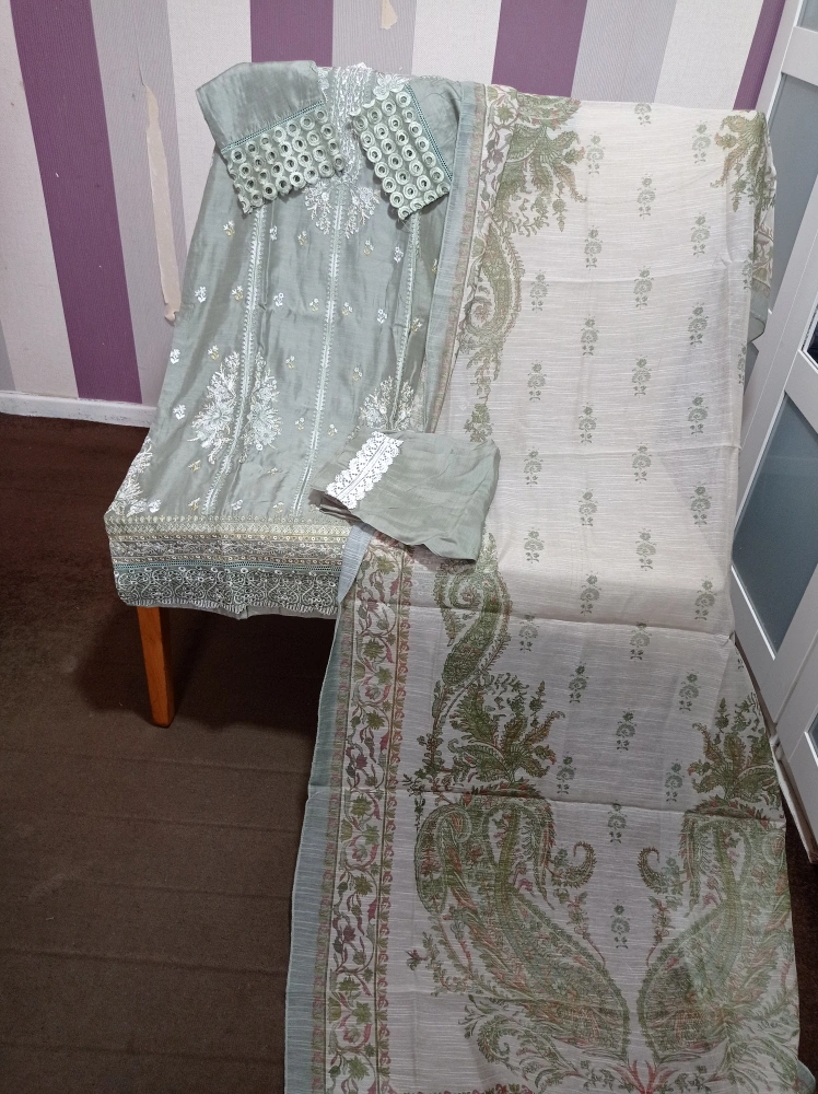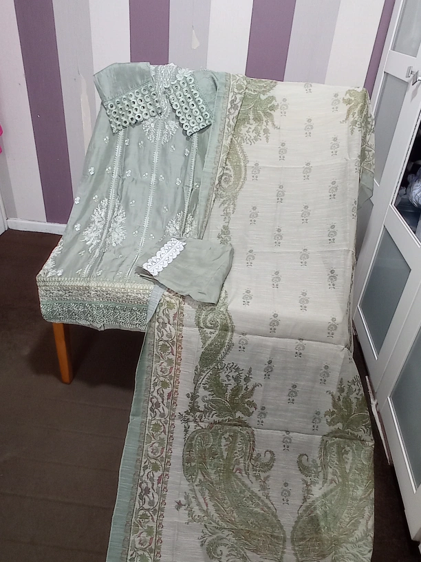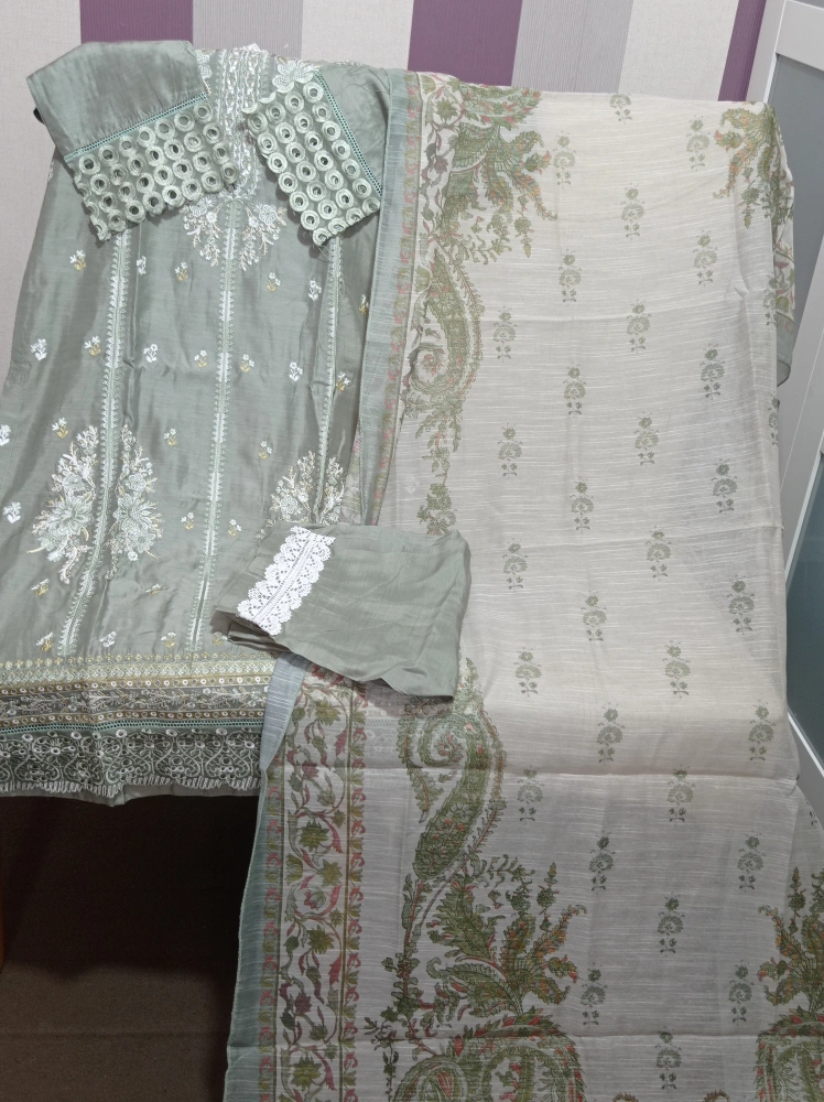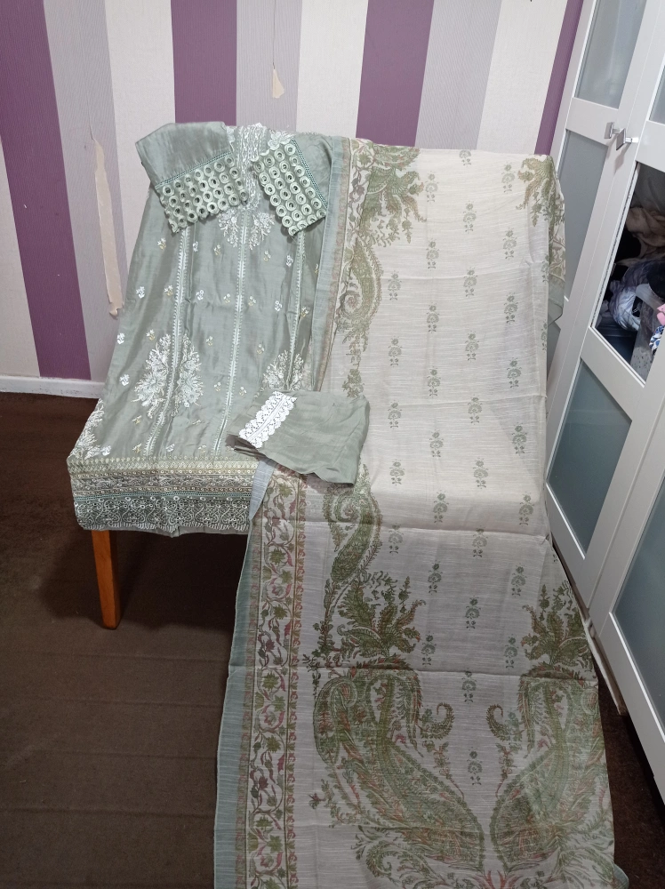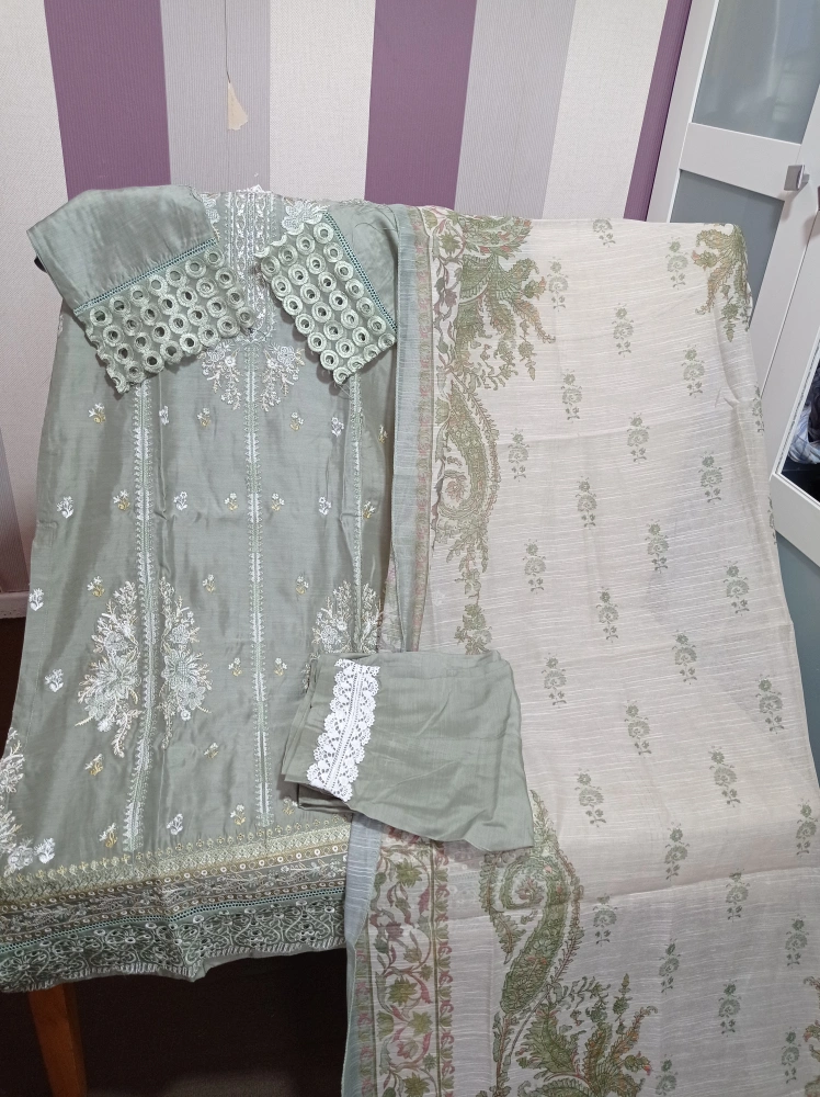 0 reviewsStunning sage green embroidered shalwar kameez. Features intricate detailing and lace accents. Comes with matching dupatta. Elegant and stylish.