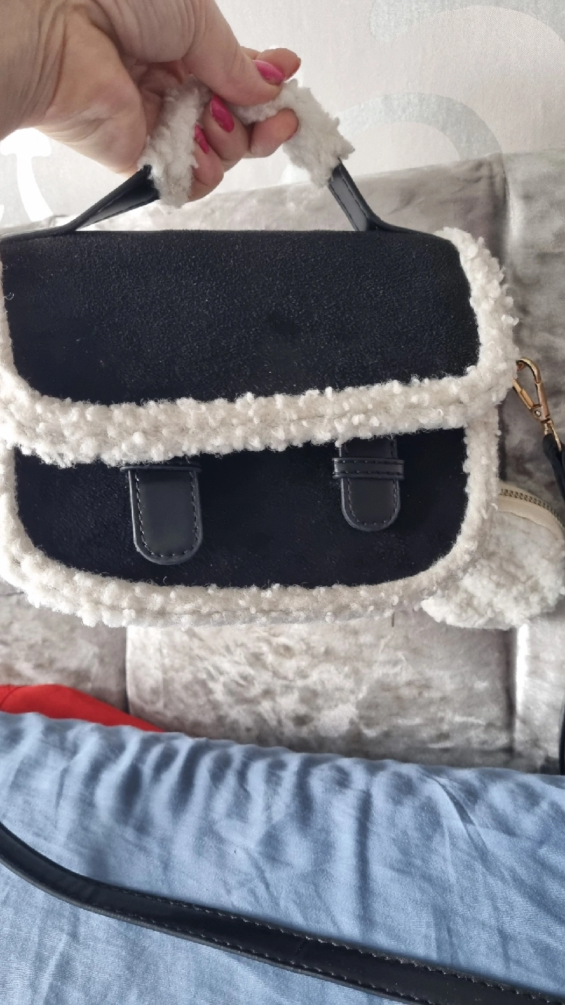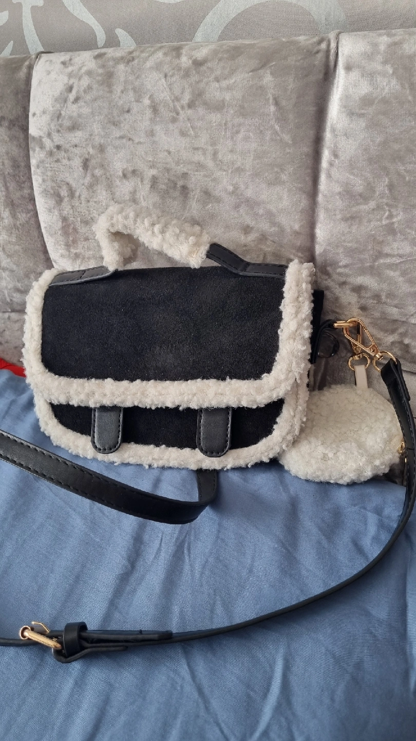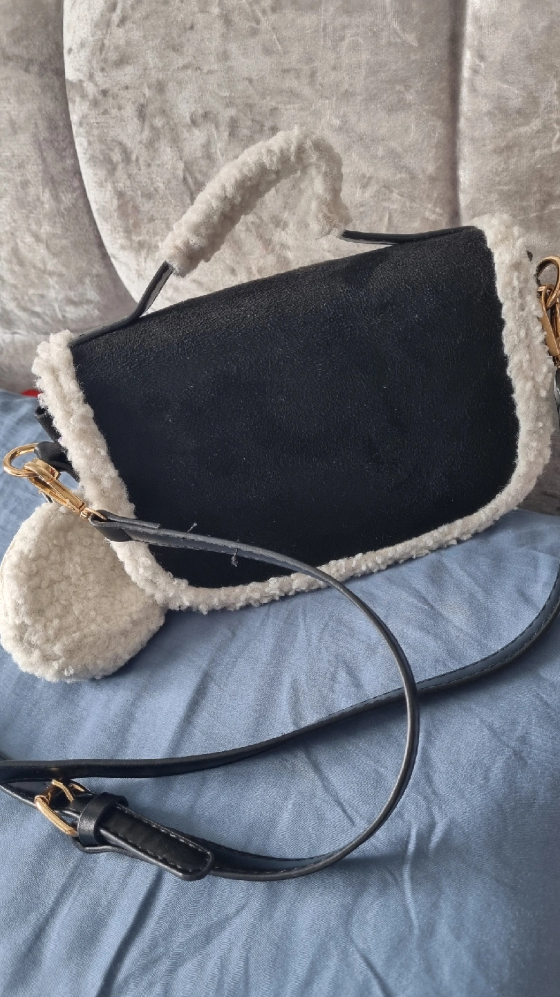 24 reviewsCute crossbody bag with a fluffy cream trim. It's black with a long strap. The bag is in great condition and perfect for everyday use